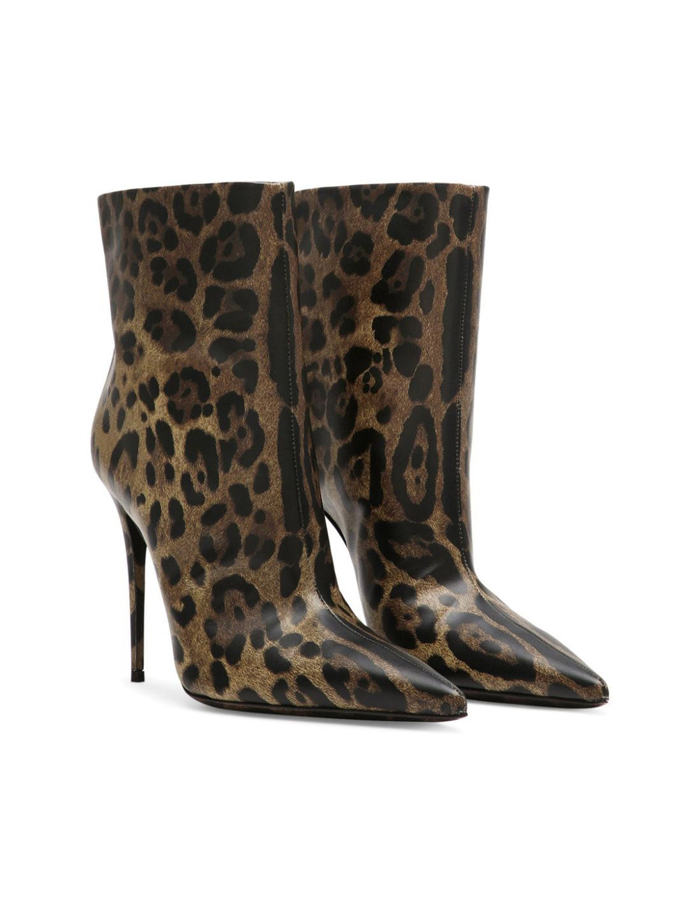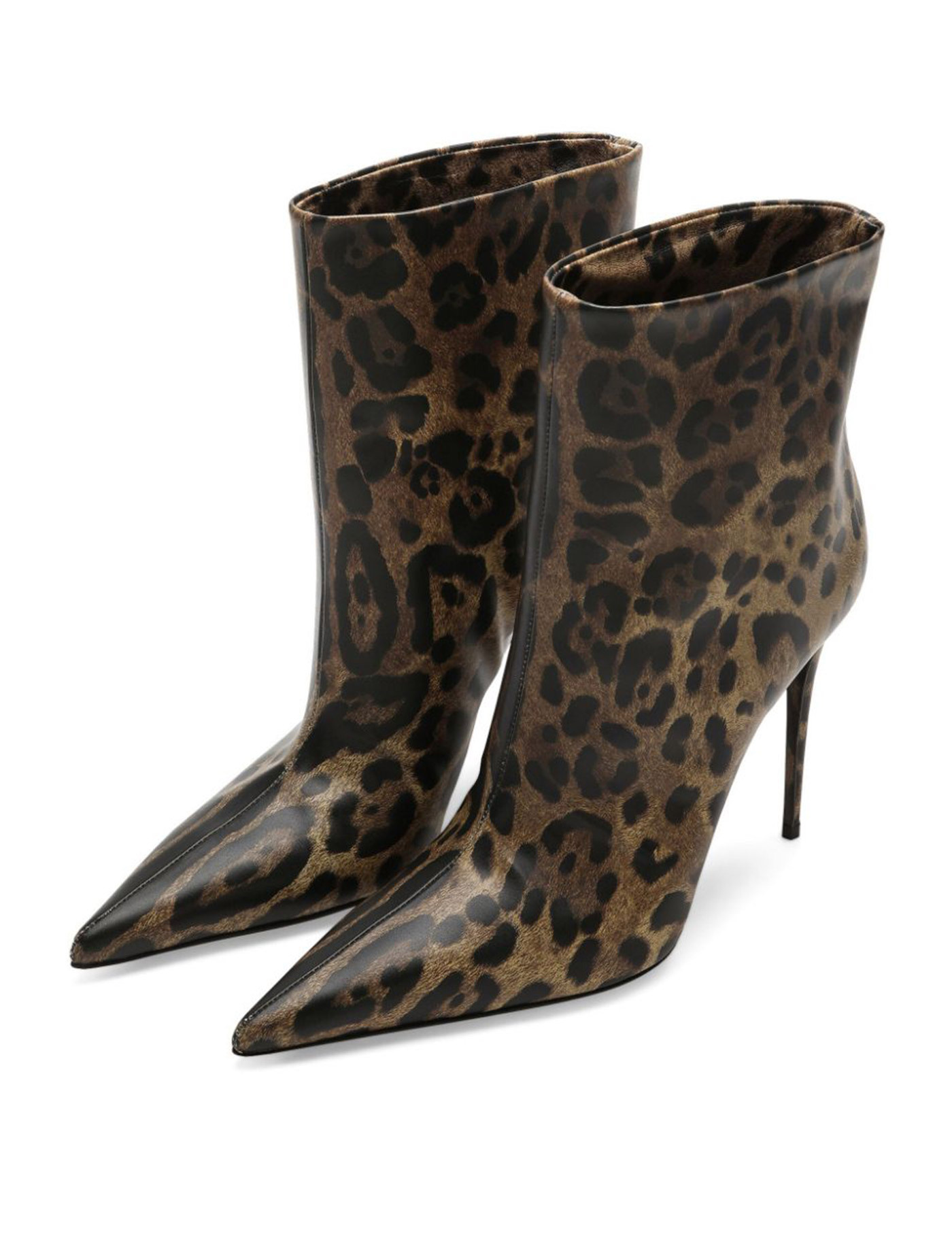 Dolce & Gabbana leo-print glossy leather ankle boots with stiletto heel, pointed toe, leather interior and sole.