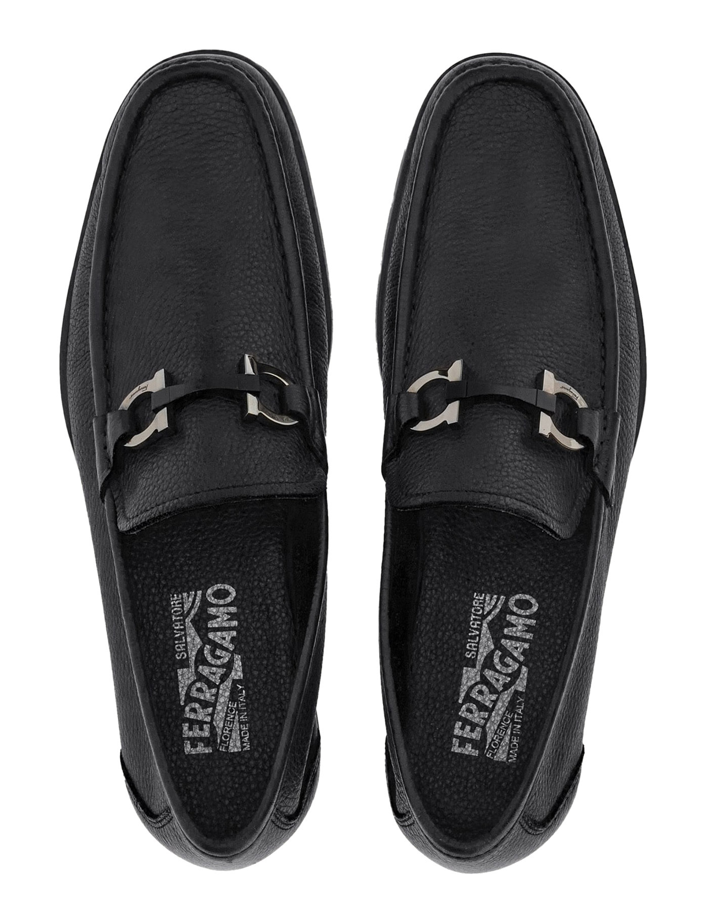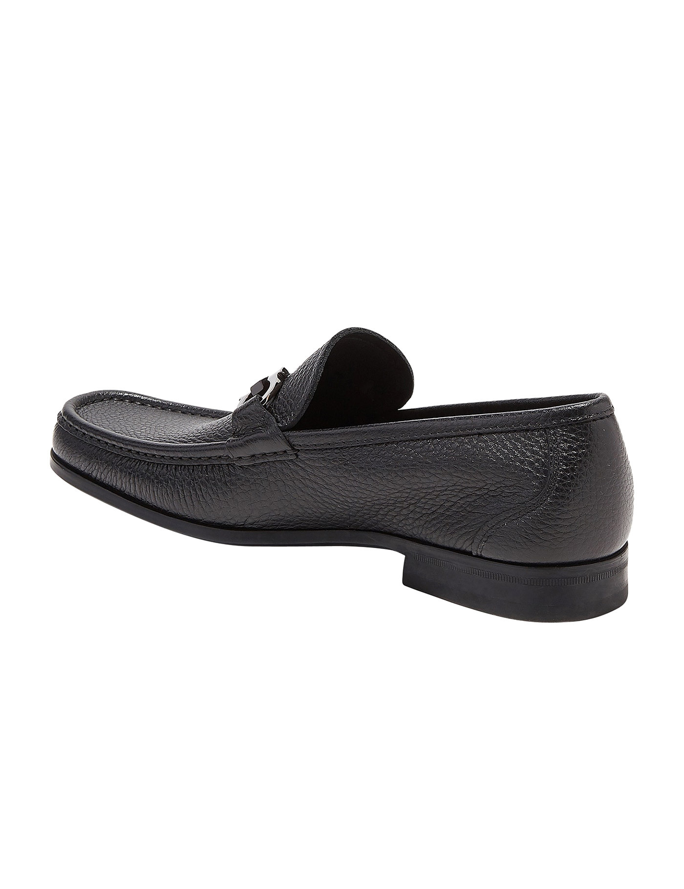 Black leather Gancini-plaque mocassin loafers from Salvatore Ferragamo featuring Gancini plaque, pebbled texture, almond toe, slip-on style and low block heel.