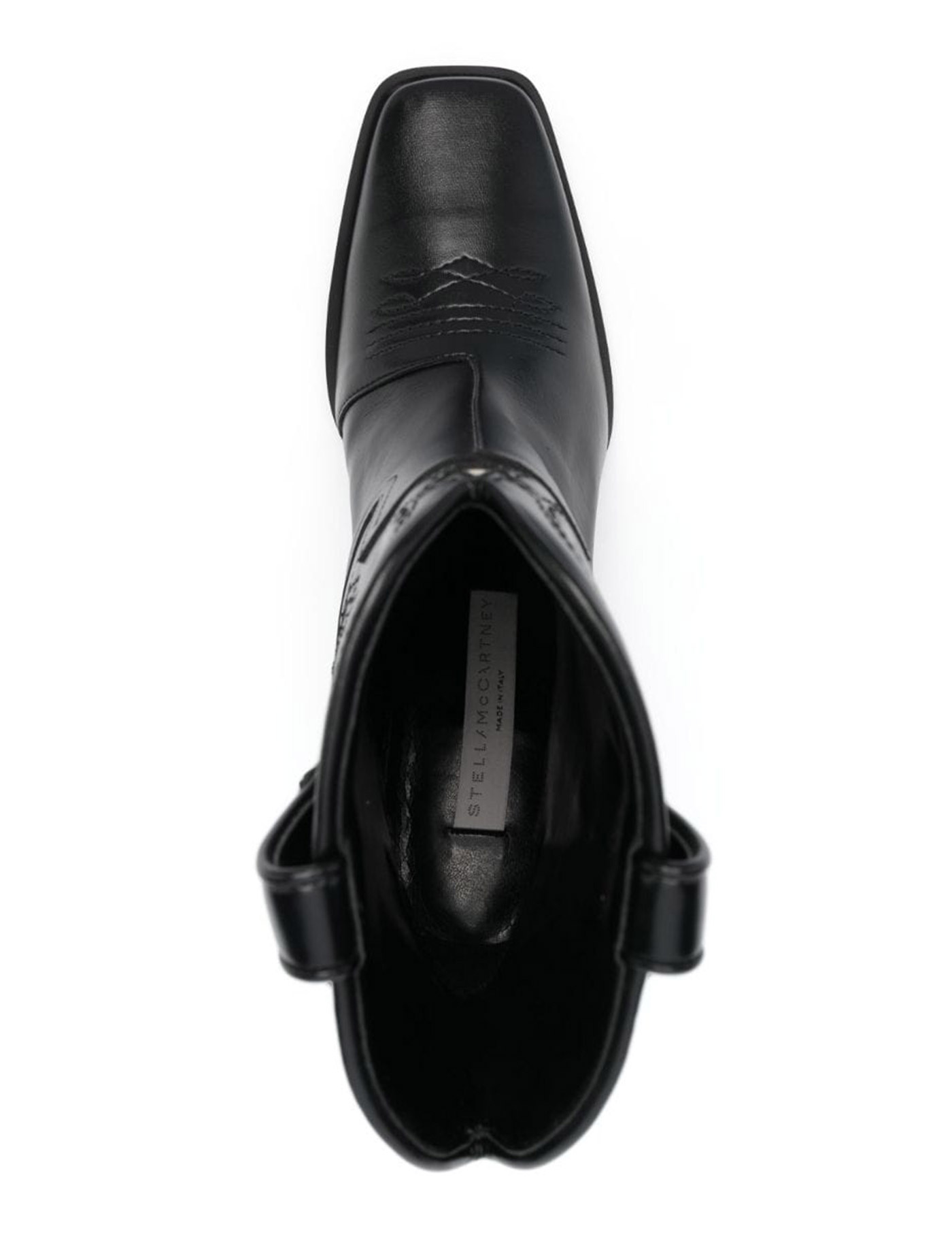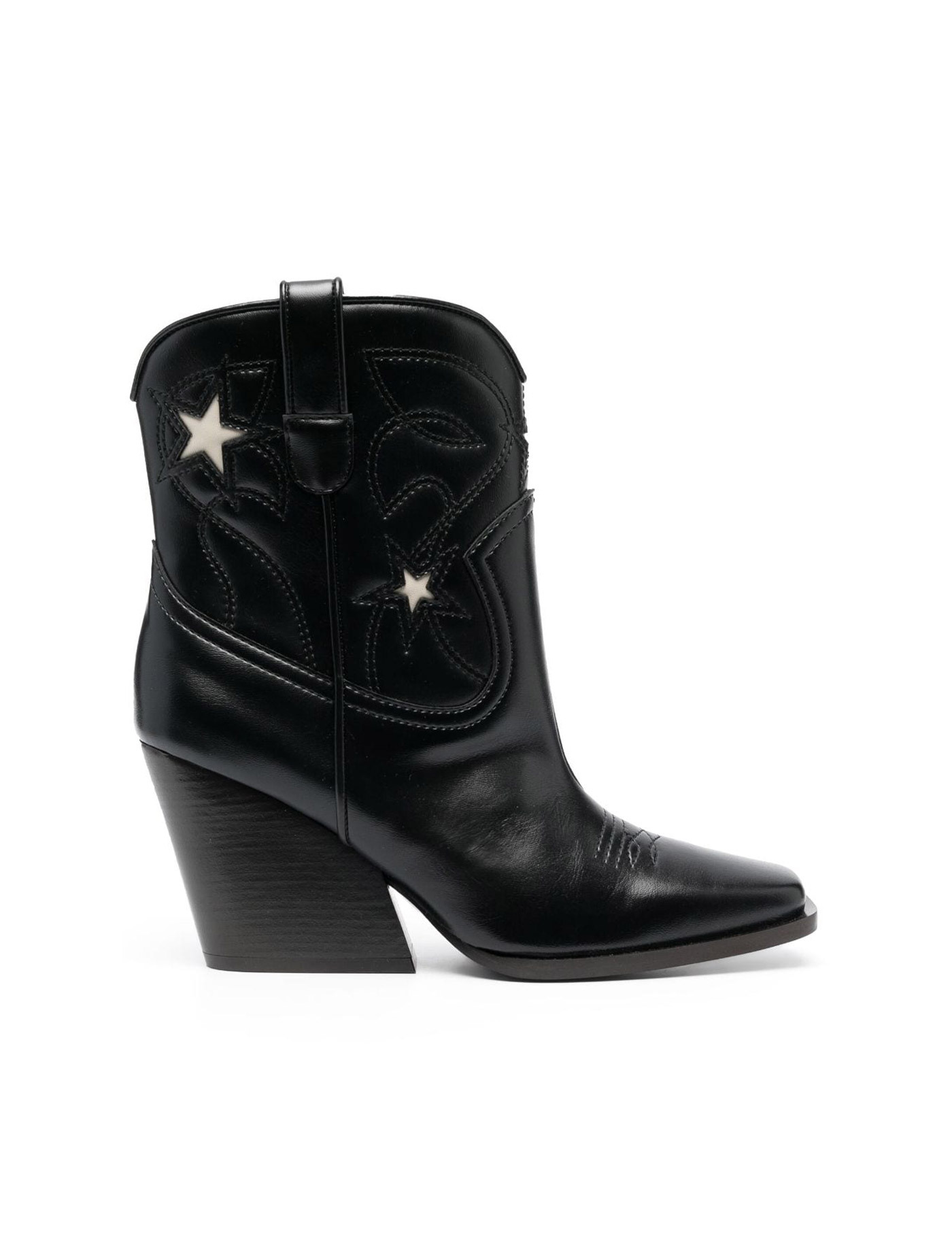 Texan ankle boots by Stella McCartney made of Alter Mat and embellished with Stella embroidery. They feature side pull-tabs, square toe, wide heel. Faux leather lining, eco-friendly leather sole.