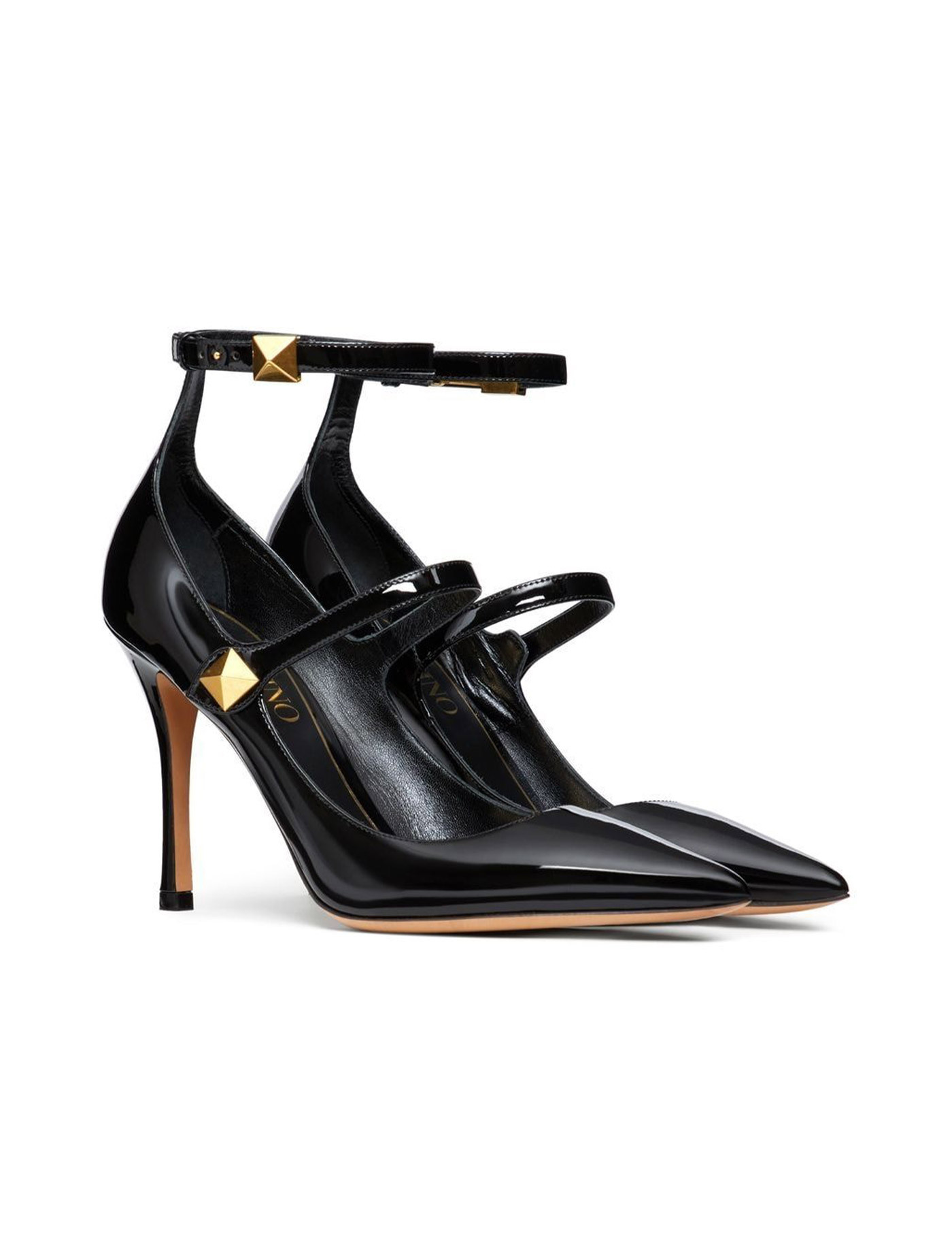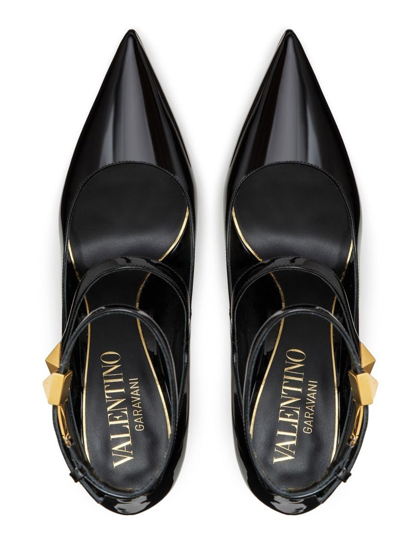 Tiptoe 100mm pumps from VALENTINO GARAVANI featuring black, calf leather, patent finish, signature Roman Stud detailing, pointed toe, buckle-fastening ankle strap, branded heel counter and high stiletto heel.
