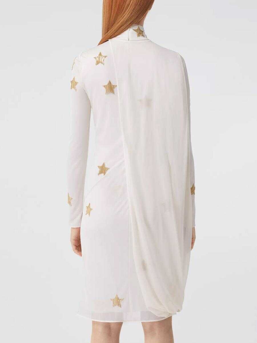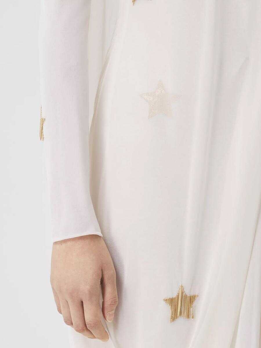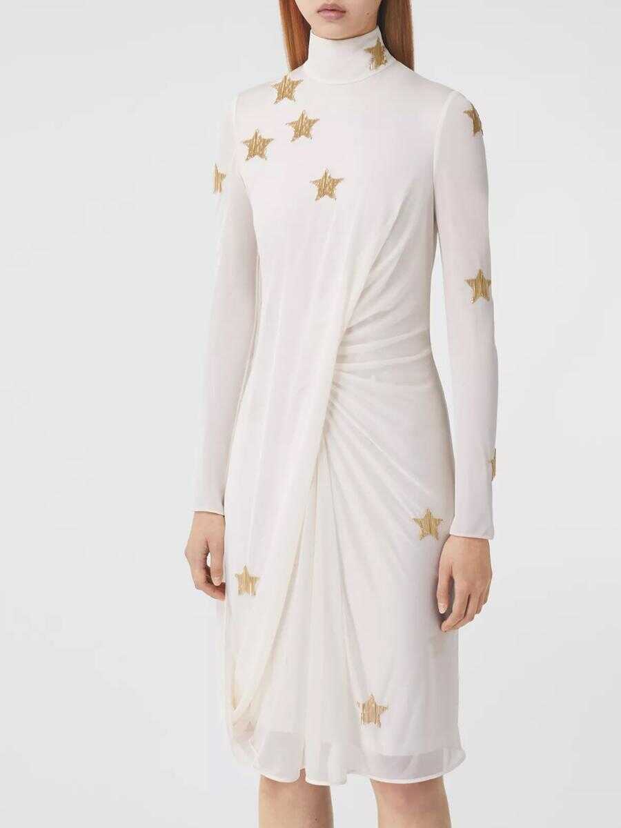 High neck, long sleeve dress crafted in fluid silk with overlapping draped sheer jersey. It features gold-colored star-shaped embroidery and a back zip closure.