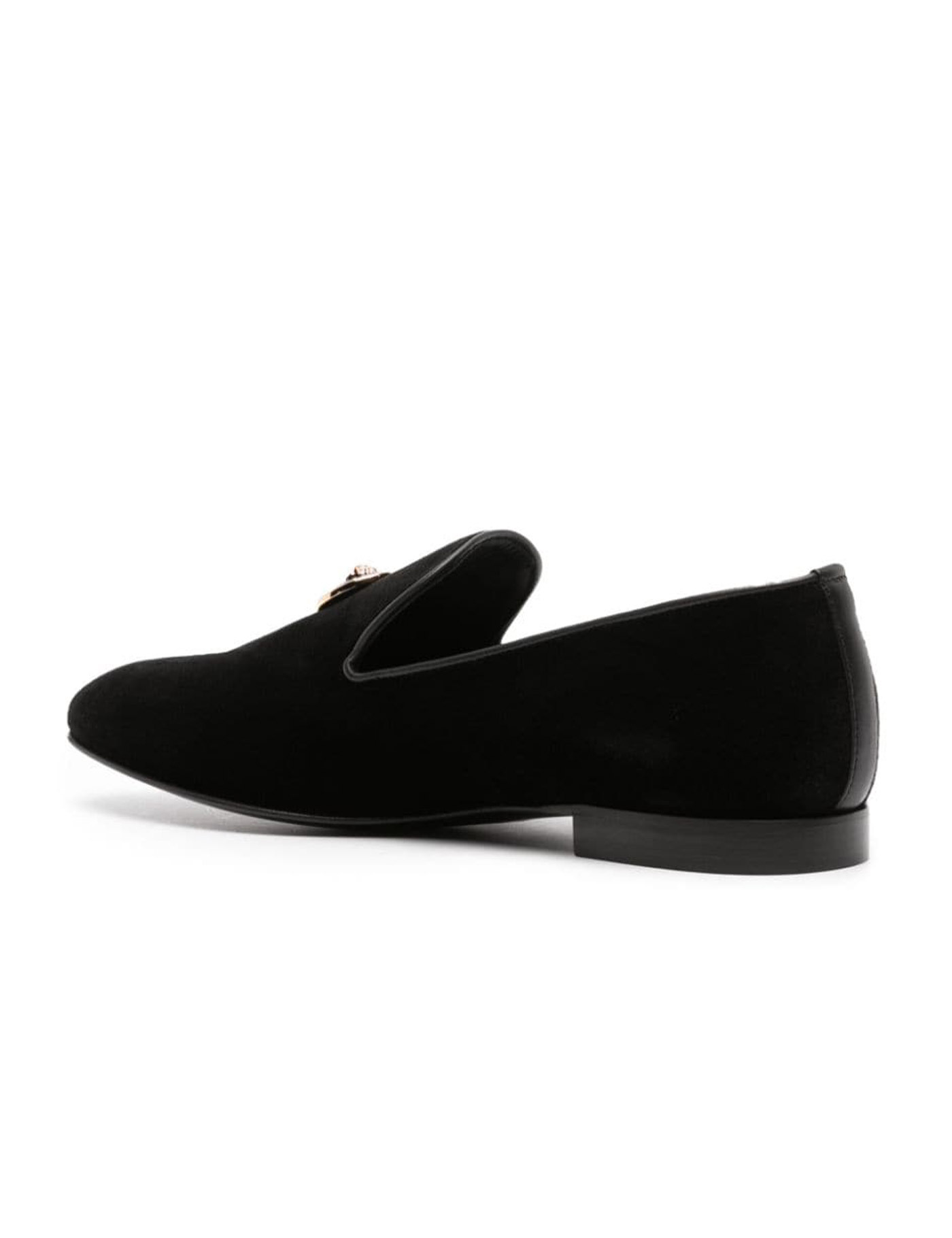 Black calf suede/calf leather velvet medusa head motif almond toe slip-on style branded insole flat sole