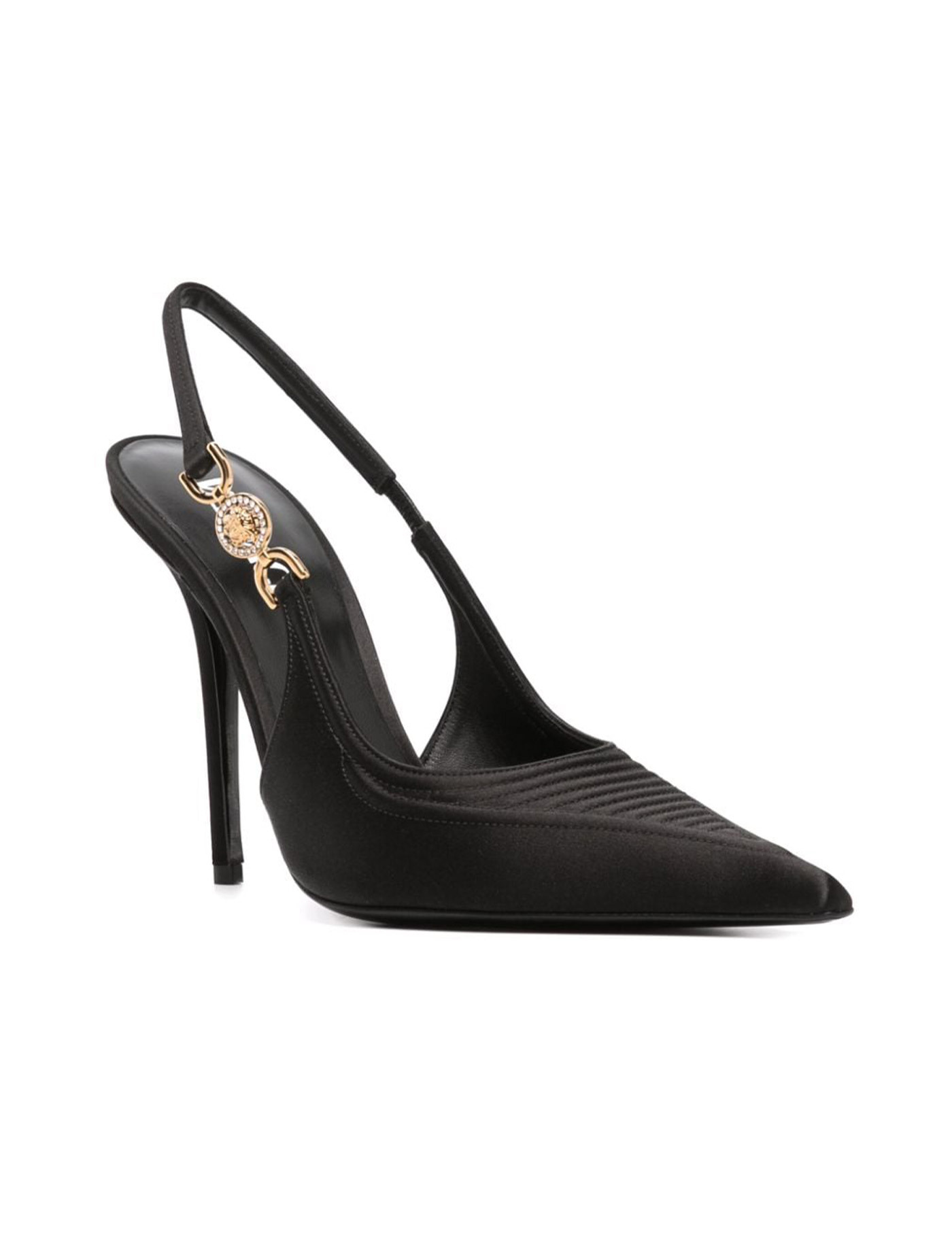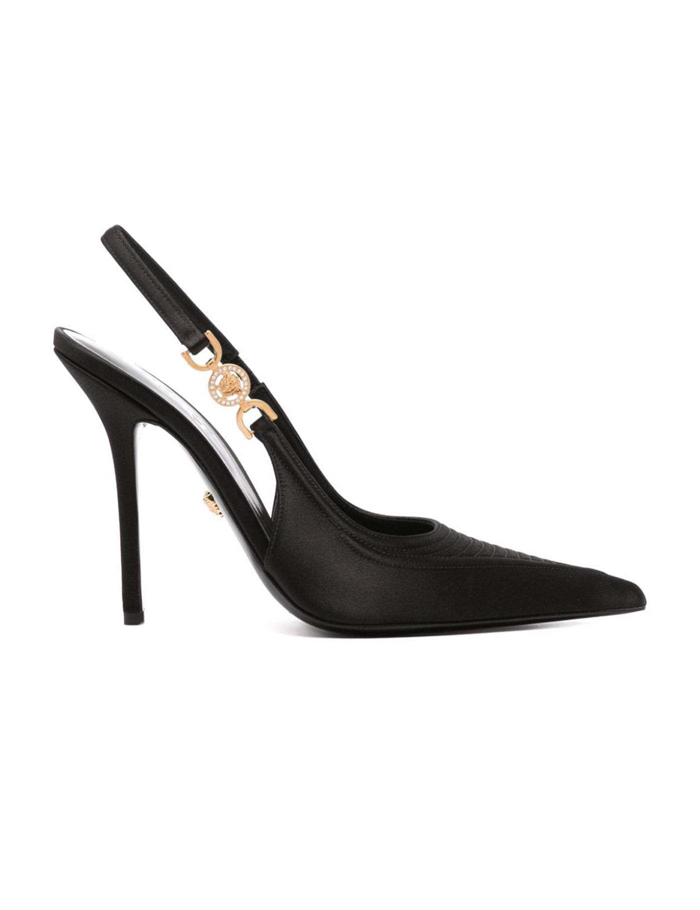 Medusa '95 slingback satin pumps from Versace featuring black, silk, calf leather, satin finish, Medusa Head motif, pointed toe, slingback strap, branded insole and high stiletto heel.