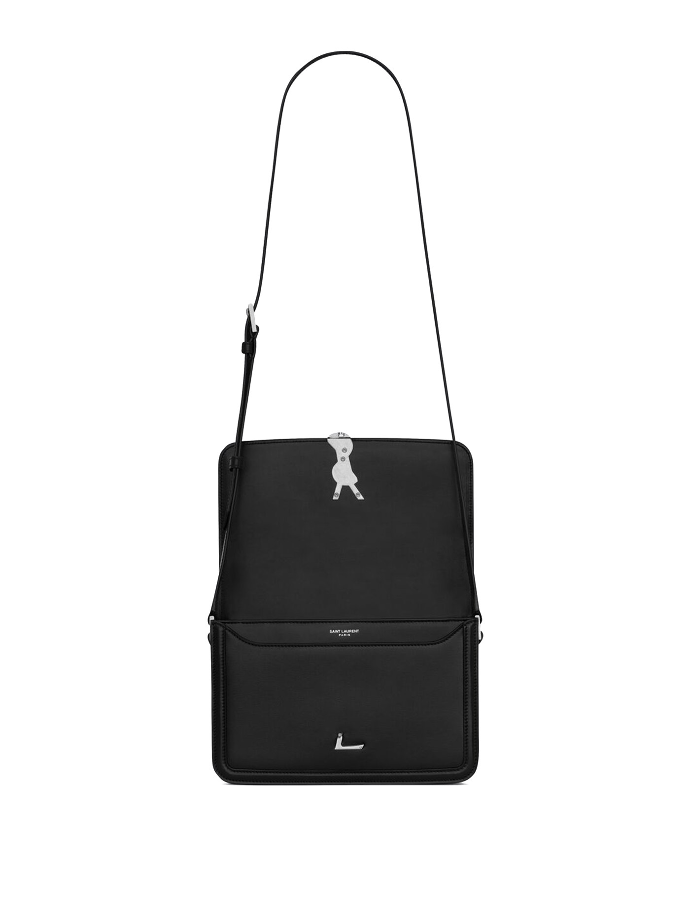Saint Laurent's shoulder bag crafted in black smooth leather. It features silver-tone hardware, clasp closure on flap with metal interlocking YSL signature and adjustable shoulder strap. Black leather-lined interior with two slip pockets and card slot.