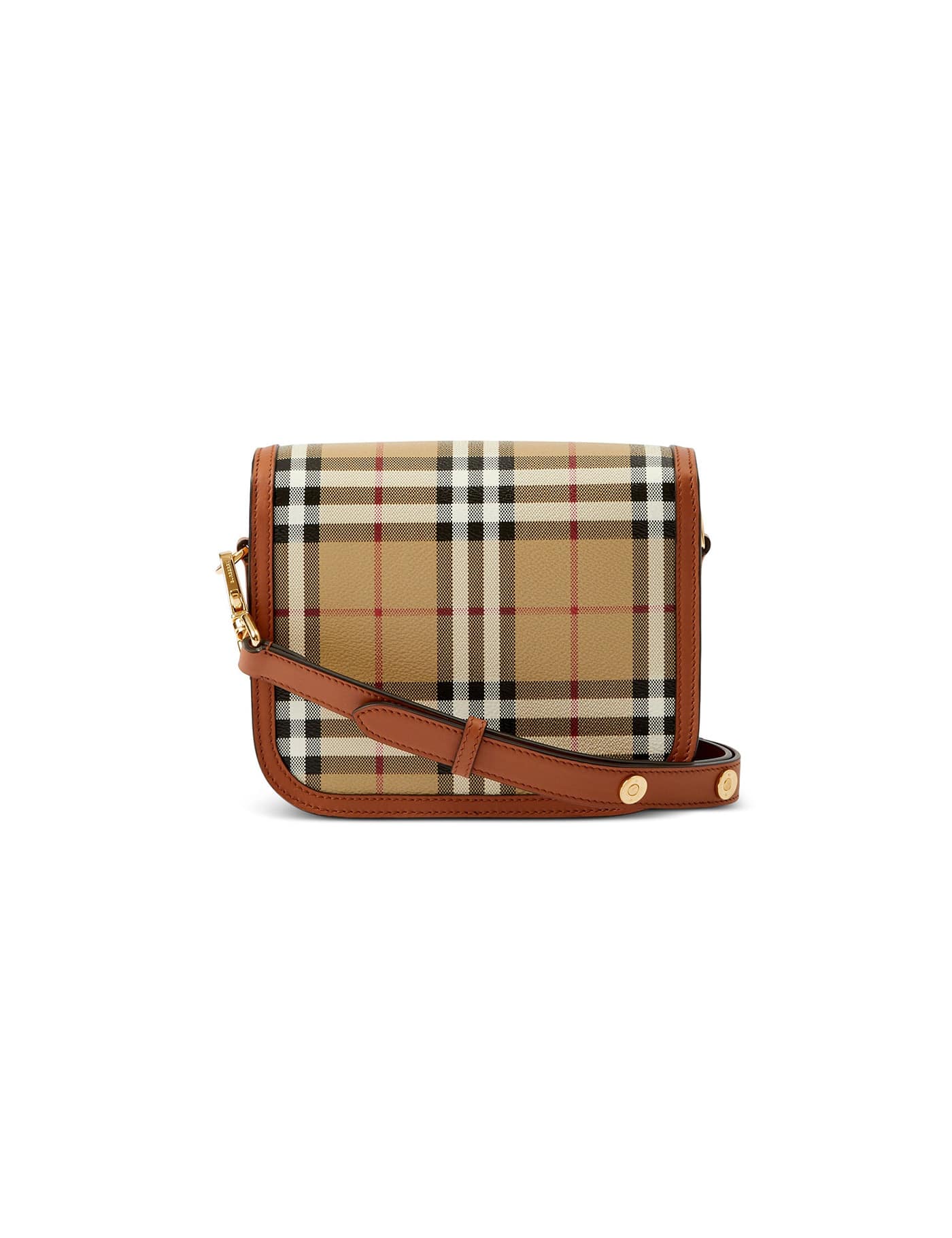 Burberry's iconic tartan pattern meets a compact and functional design in this fabric shoulder bag. Finished with smooth leather trim and gold details, it's the perfect accessory to add a British touch to any look. The compact but well-organized interior makes it ideal for everyday use. - Material: 69% polyurethane, 17% polyester, 14% cotton - Color: beige - Cotton-lined interior - Calfskin leather trim - Burberry Check all-over pattern - Adjustable and detachable shoulder strap - Snap button closure - Made in Italy - Dust bag - Item number: 8071356A9534