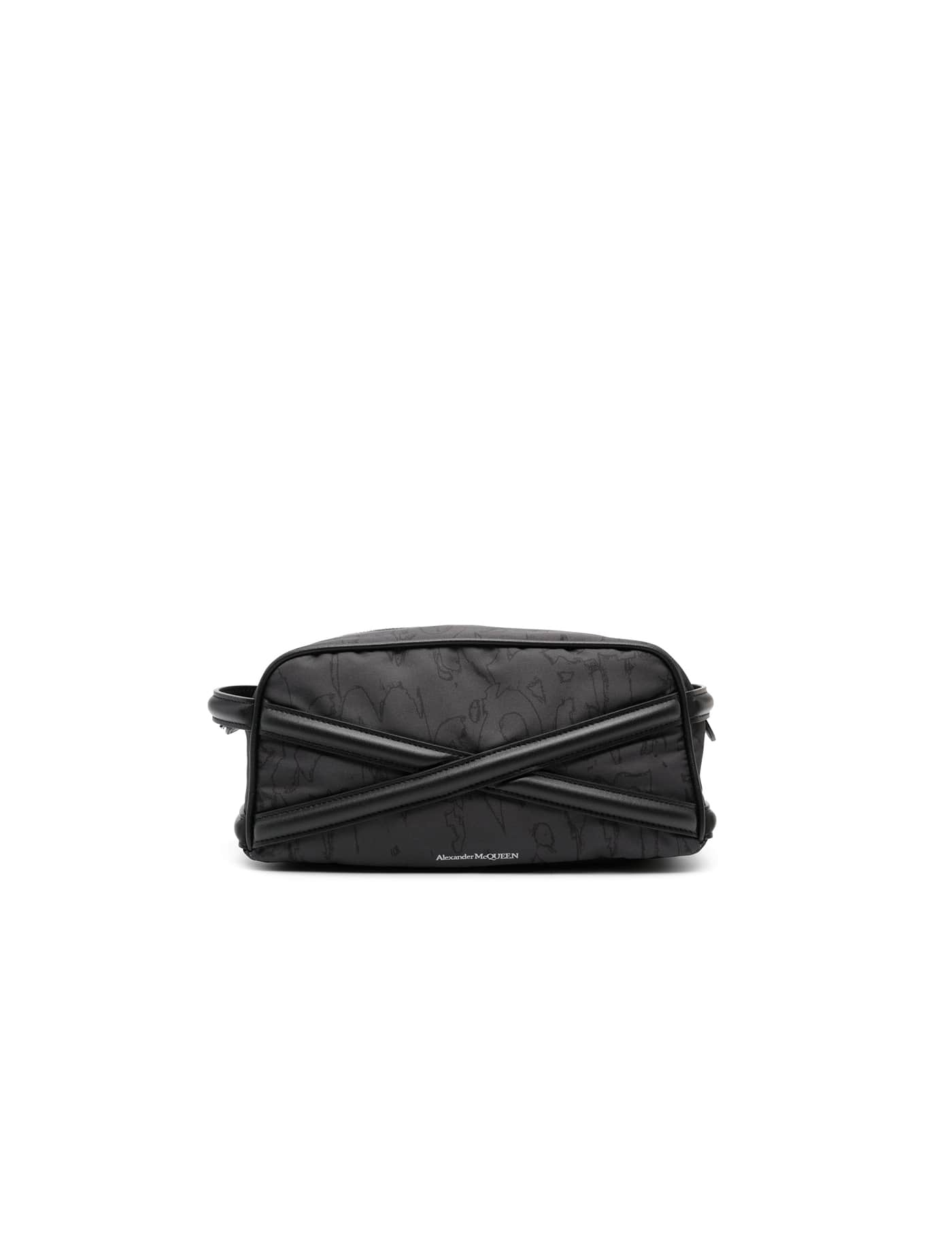 Alexander McQueen nylon vanity case with all-over Graffiti print and characterized by tonal leather harness and silver-tone lettering logo print. Zip closure, contrasting nylon lined-interior with one credit card slot, rear flat pocket. Side handles, silver-finished metalware.