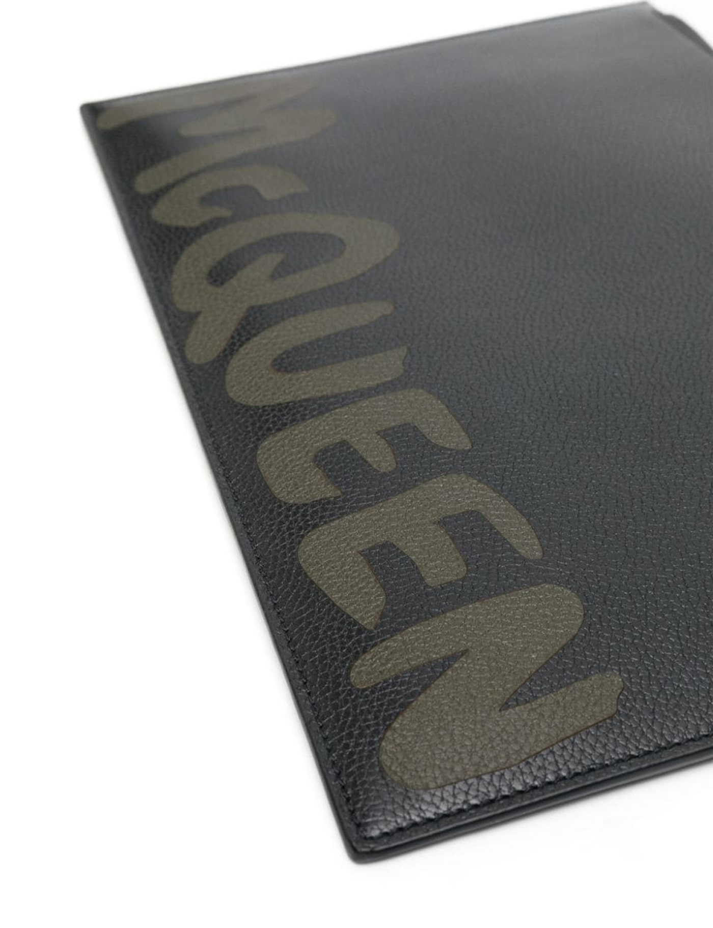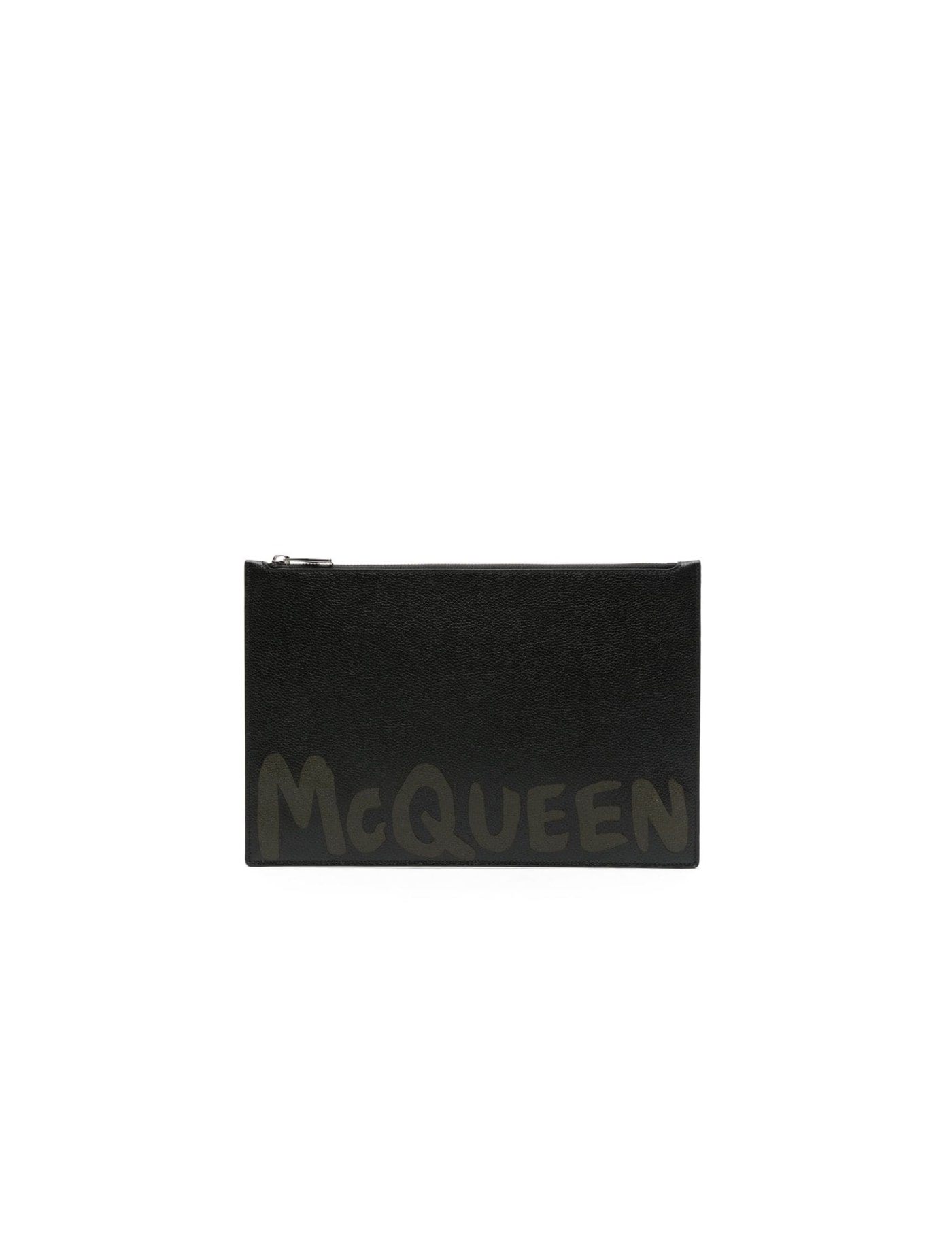 Alexander McQueen flat pouch crafted in grained leather with contrasting McQueen Graffiti print on front. Zippered closure. Branded leather lining with a flat patch pocket and six leather credit card slots in leather. Silver-finished metalware.