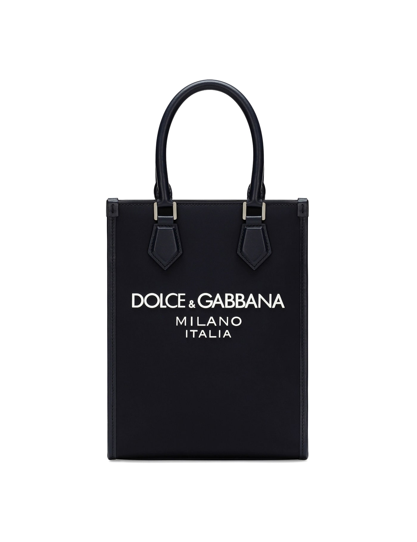 Dolce & Gabbana small tote bag crafted in nylon with smooth leather trimmings and double top handle, featuring contrasting rubberized logo on front. Equipped with detachable and adjustable fabric shoulder strap with leather details. Magnetic button closure, nylon lining and two inner patch pockets. Ruthenium-finished metalware.