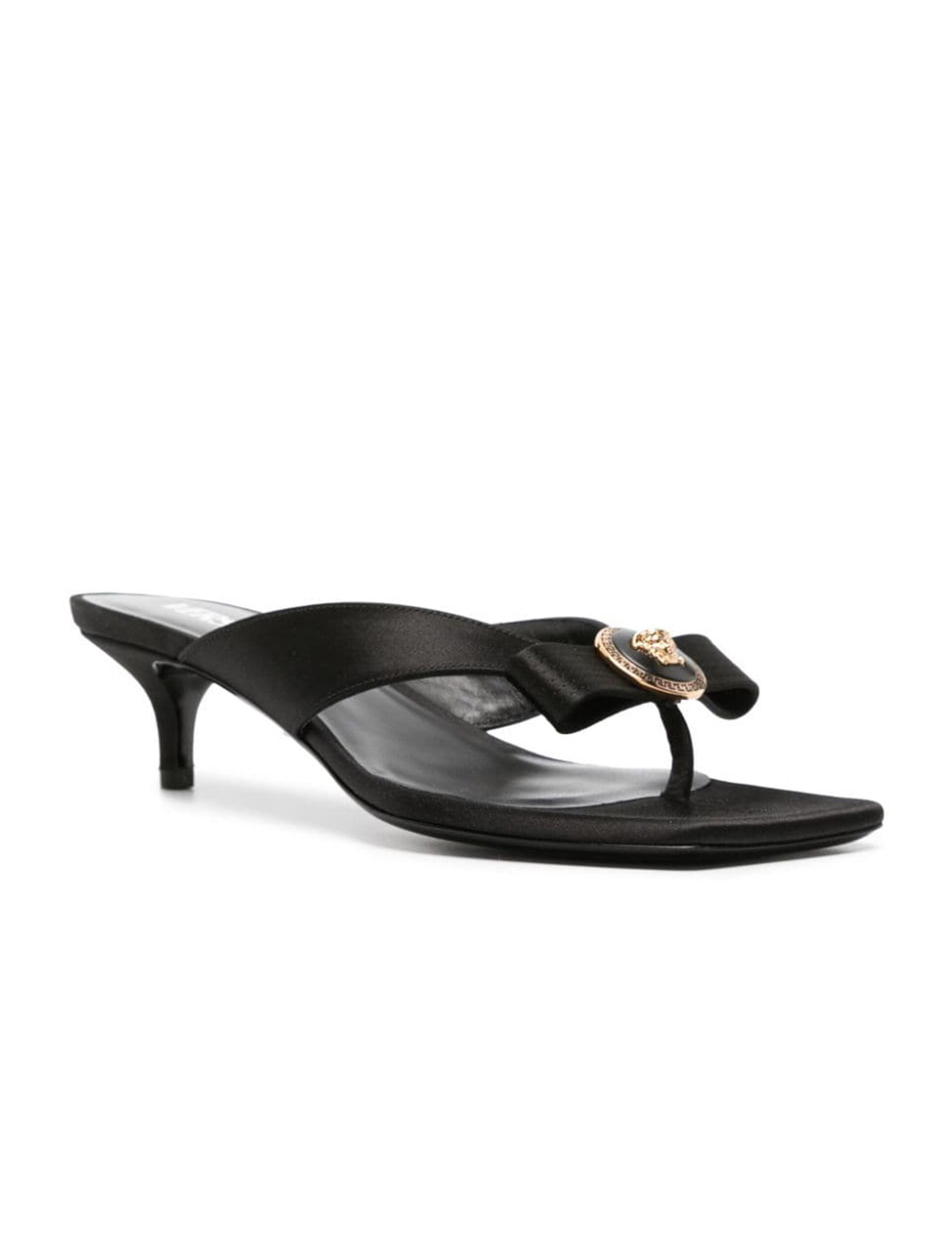 Versace’s black satin toe-post sandals featuring bow and Medusa logo plaque on the front, leather lining, insole and sole and midi heel.