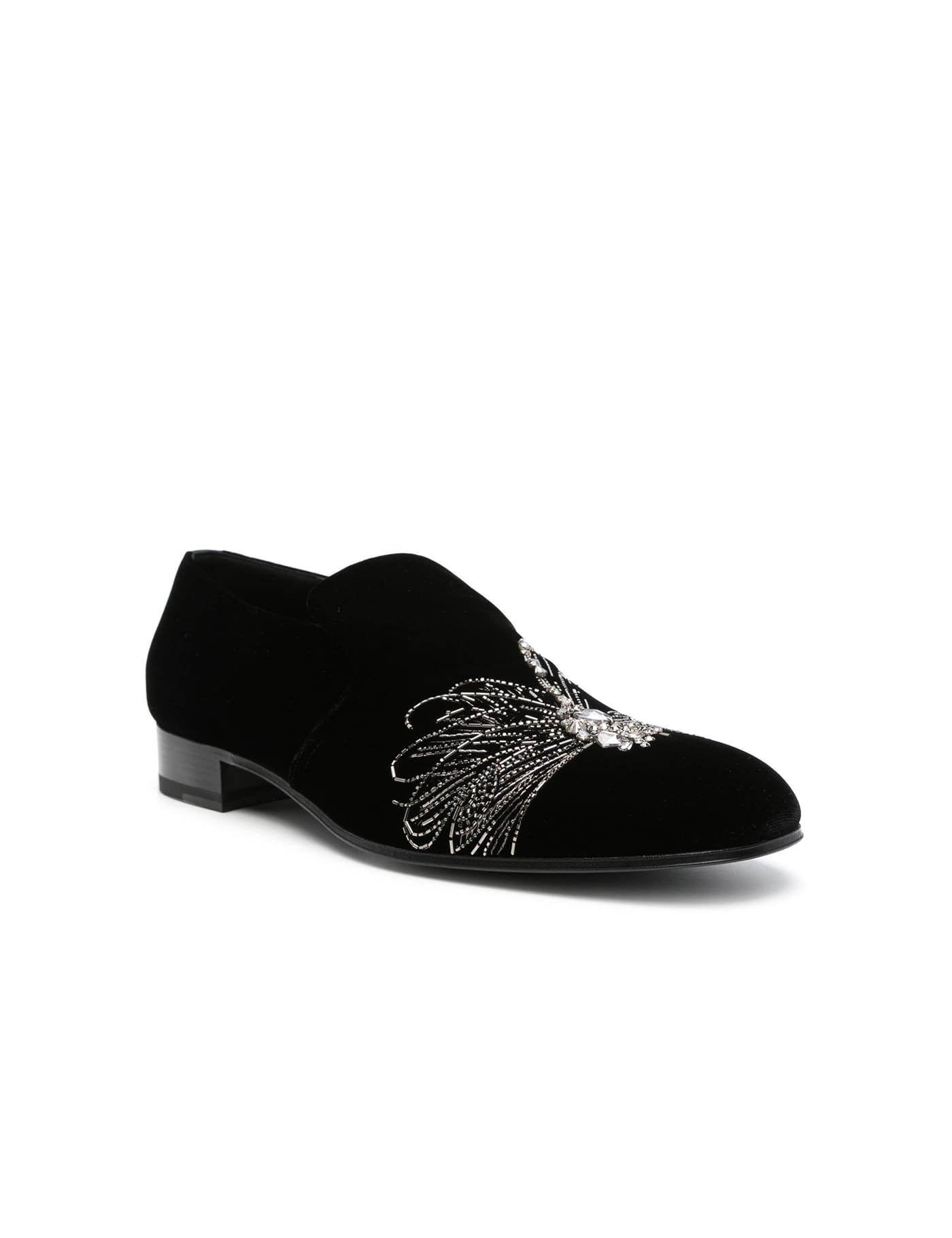 Black calf leather/velvet velvet effect crystal embellishment bead embellishment leather trim round toe slip-on style branded leather insole low stacked heel flat leather sole