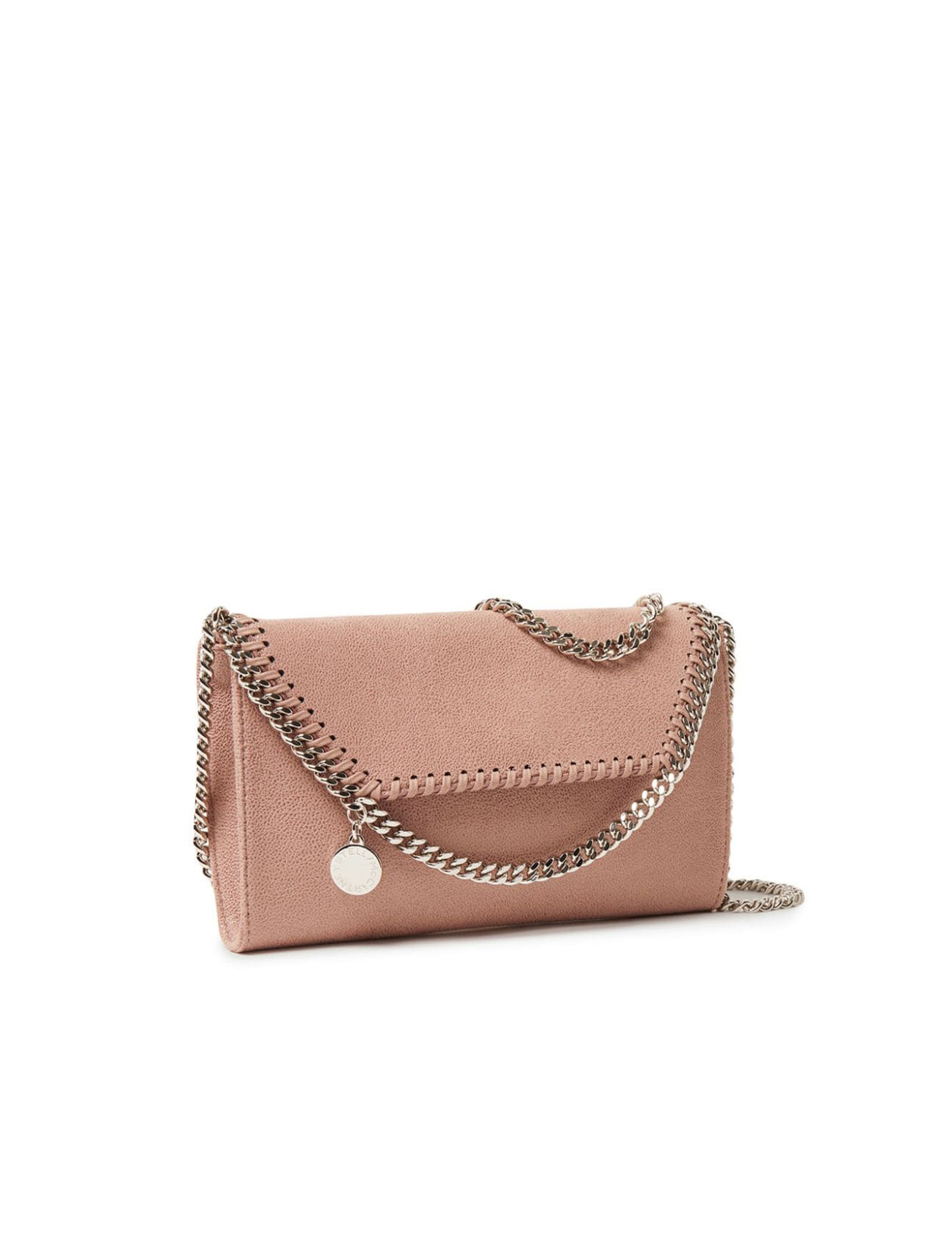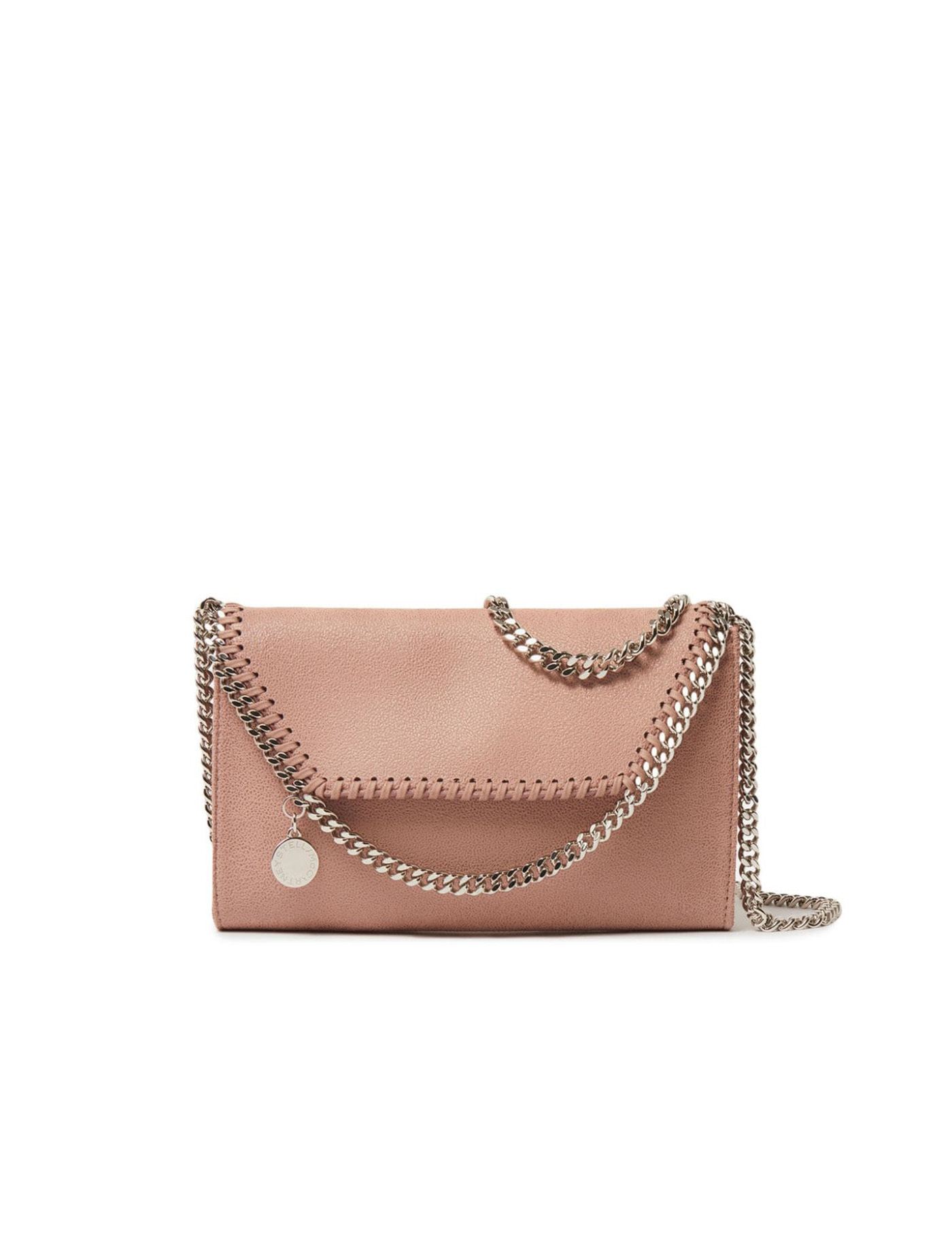 blush pink faux leather whipstitch chain trim logo charm silver-tone hardware foldover top with magnetic fastening chain-link shoulder strap main compartment internal slip pocket.