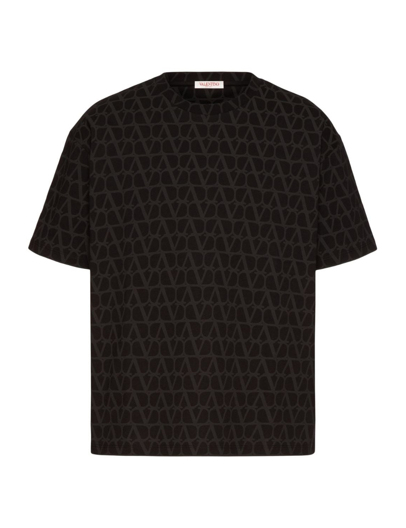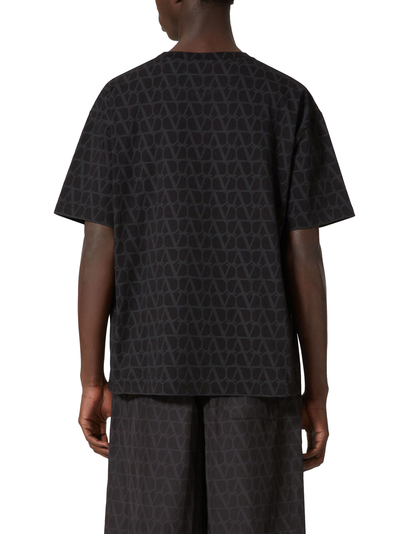 Valentino’s black cotton t-shirt featuring a crew neck and Toile Iconographe motif. Model is wearing accessories and shoes from Valentino Garavani.