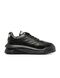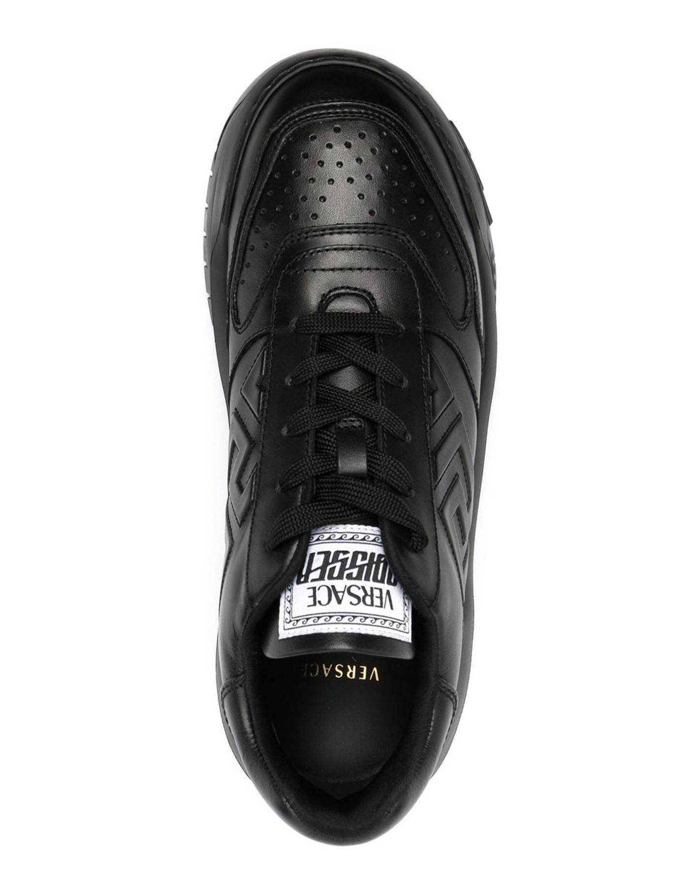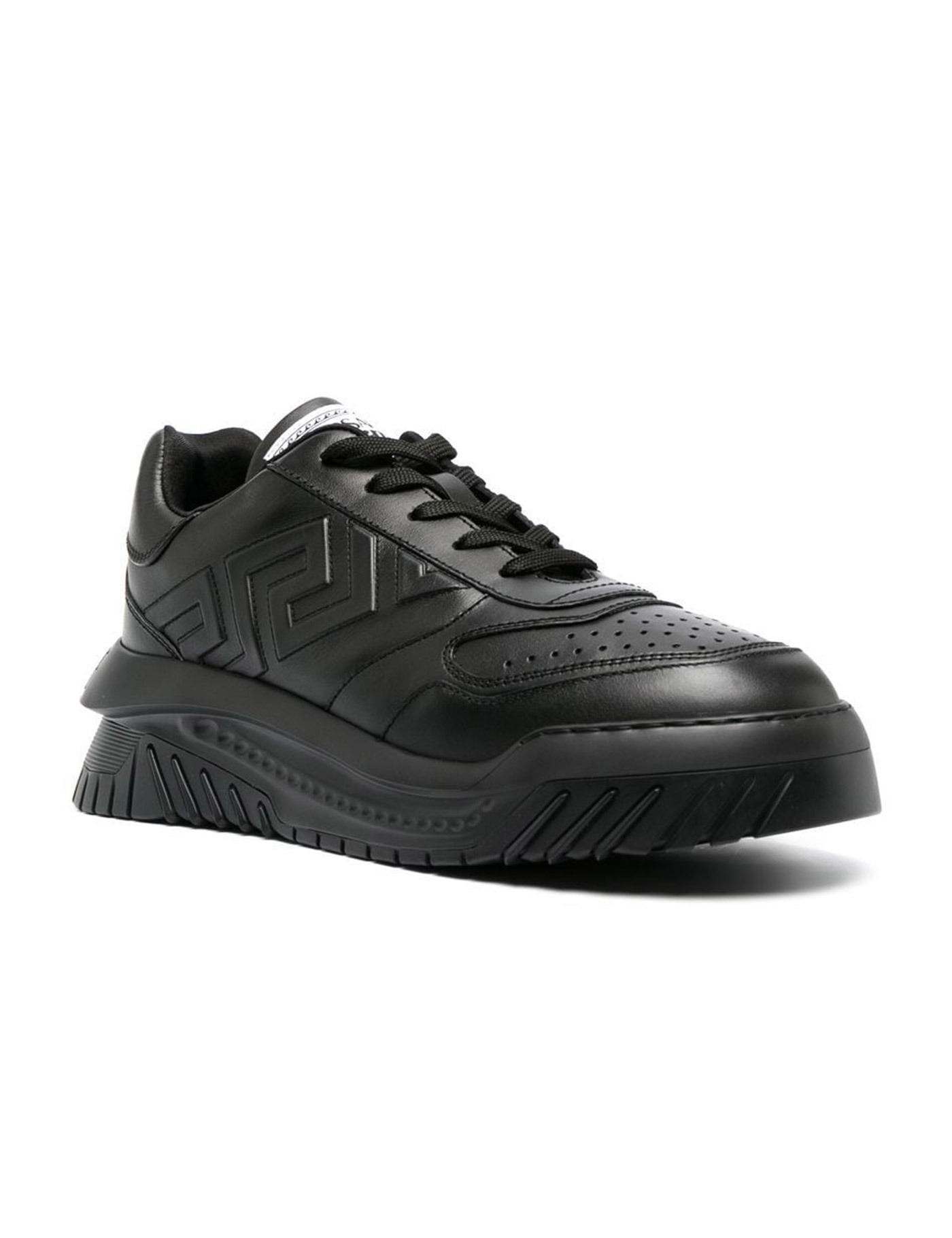 Versace’s Odissea Greca black leather sneakers featuring a rounded toe, front laces, logo label on the tongue, Greca motif embossed on the sides, white style name on the heel patch and chunky rubber sole with logo embossed on the back.
