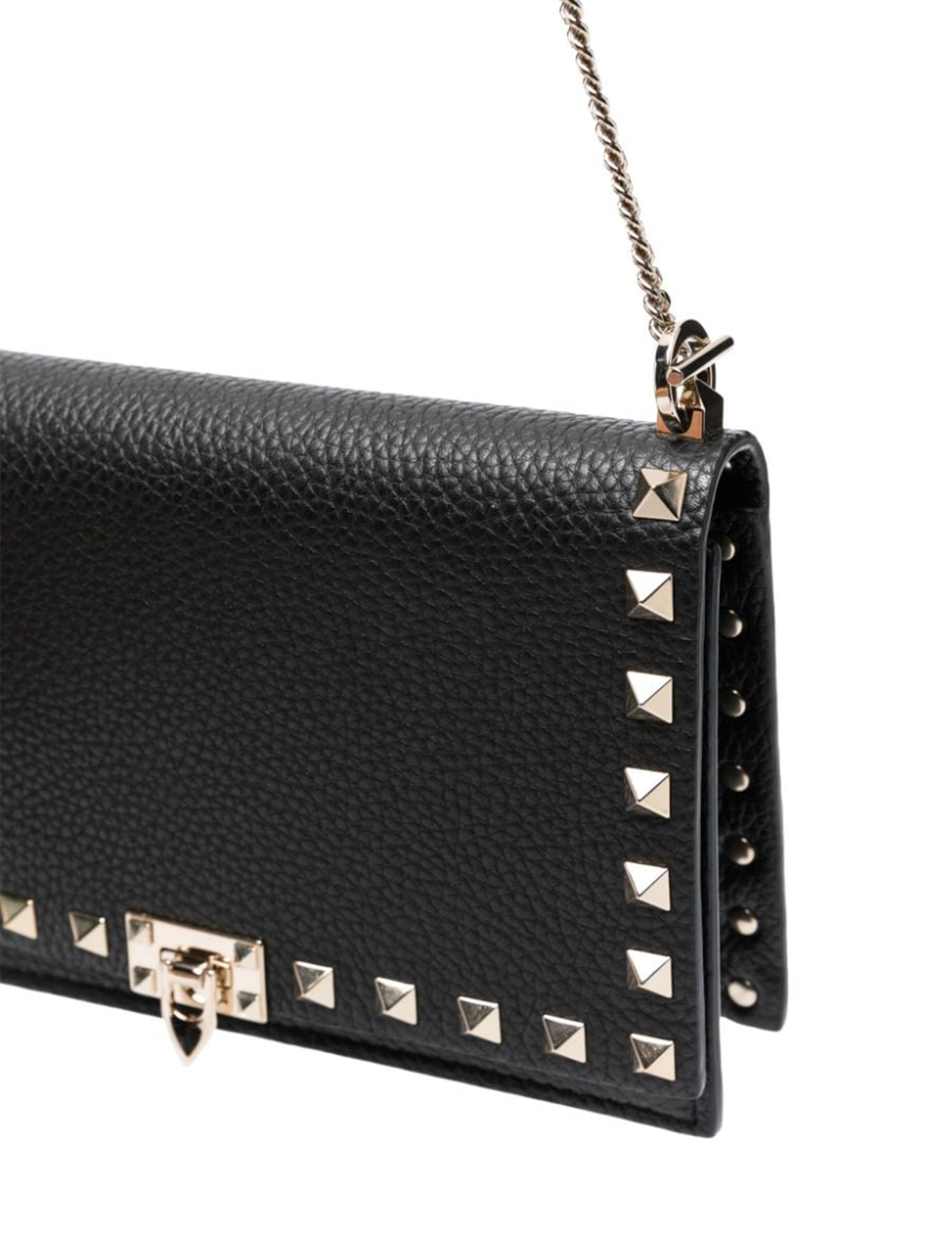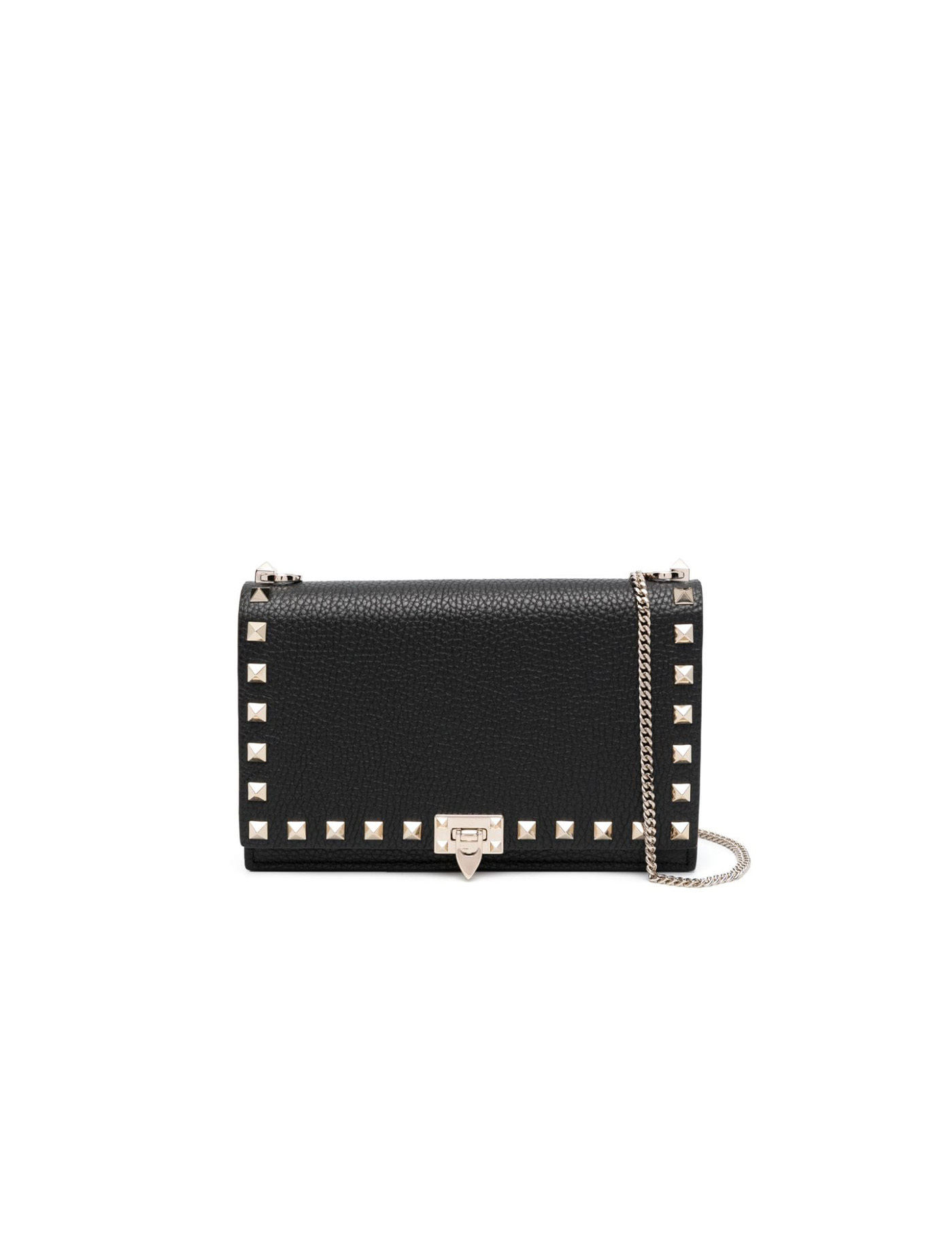 VALENTINO GARAVANI LEATHER ROCKSTUD HANDBAG, DETACHABLE CHAIN SHOULDER STRAP, ICONIC BRAND MONOGRAM PRESS-STAMPED ON BACK, FRONT CLOSURE VIA HOOK-AND-LOOP FLAP, ICONIC ROCKSTUD STUDS APPLIED ON BEADING, SINGLE INTERIOR COMPARTMENT.