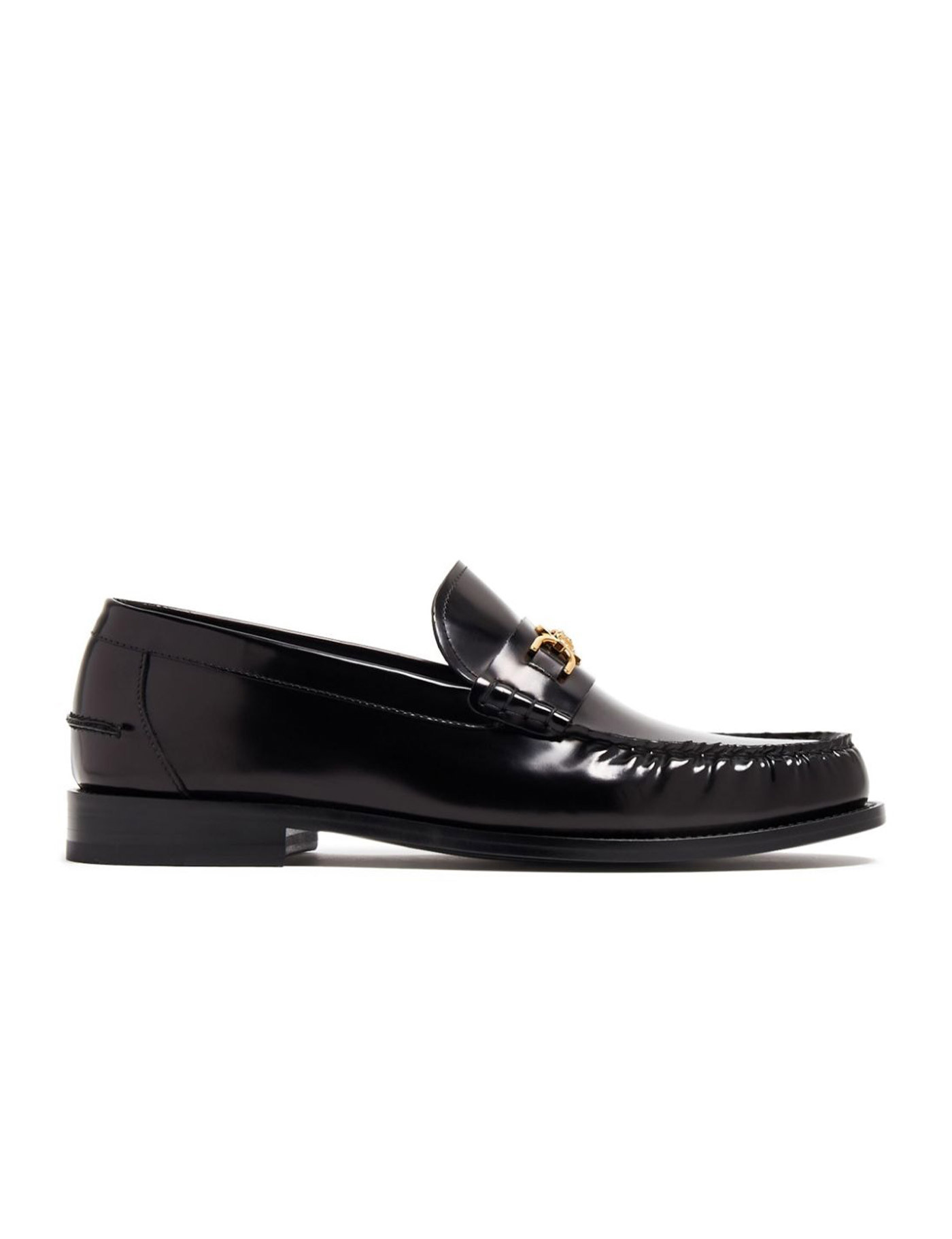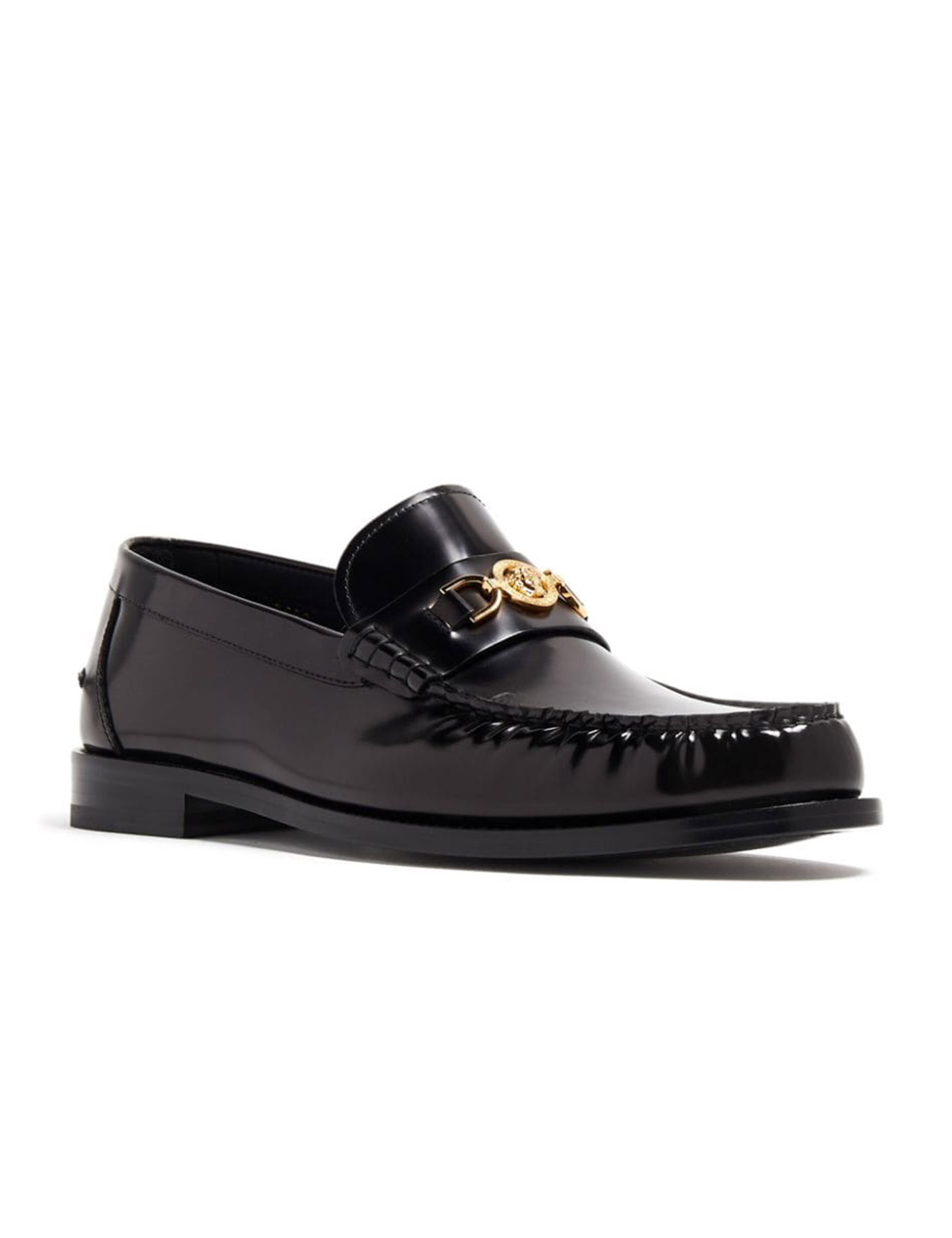 Versace loafers crafted in brushed leather and decorted with gold-finished metal Medusa '95 on the penny bar. Leather interior and leather sole.