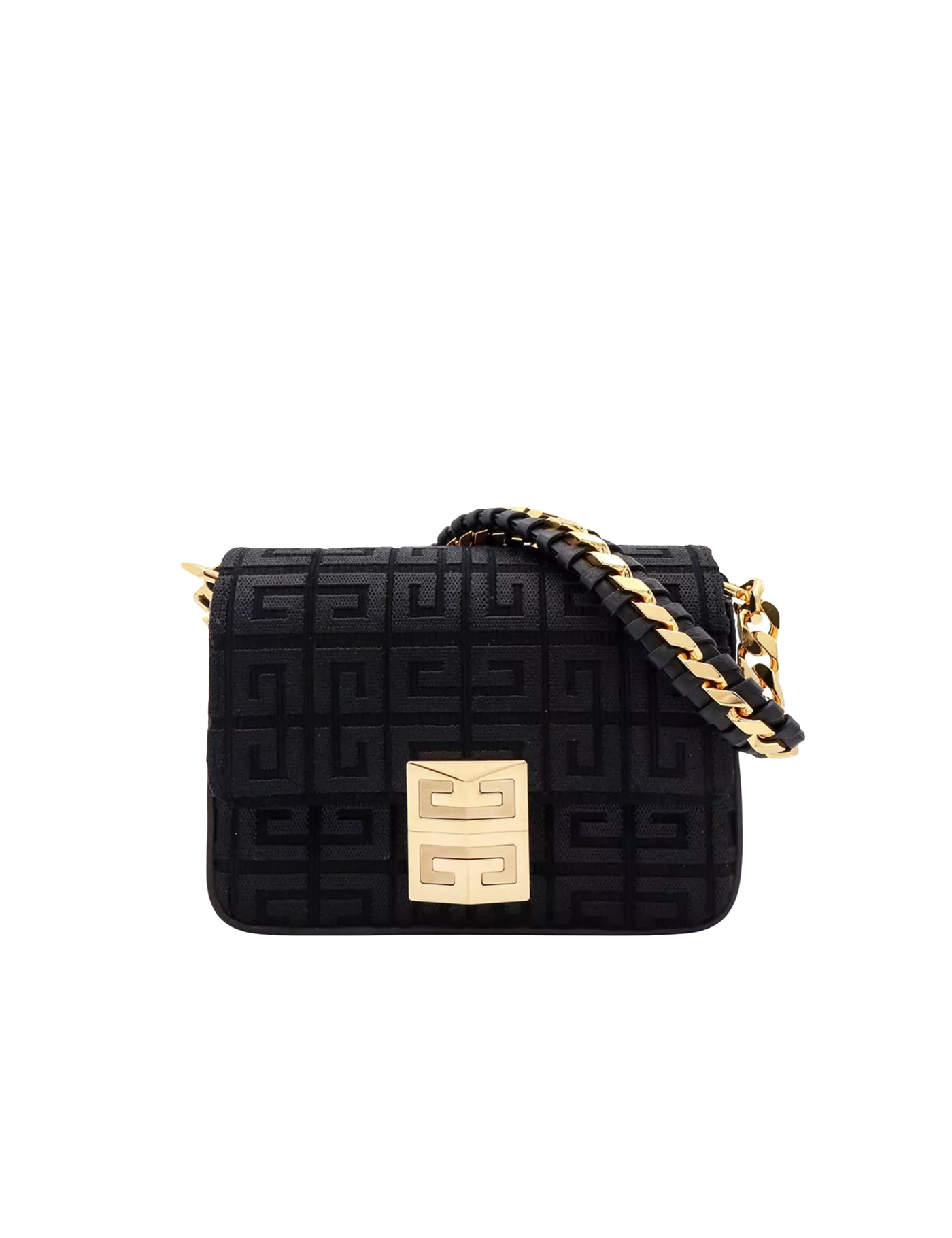 small 4G crossbody bag from Givenchy featuring black, cotton blend, signature 4G motif, gold-tone logo plaque, single chain-link top handle, foldover top with magnetic fastening, monogram jacquard, adjustable detachable shoulder strap, main compartment a