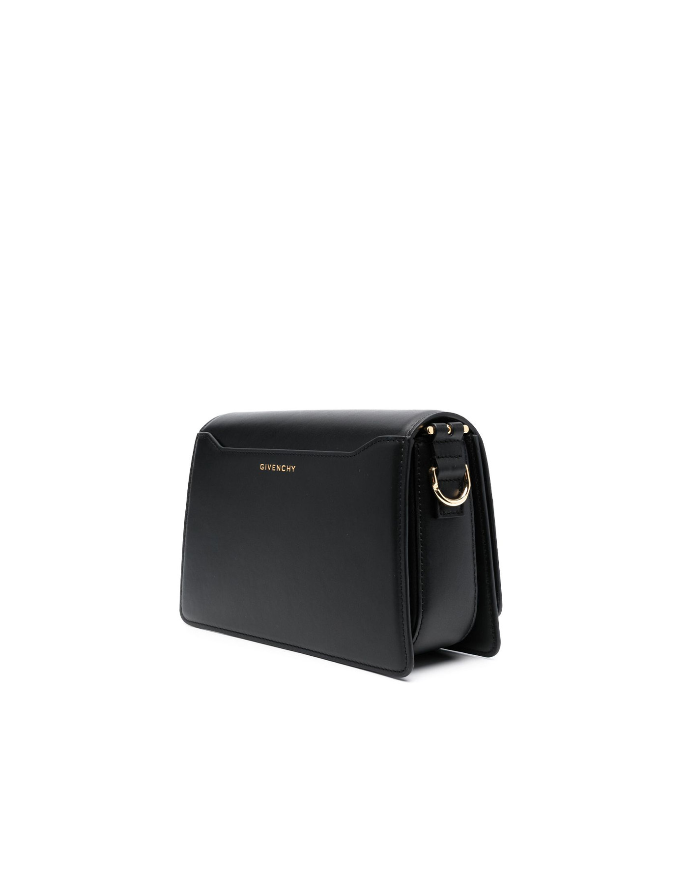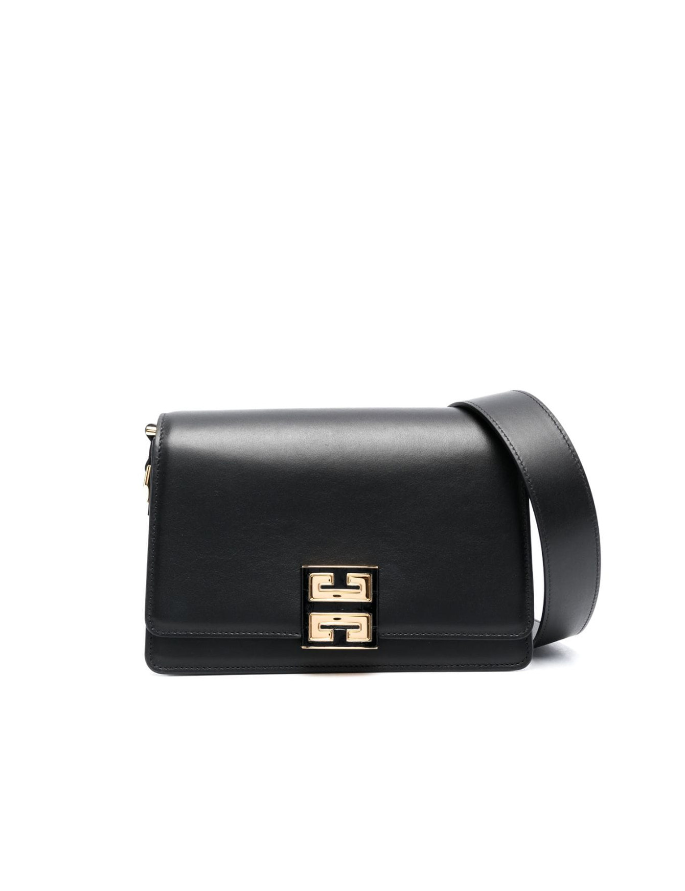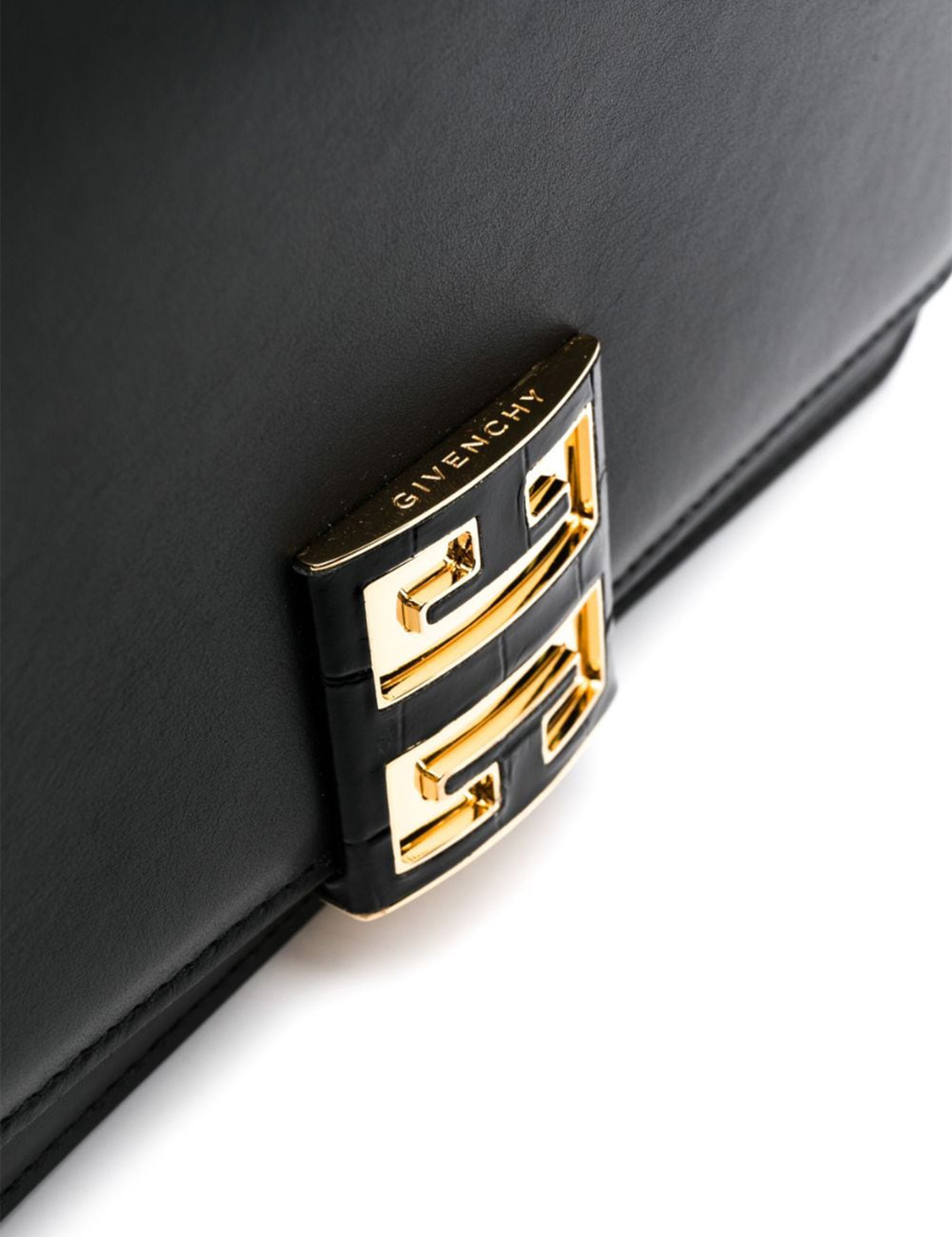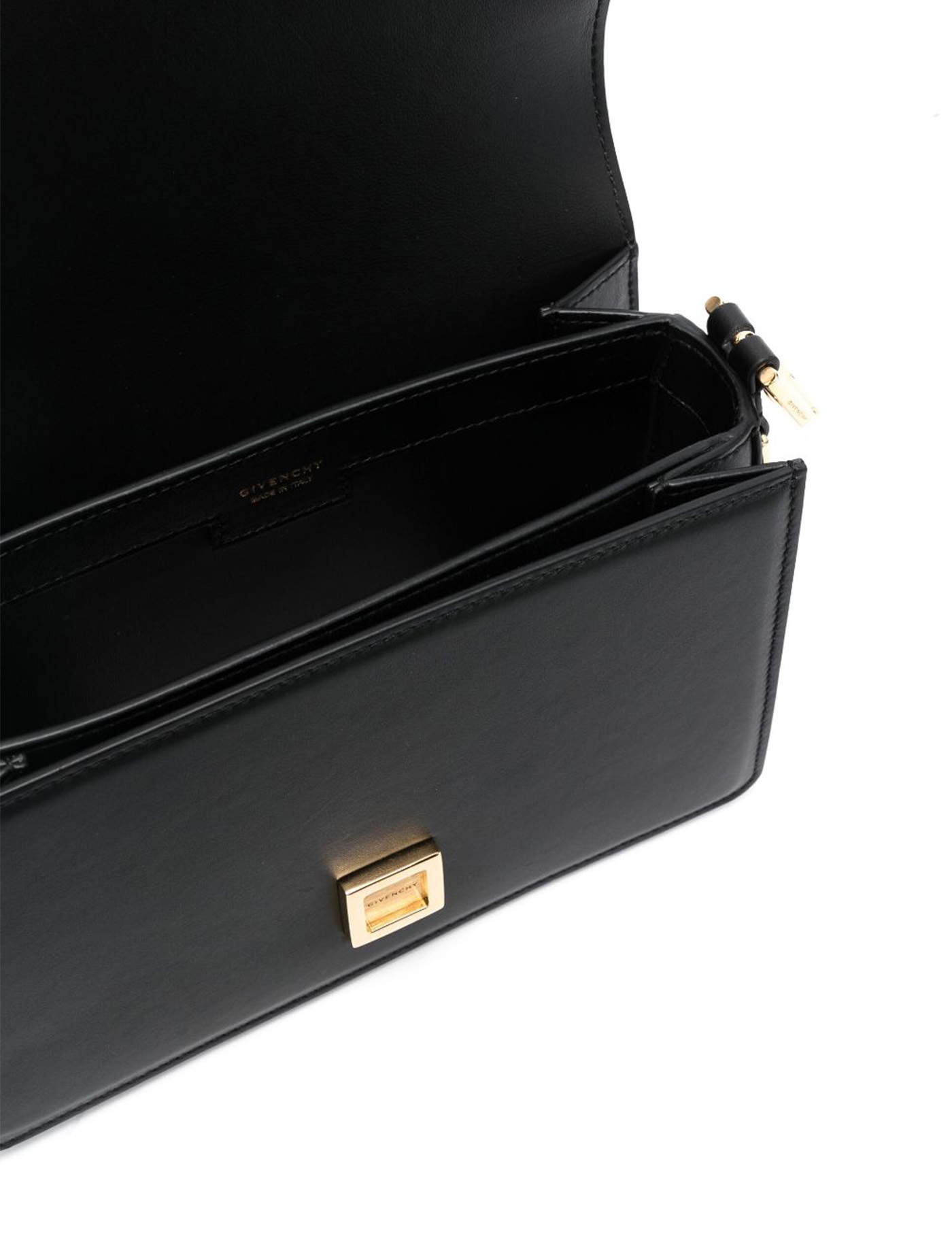 logo-plaque leather shoulder bag from Givenchy featuring black, calf leather, logo stamp to the rear, gold-tone logo plaque, gold-tone hardware, tonal stitching, foldover top with magnetic fastening, single shoulder strap, partitioned compartment and sli
