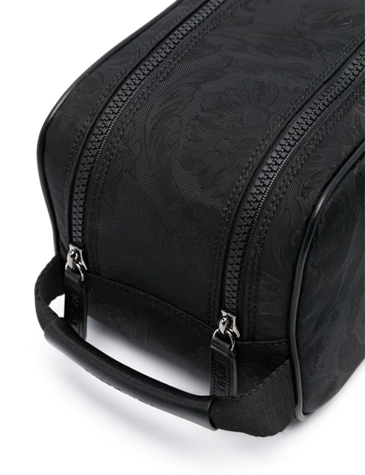 Versace vanity case made of jacquard nylon with all-over Barocco pattern and leather details. It features two zippered compartments with nylon lining, one of which has two open pockets. Finished with side handle with leather logo insert, tone-on-tone logo patch on front and ruthenium-finished metalware.