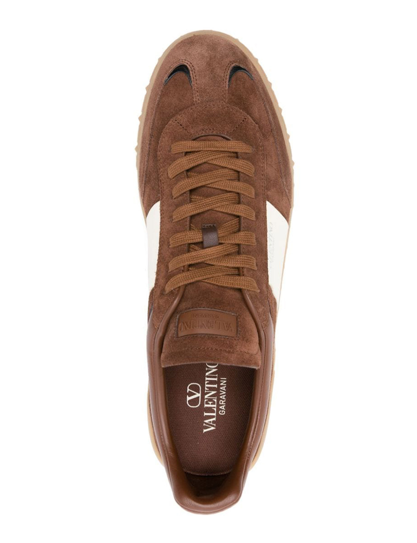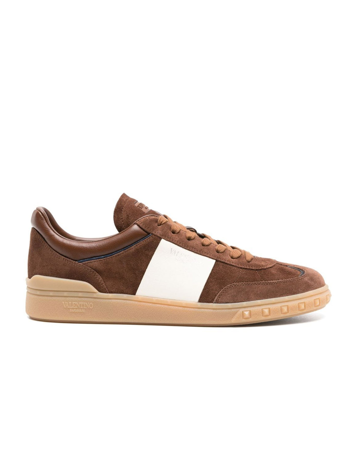 Valentino Garavani Low Top sneakers made of suede with contrasting smooth leather side insert embellished with silver lettering logo. Front lacing, leather interior with removable fabric insole and rubber sole with iconic embossed studs.
