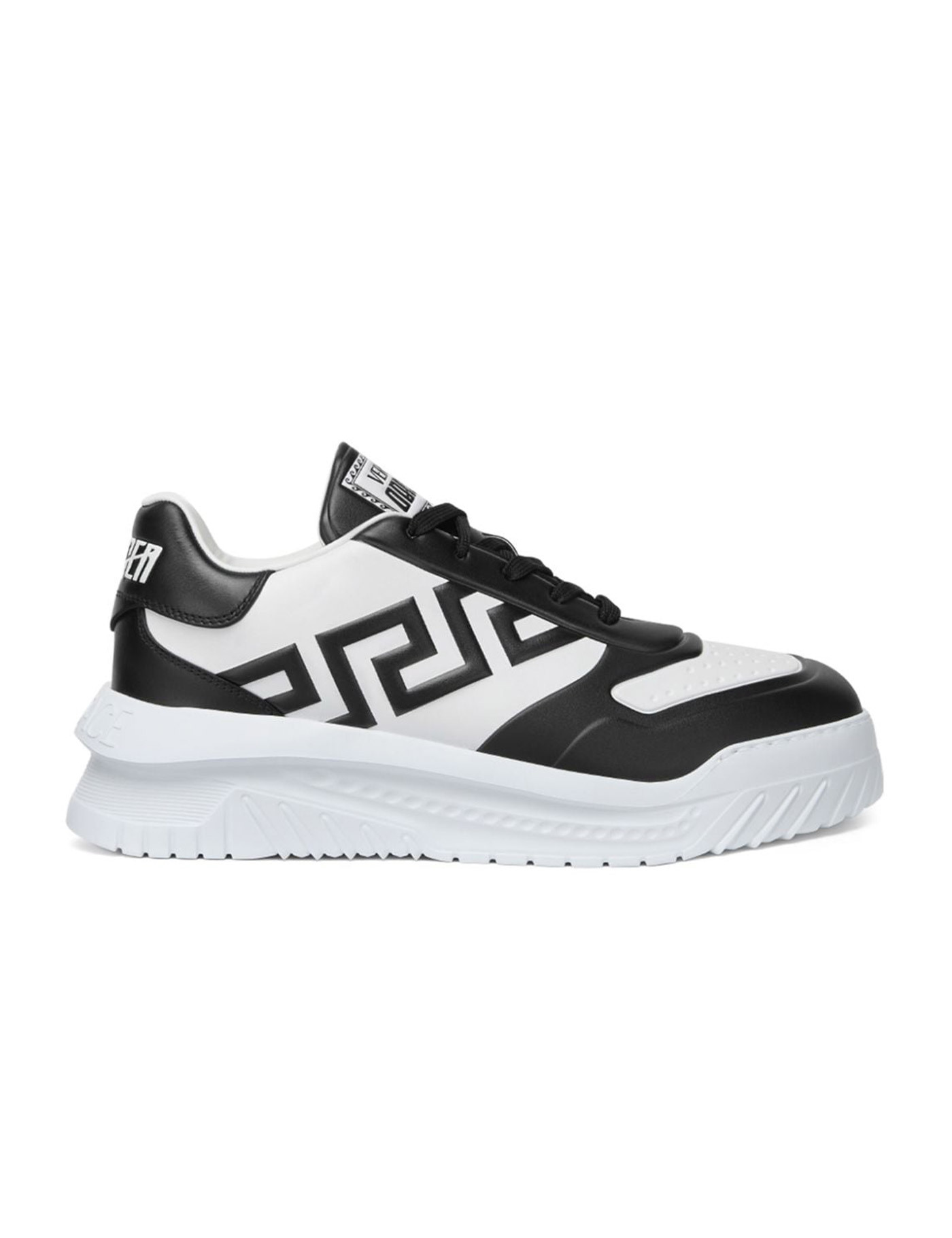 Versace "Odissea" leather sneakers enriched by the signature embossed Greca motif. Fabric logo patch on the tongue, front lace-up closure and perforations on the toe. Lettering print on the heel tab and rear embossed logo. Fabric interior with removable leather insole and rubber sole.