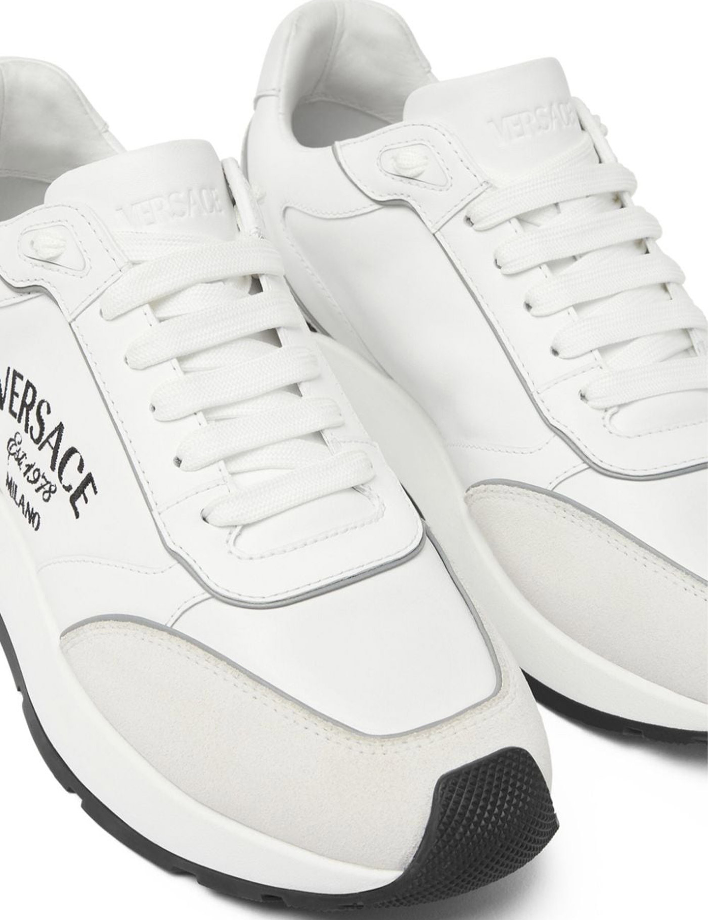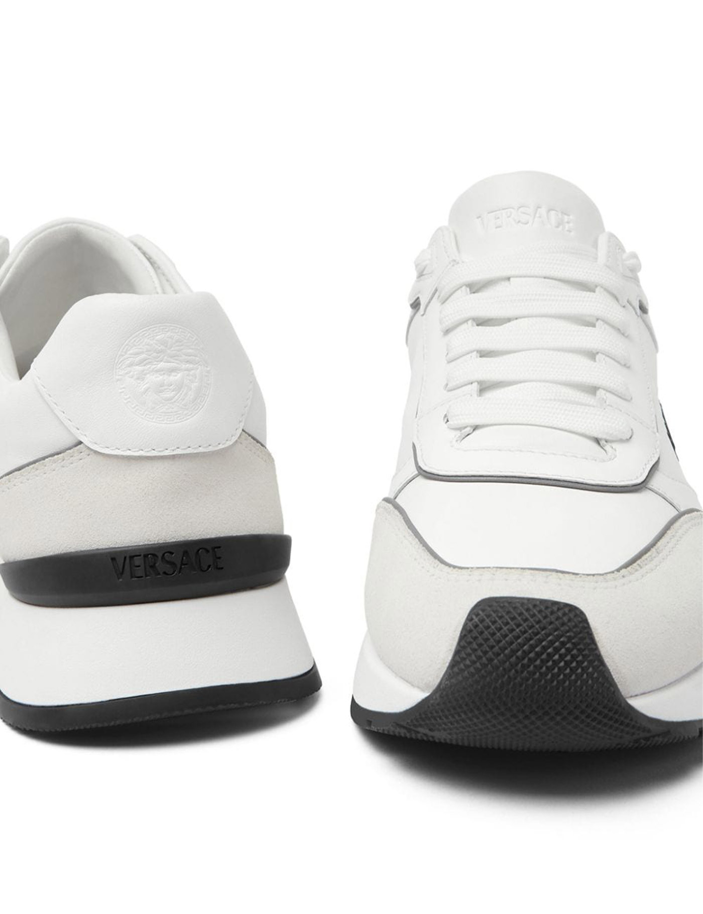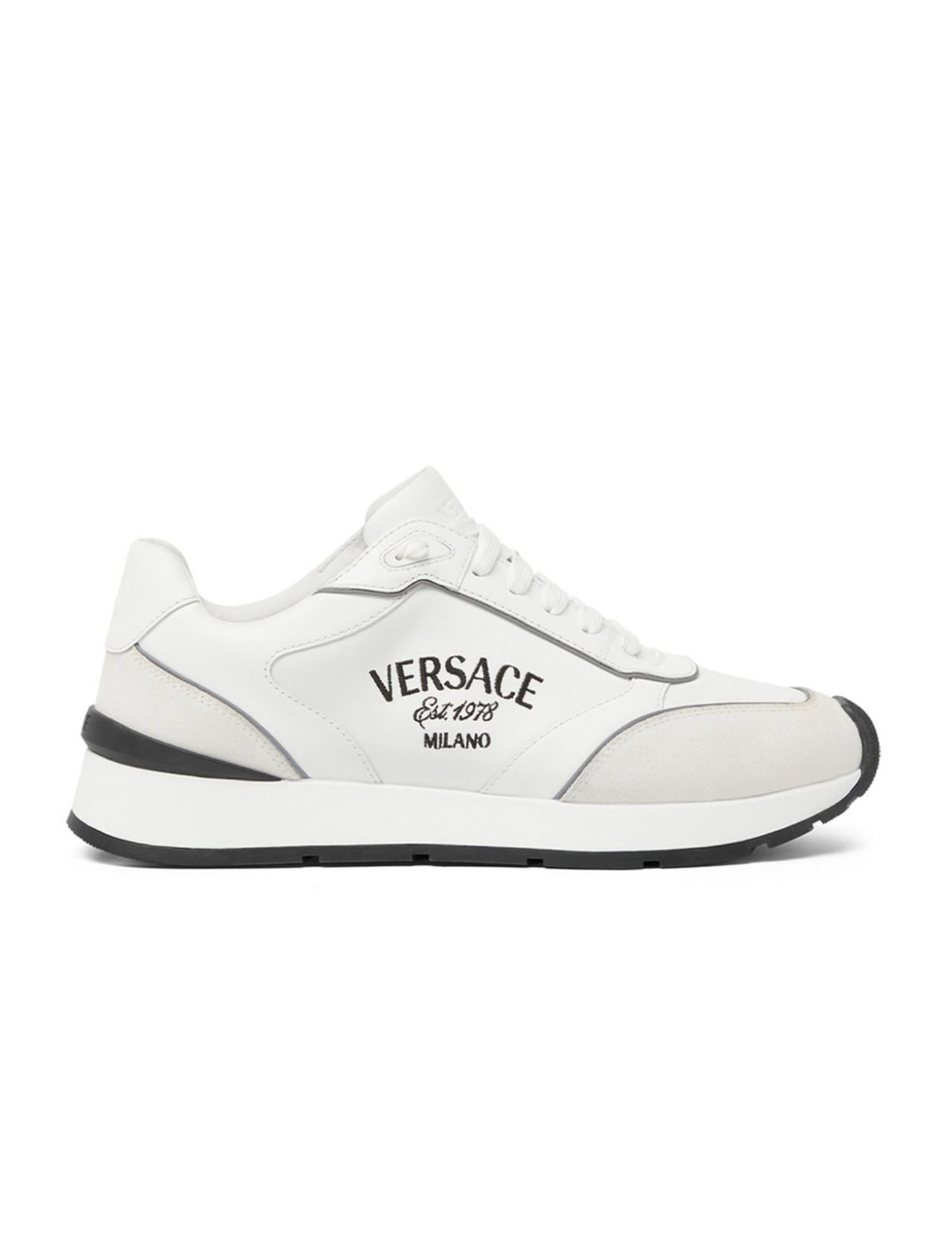 Milano Runner sneakers by Versace made of smooth and suede leather with contrasting embroidered lettering on the side. Lace-up closure, leather interior with removable insole, heel-tab with iconic embossed Medusa and rubber sole.