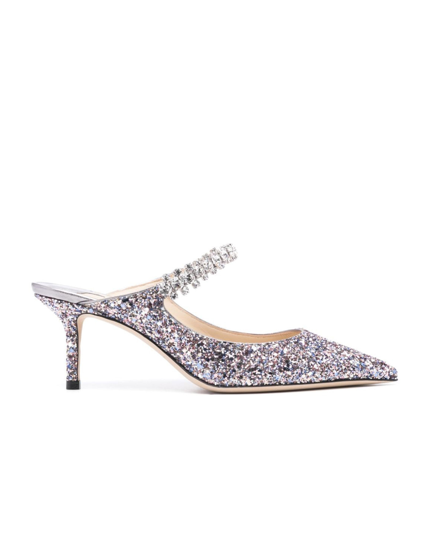 Bing 65 mules by Jimmy Choo completely covered with glitter and enriched by the crystal strap for a hint of elegant glamour. Covered stiletto heel, leather interior with fabric logo insert on the insole, leather sole.