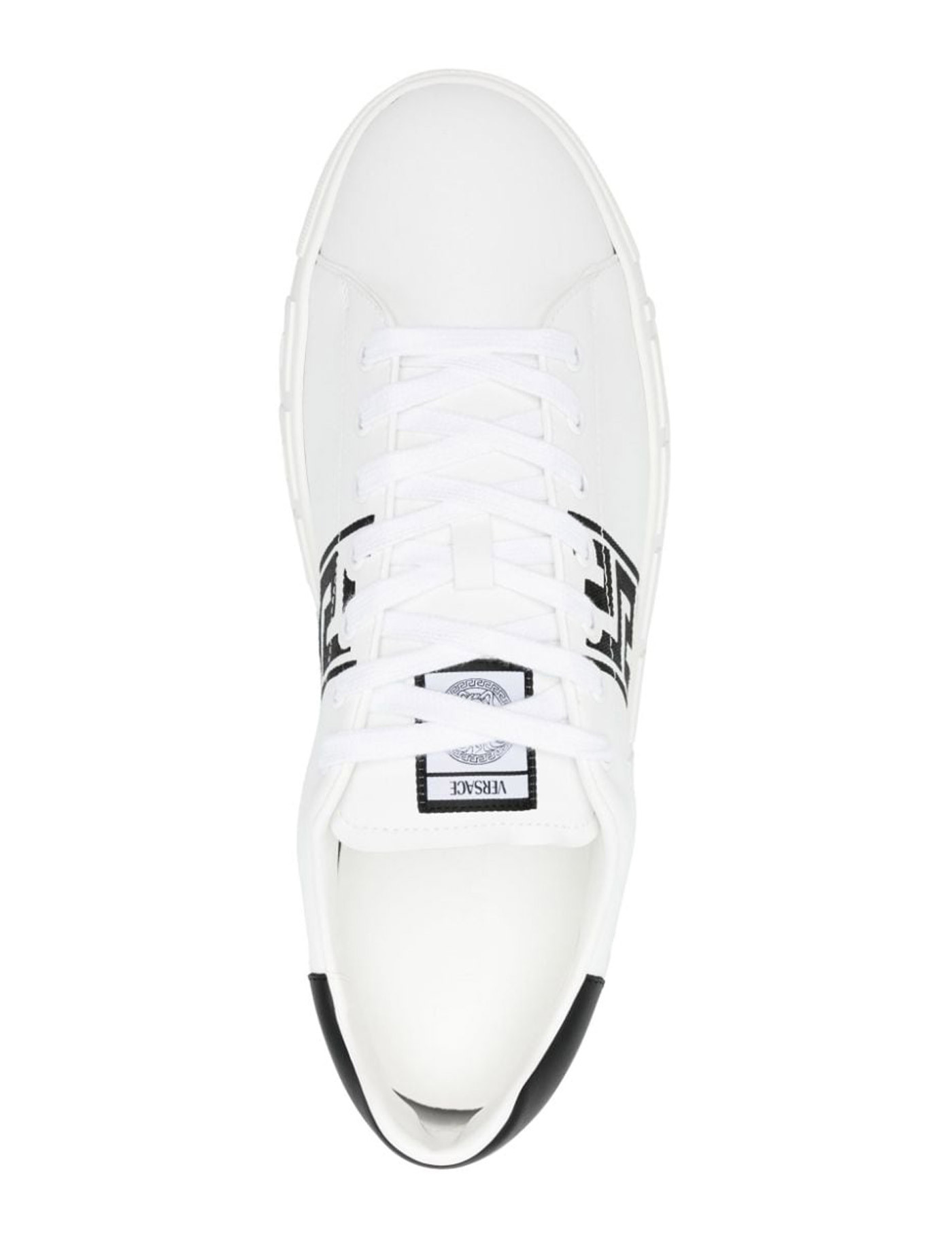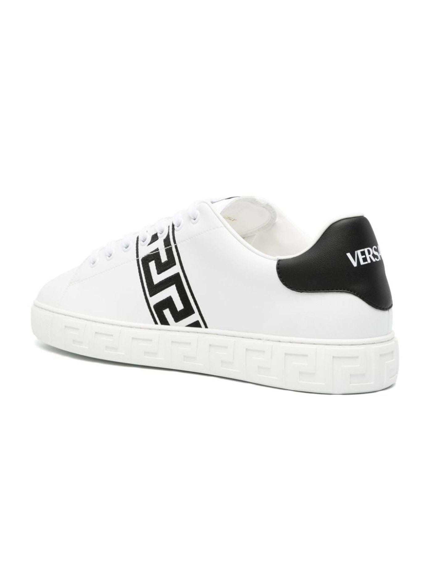 Versace's white and black sneakers crafted from premium calf leather. Iconic black Greca motif. Logo application on the tongue. Black contrasting heel with white logo. Front lace closure. Round toe. Leather insole with logo. Flat rubber sole. If you're seeking uncompromising style and comfort, discover these iconic sneakers, where every step is an expression of unmistakable time. - Versace - Made of calf leather - White - Men's - Characteristic Greca motif