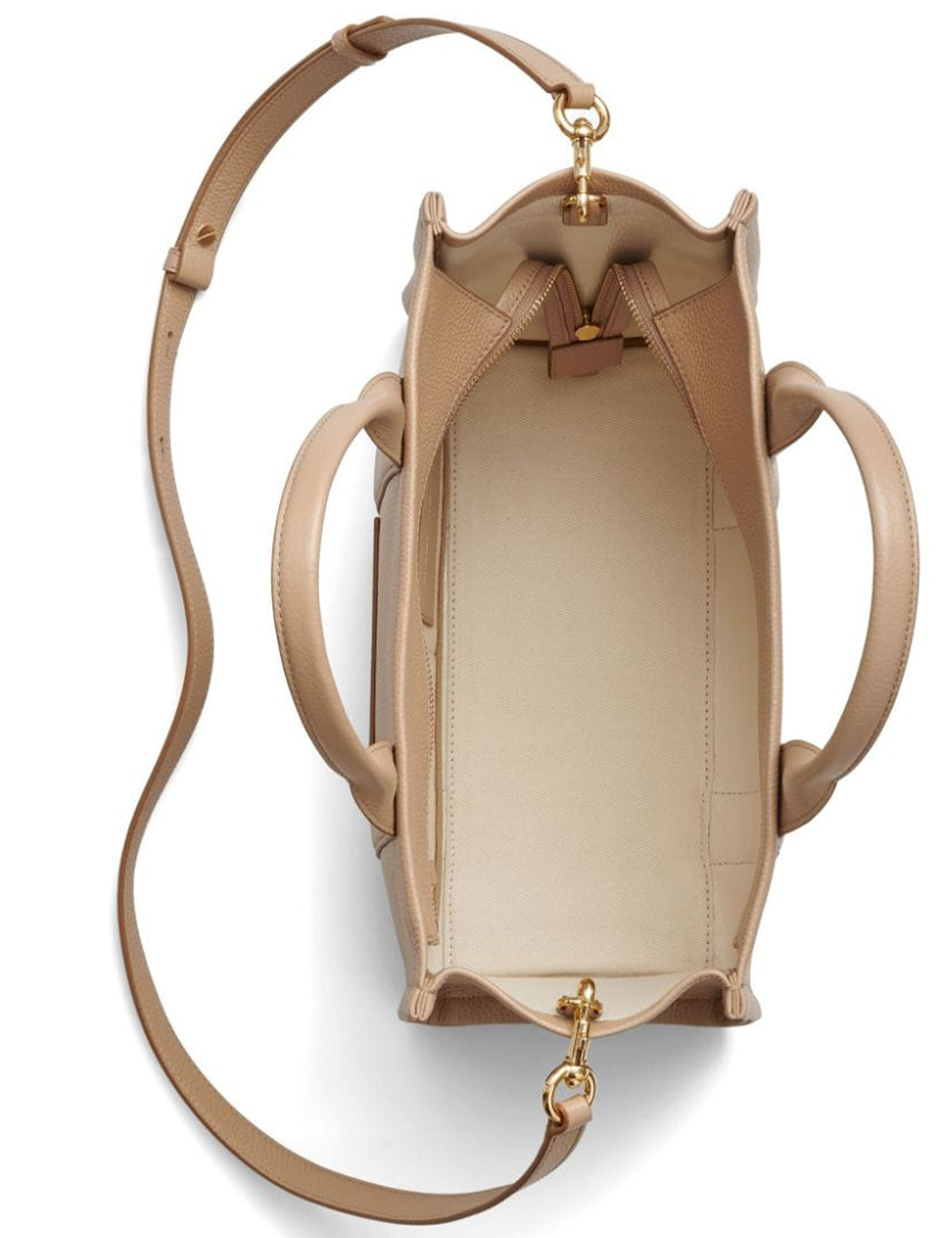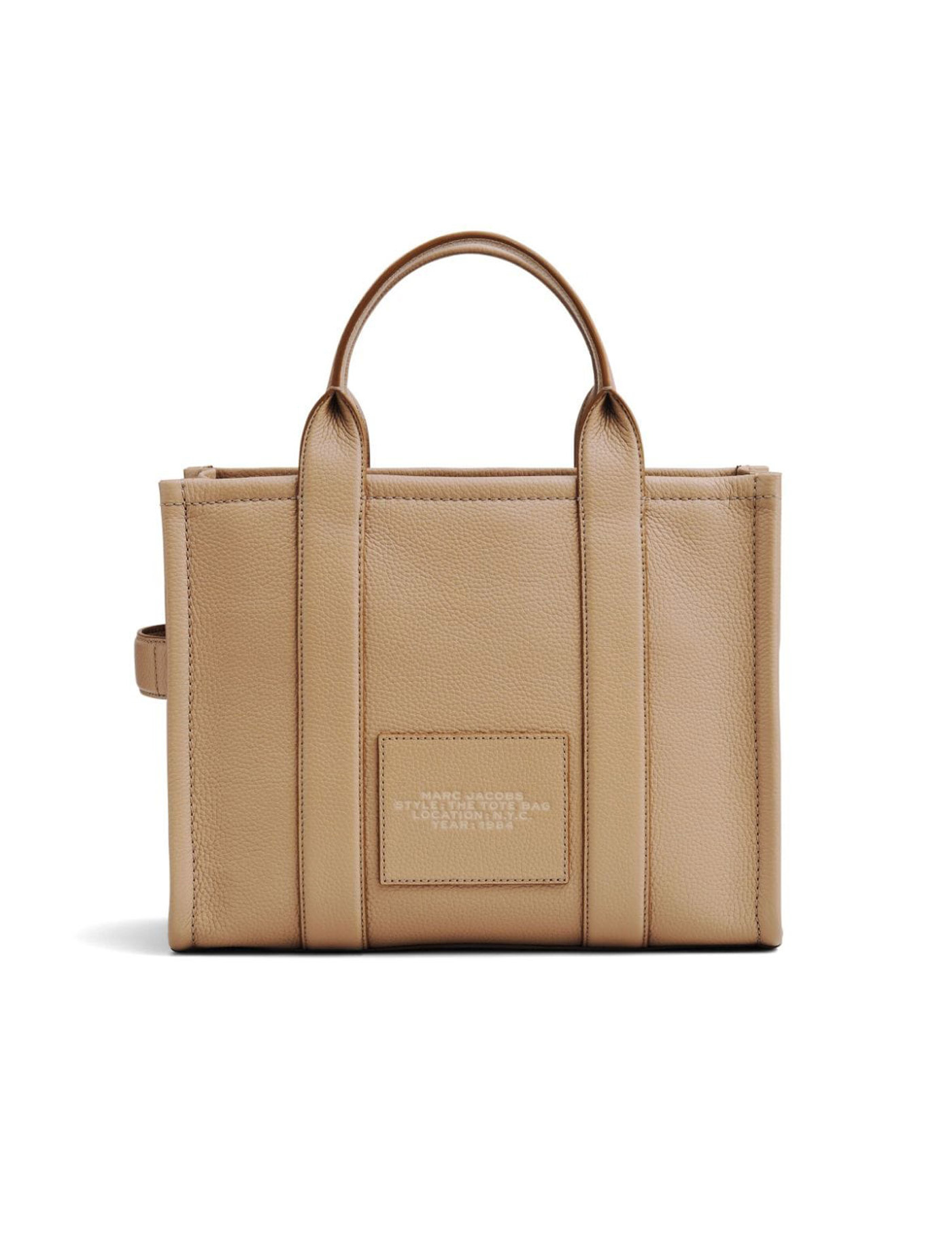 The Leather Medium Tote bag by Marc Jacobs made of camel-colored grained leather. Iconic maxi logo embossed on the front and plate on the back. Interior equipped with slip pockets, zip closure and matching adjustable and removable shoulder strap. Golden metal details. Measurements 34x15x27 cm.