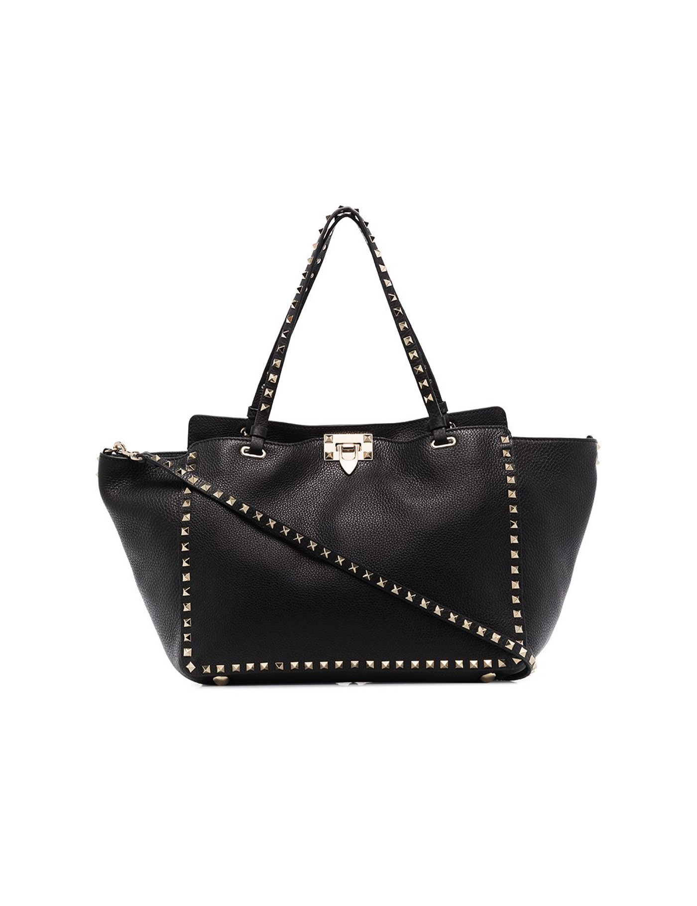 black calf leather pebbled texture gold-tone Rockstud embellishment gold-tone hardware open top turn-clasp fastening two top handles detachable shoulder strap suede lining main compartment debossed internal logo internal zip-fastening pocket This piece comes with a certificate of authenticity.