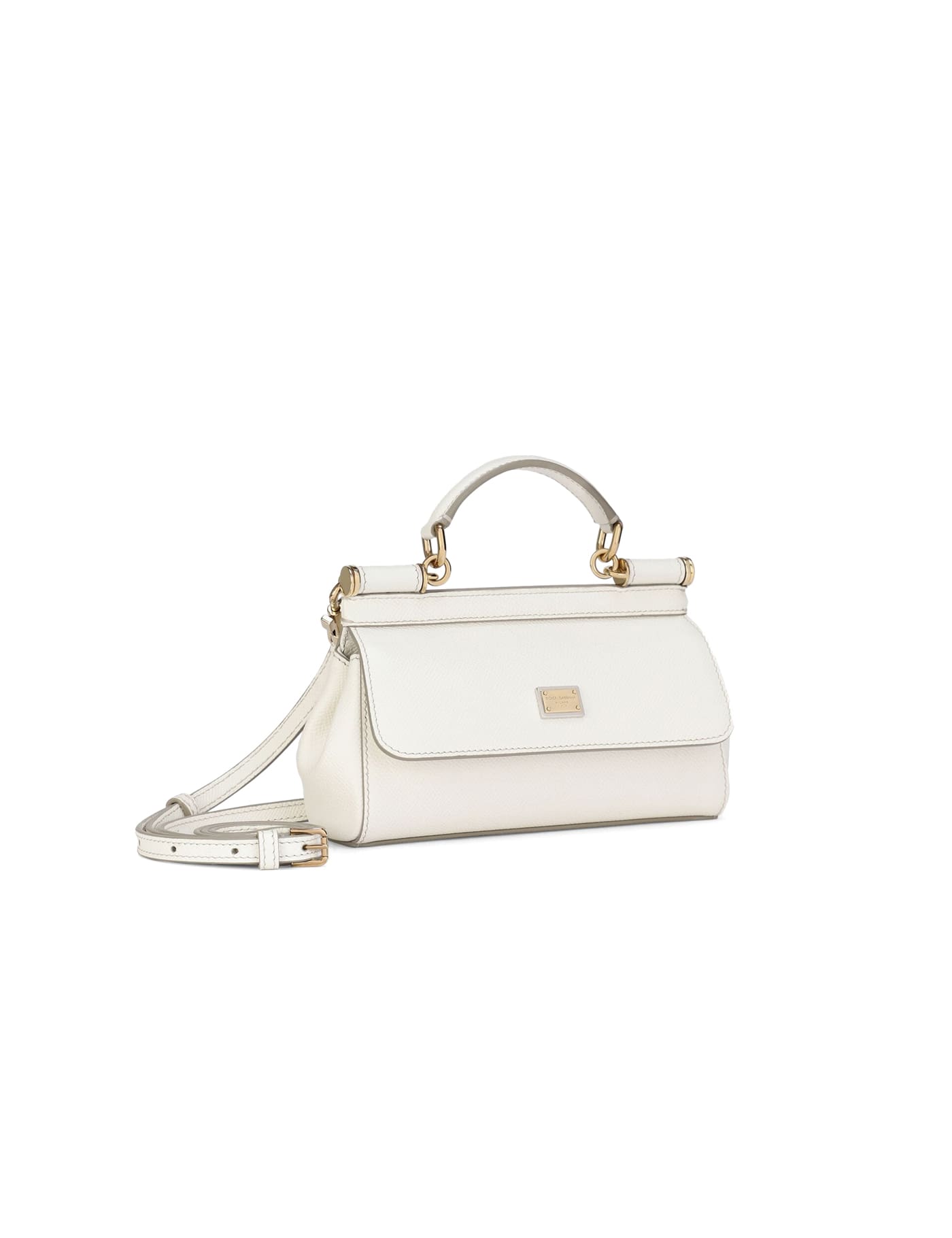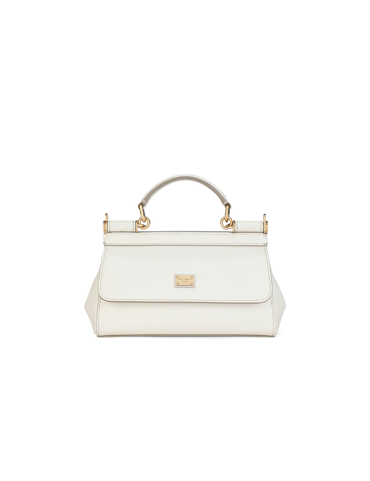 White handbag in grained leather. 1 handle. Adjustable and removable leather shoulder strap. One interior compartment. Flap closure with buttons. Gold metal logo plaque on front. Width:19 Height:11 Depth:6