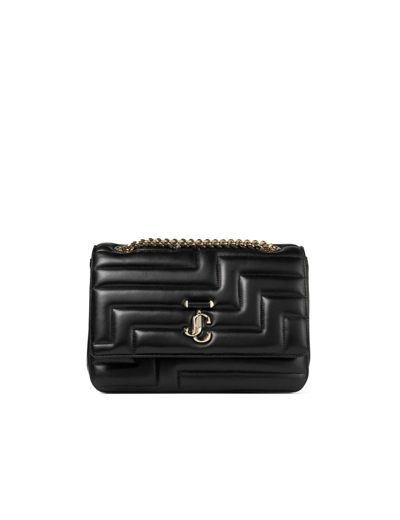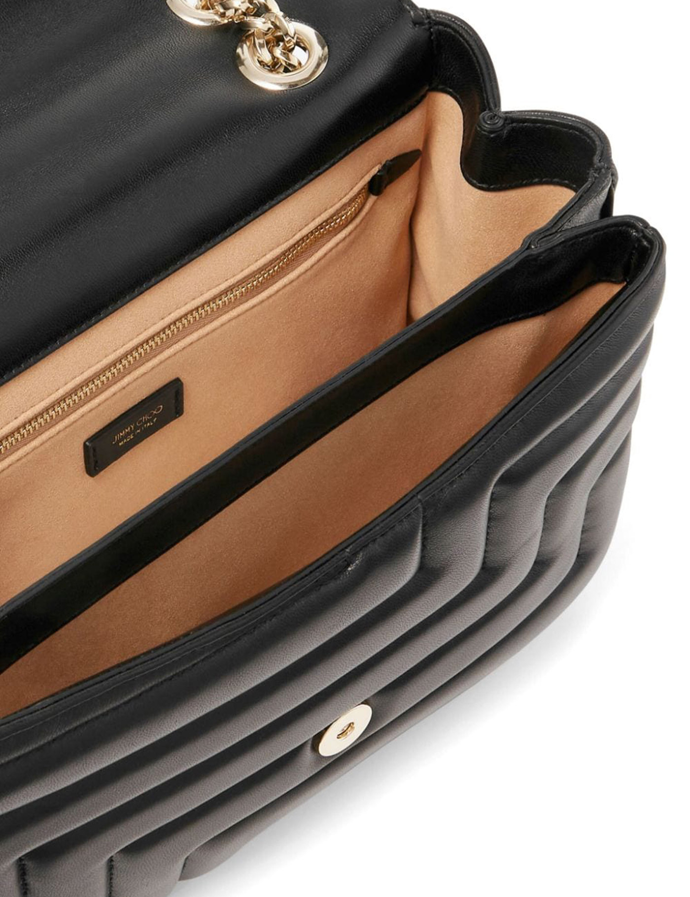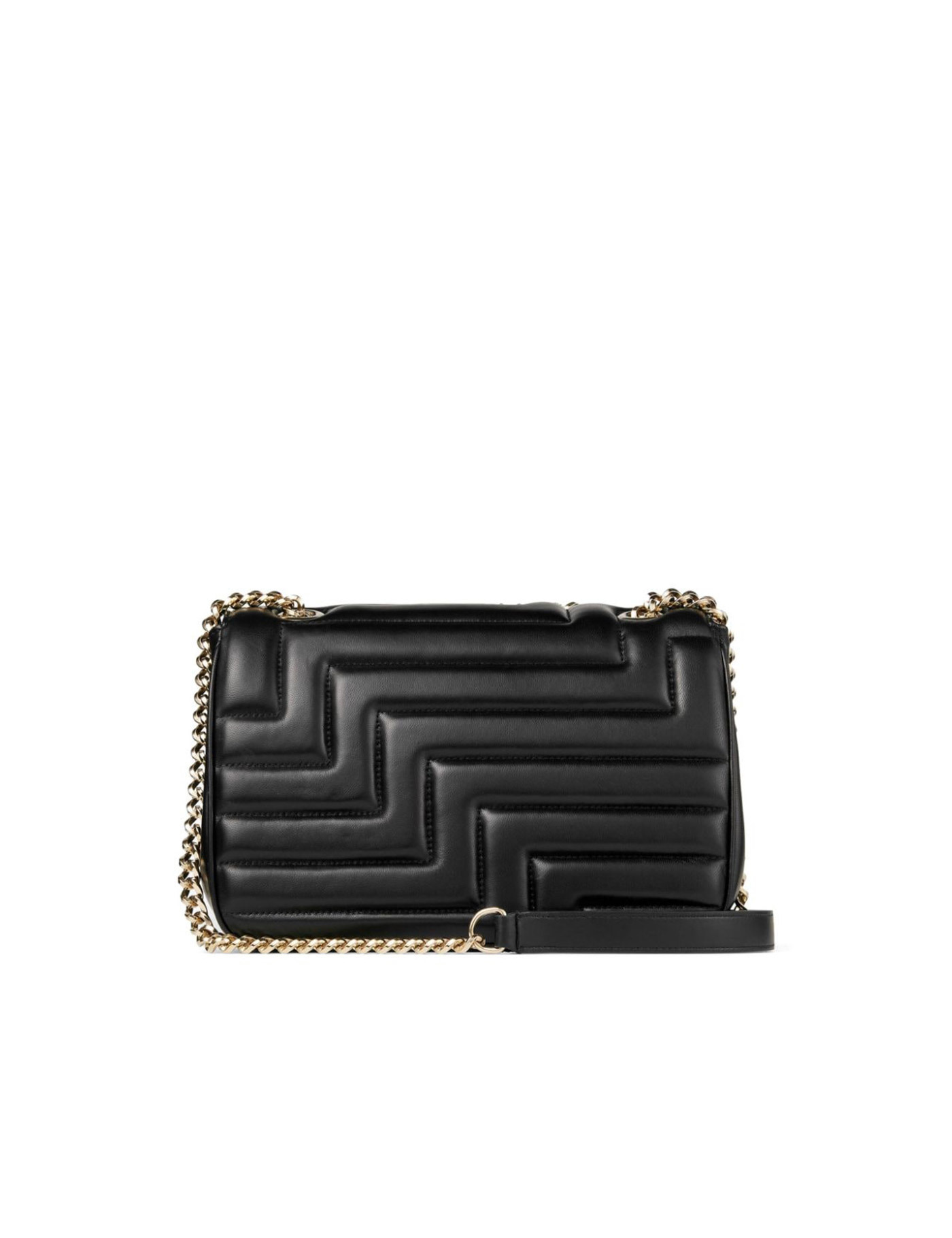 Black nappa leather matelassé effect logo plaque gold-tone hardware foldover top with press-stud fastening adjustable leather and chain-link shoulder strap partitioned compartment internal zip-fastening pocket