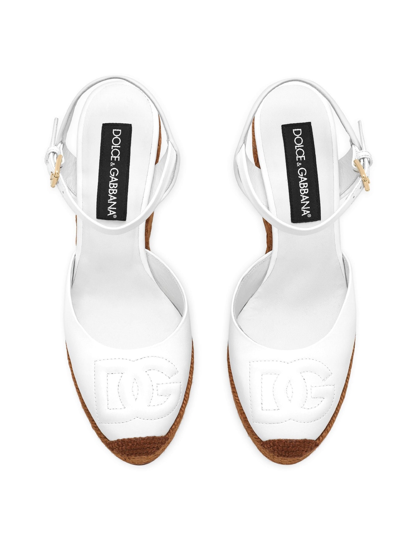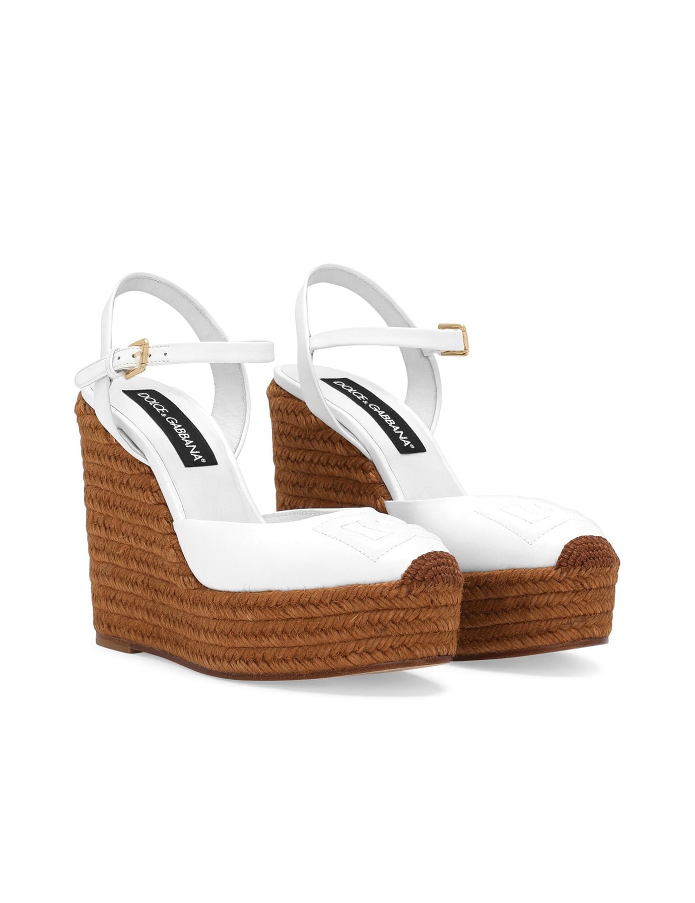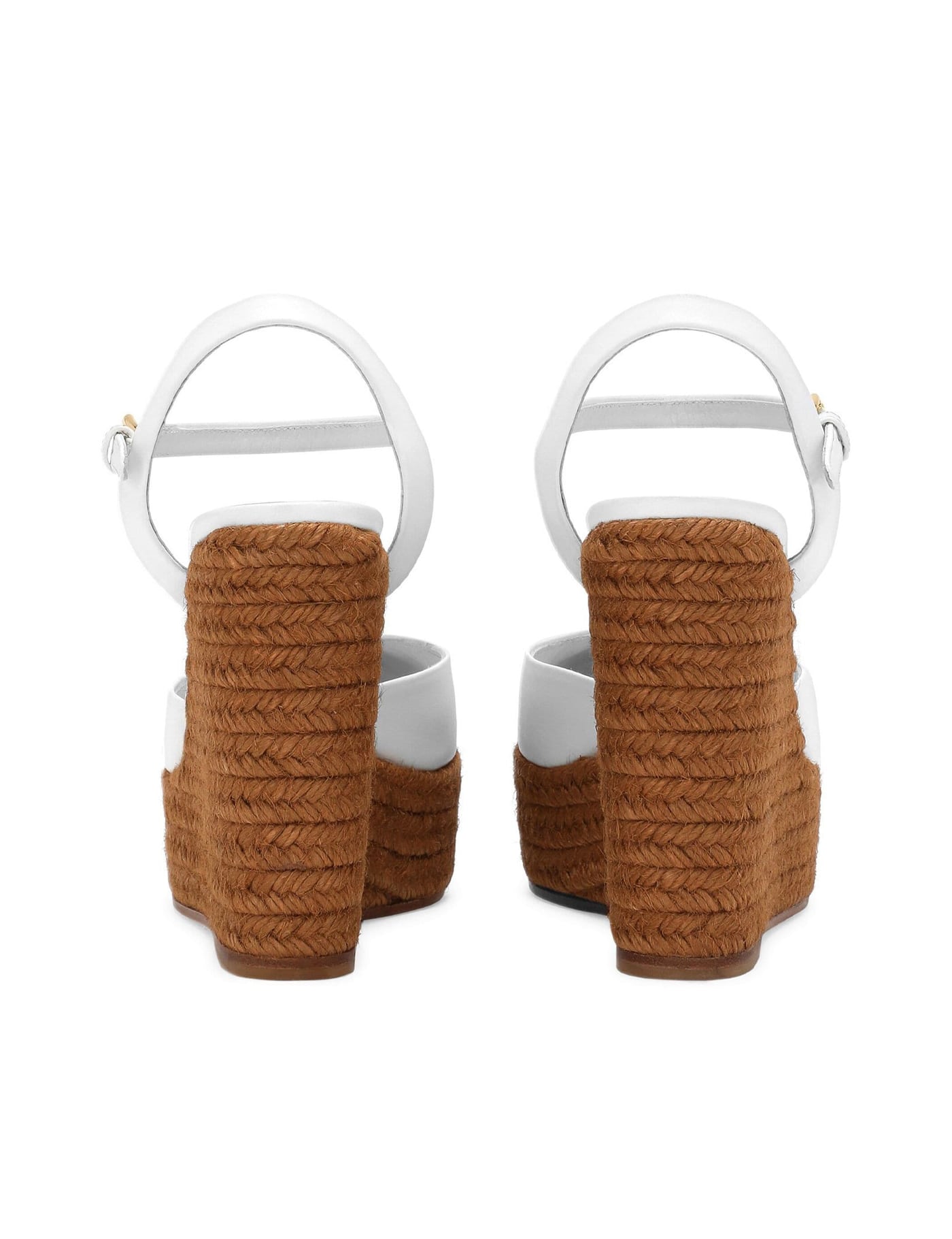 Optical white/brown goatskin embroidered logo to the front branded insole contrasting toecap almond toe buckle-fastening ankle strap 90mm braided raffia wedge heel rubber sole leather lining