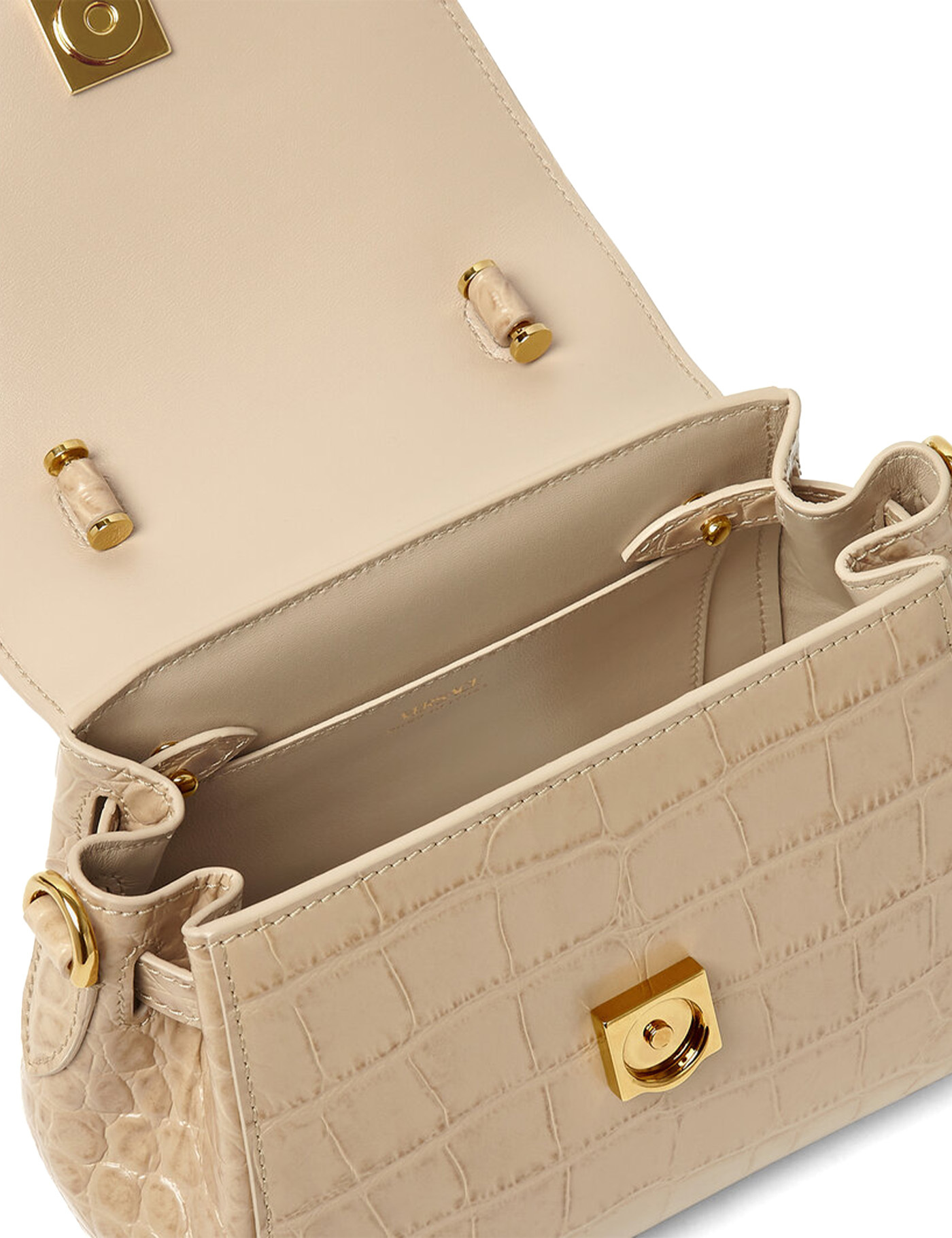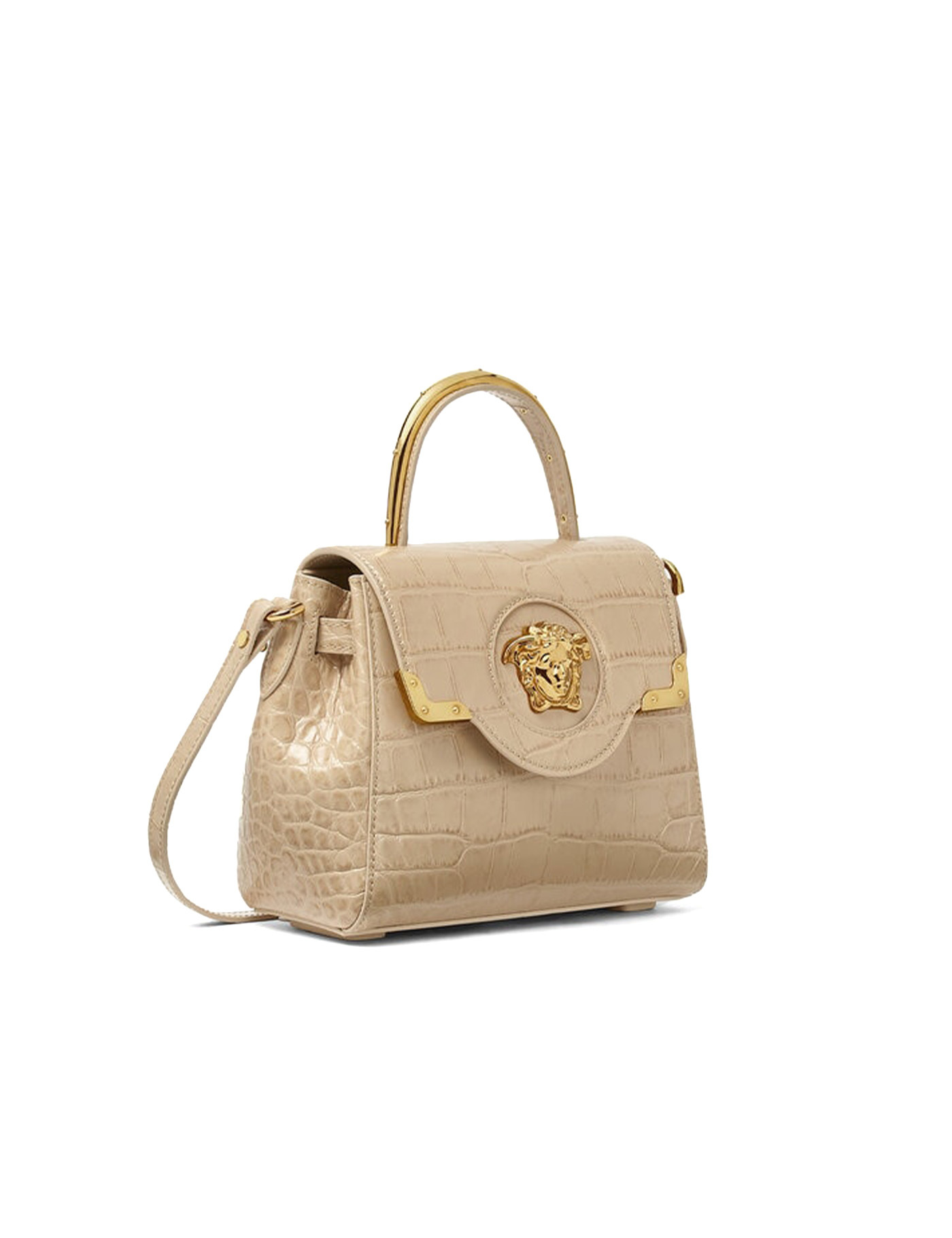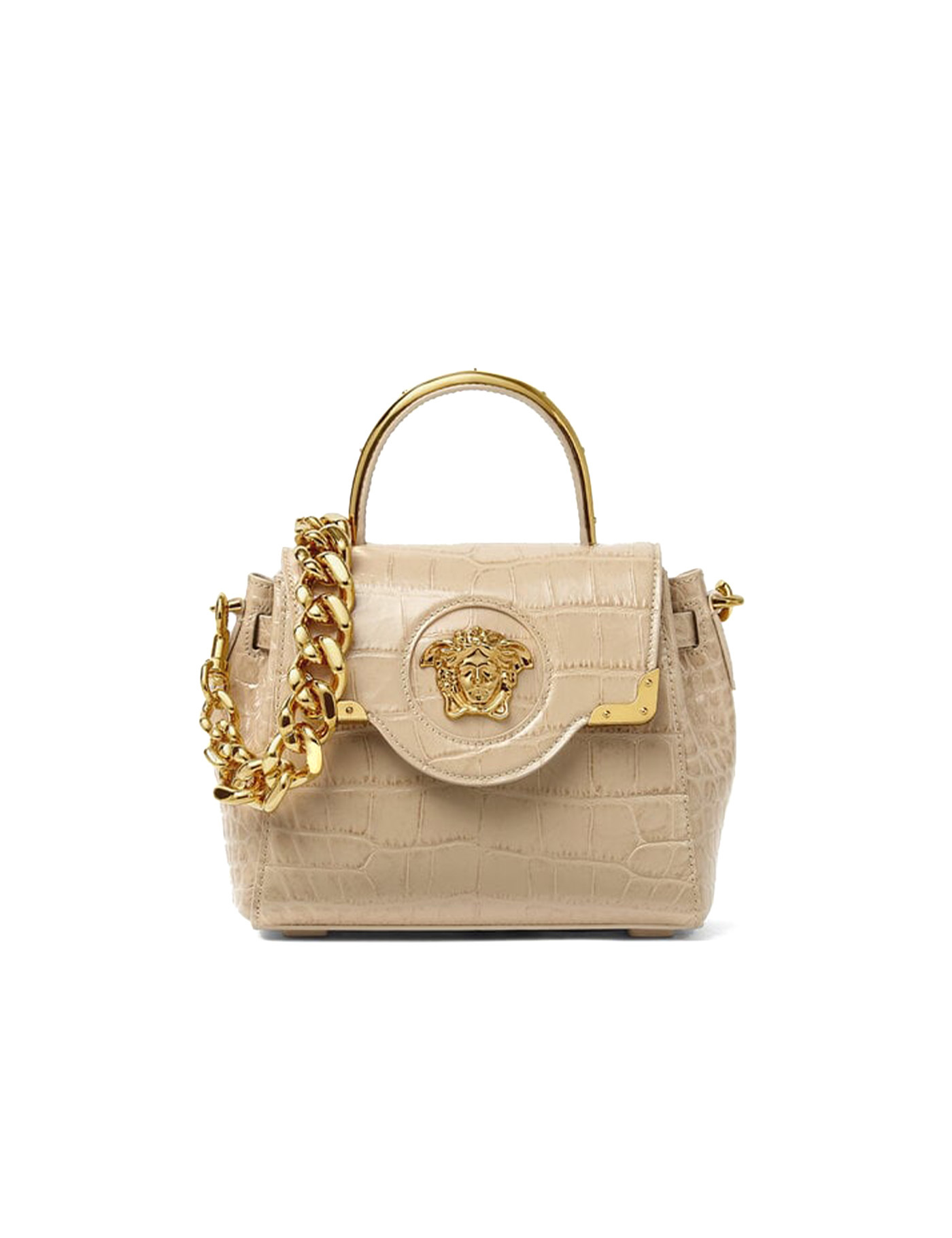 Small 'La Medusa' coconut print leather handbag with magnetic flap closure, front metal logo appliqué, top handle, removable chain shoulder strap, adjustable and removable leather shoulder strap