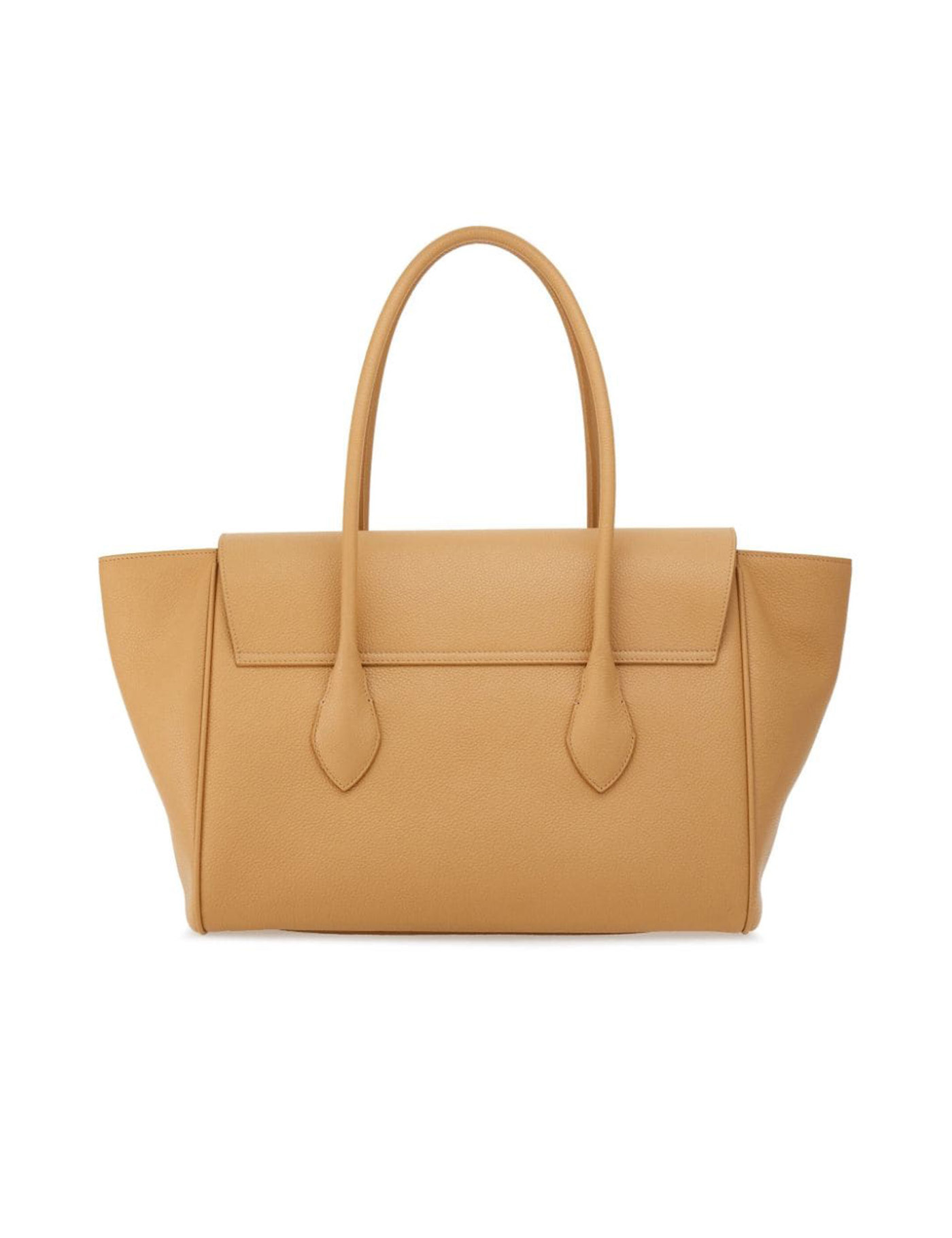 Light brown leather logo tag logo print to the front two rolled top handles foldover top with magnetic fastening main compartment internal zip-fastening pocket