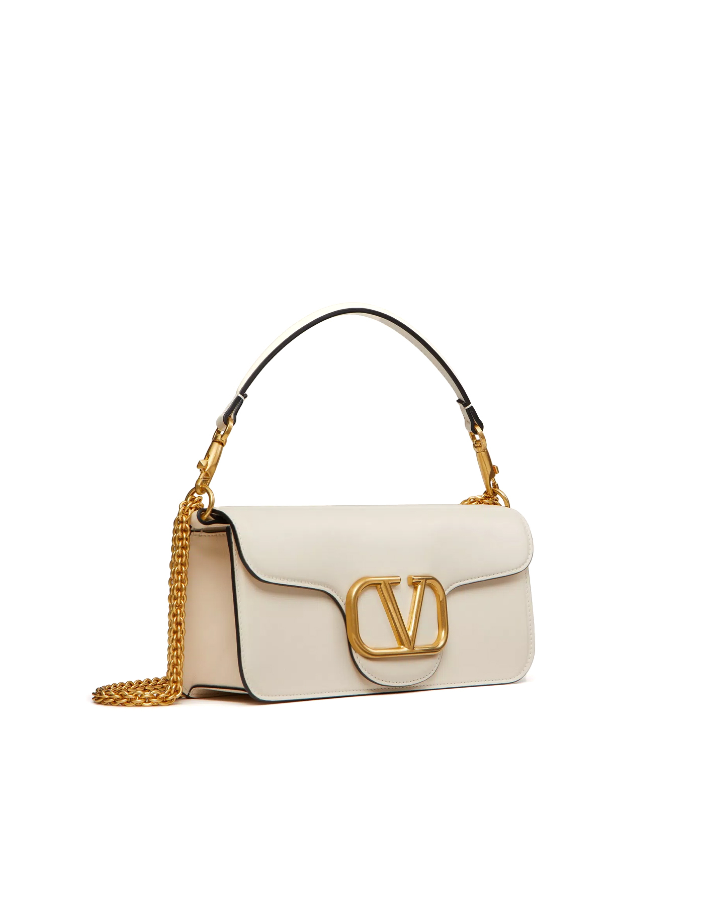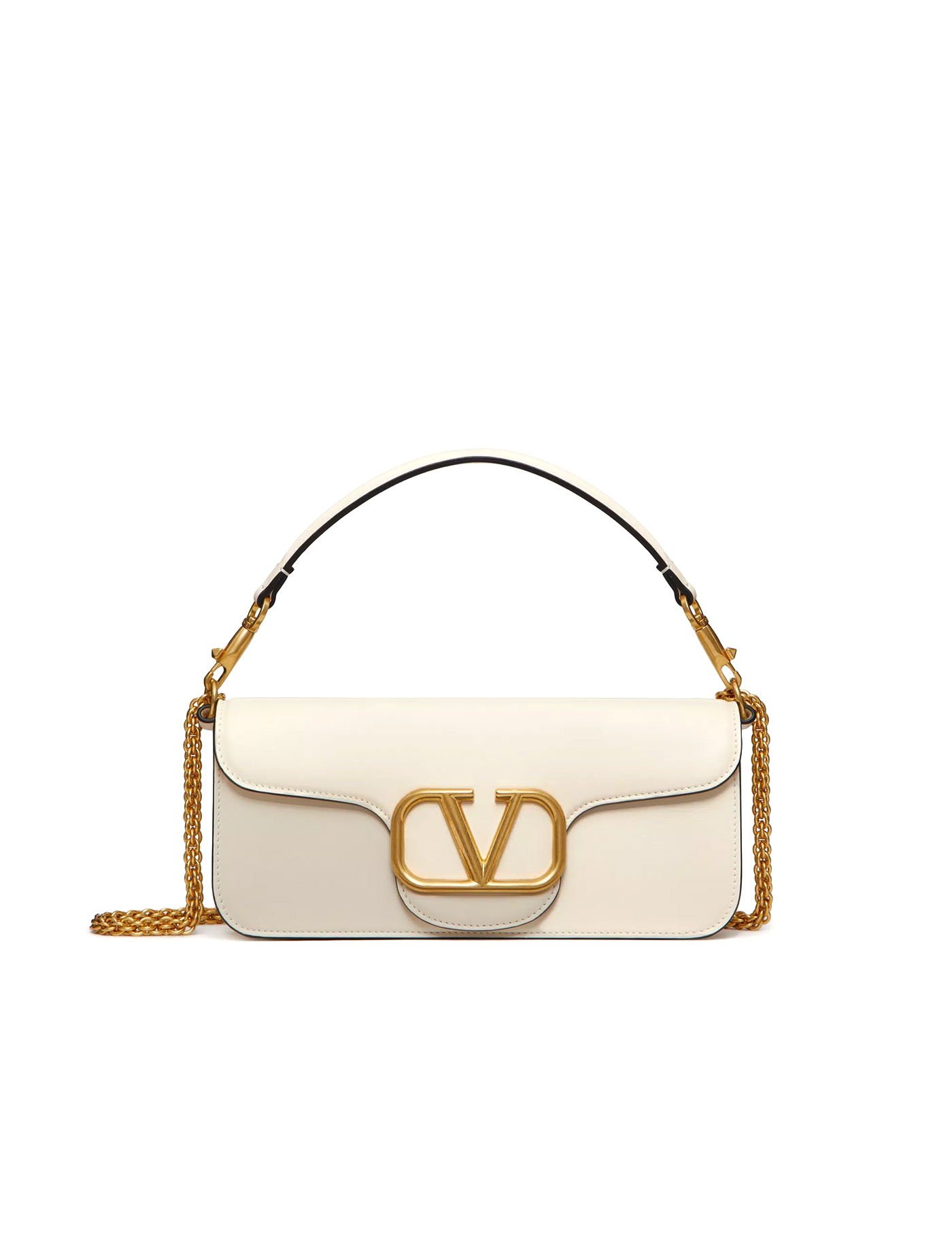 VALENTINO GARAVANI LEATHER LOCÒ HANDBAG, REMOVABLE LEATHER TOP HANDLE VIA SNAP HOOKS, FRONT MAGNETIC FLAP CLOSURE, THREE-DIMENSIONAL PLAQUE WITH ICONIC BRAND VLOGO EMBOSSED ON FRONT, REMOVABLE CHAIN SHOULDER STRAP.