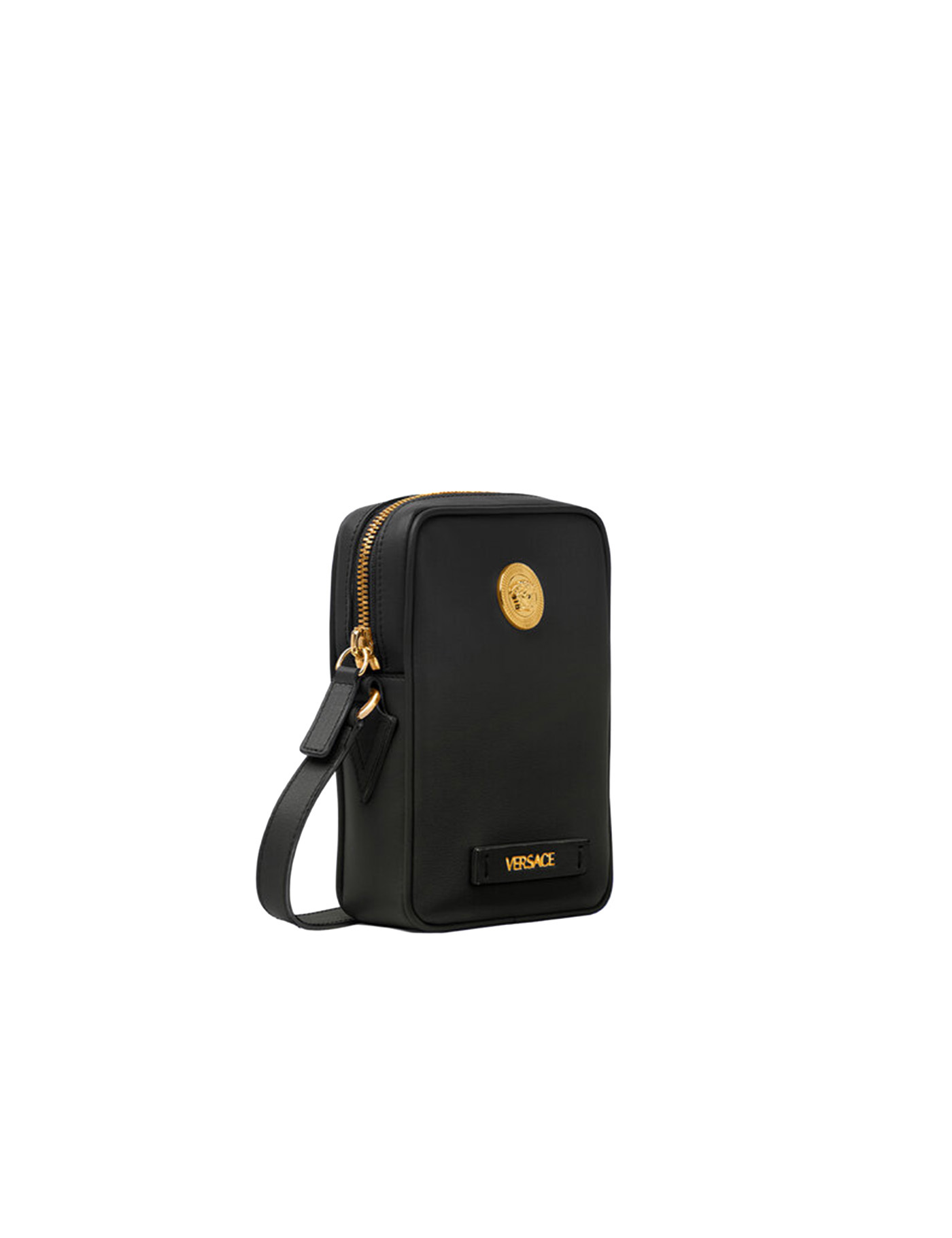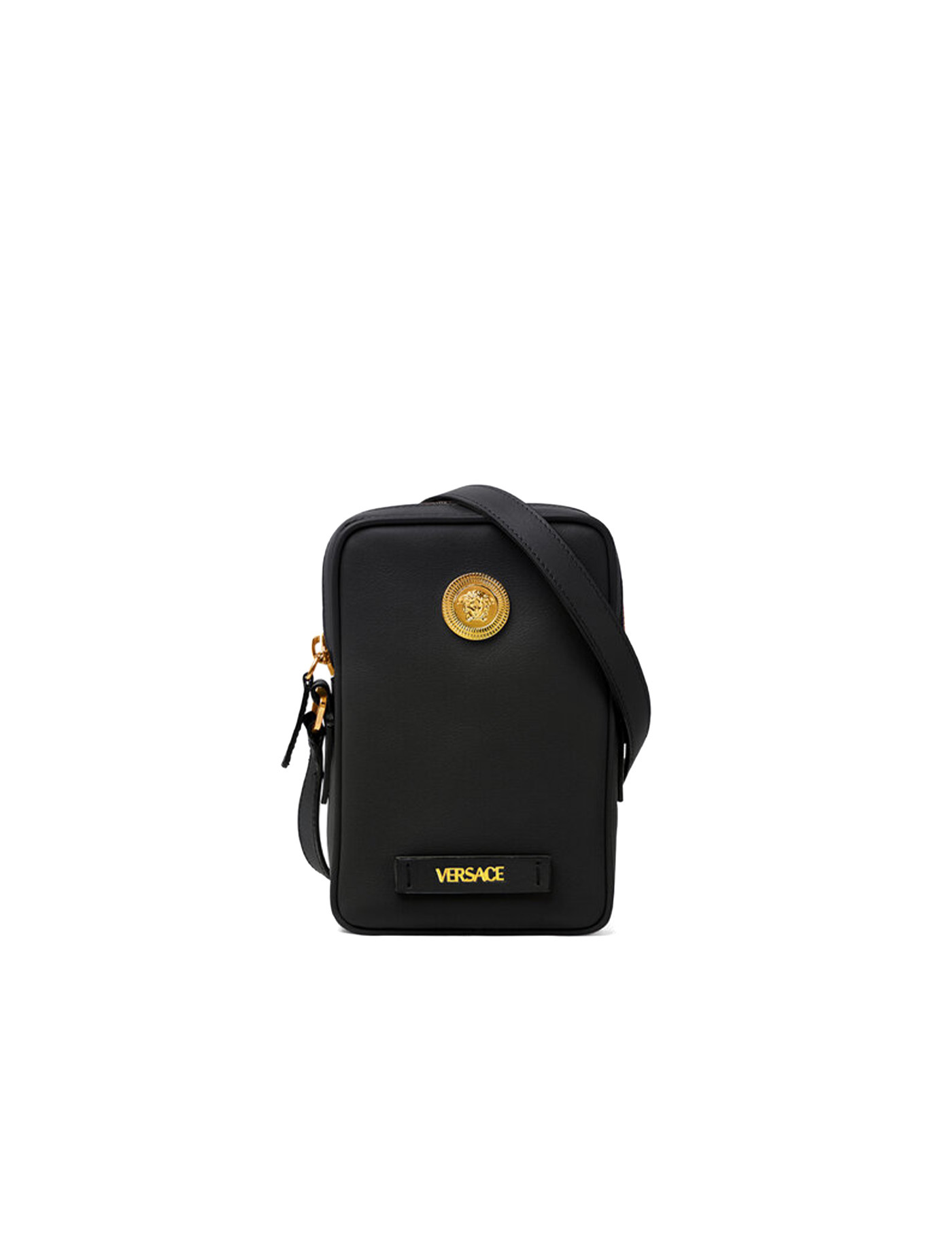 Small leather 'Medusa Biggie' shoulder bag, with gold metal elements, a removable and adjustable shoulder strap, and a three-sided top zipper closure