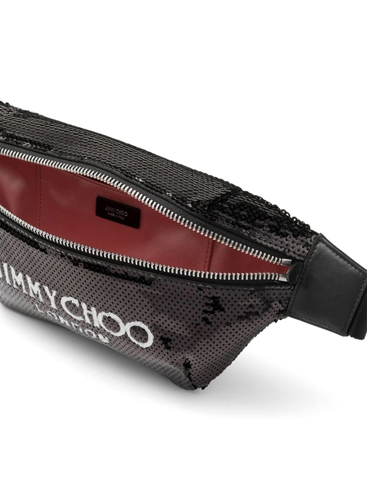 Finsley beltpack by Jimmy Choo crafted in sequins finished with contrasting iconic lettering logo print at front. Techno silk lining, zippered main compartment with one open pocket, additional zippered pocket at back. Fabric adjustable belt with leather details, ruthenium-finished metalware.