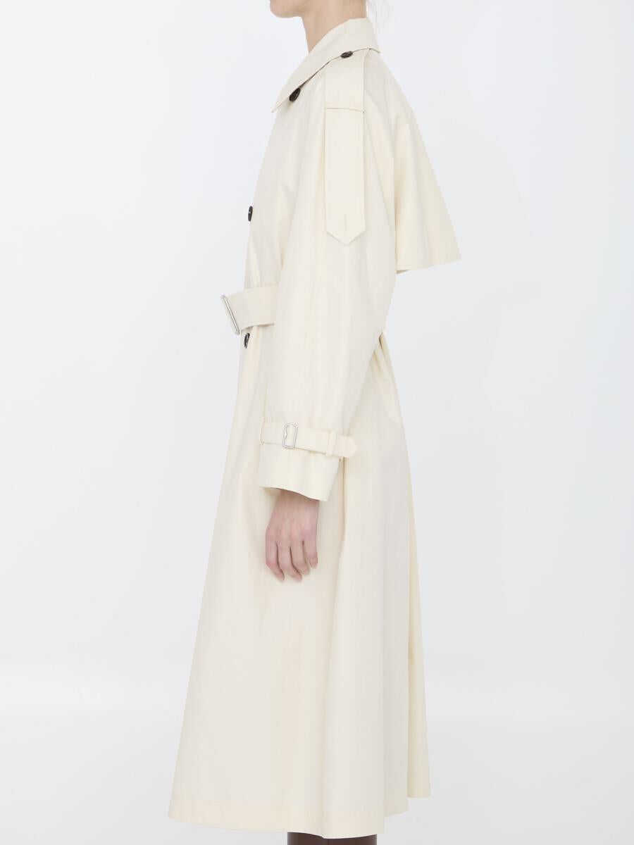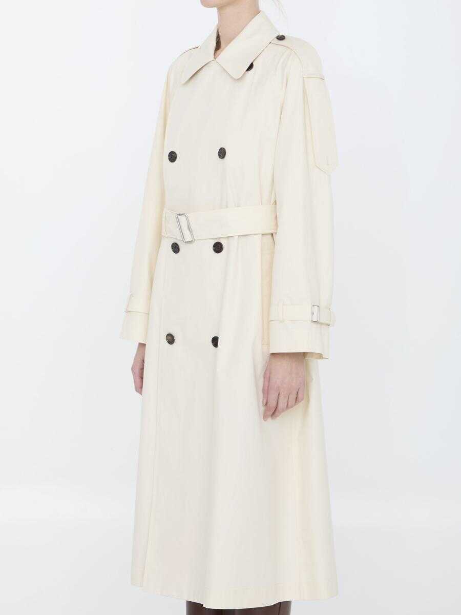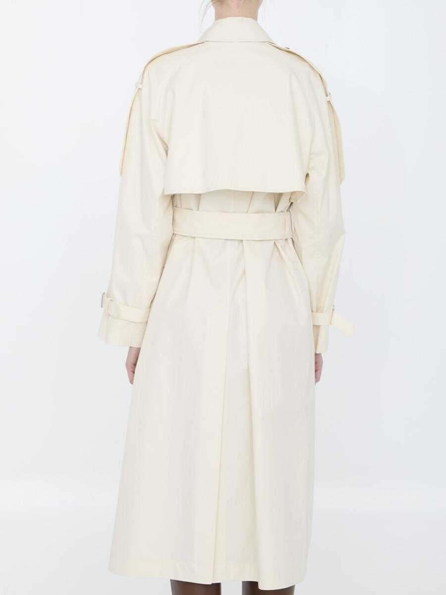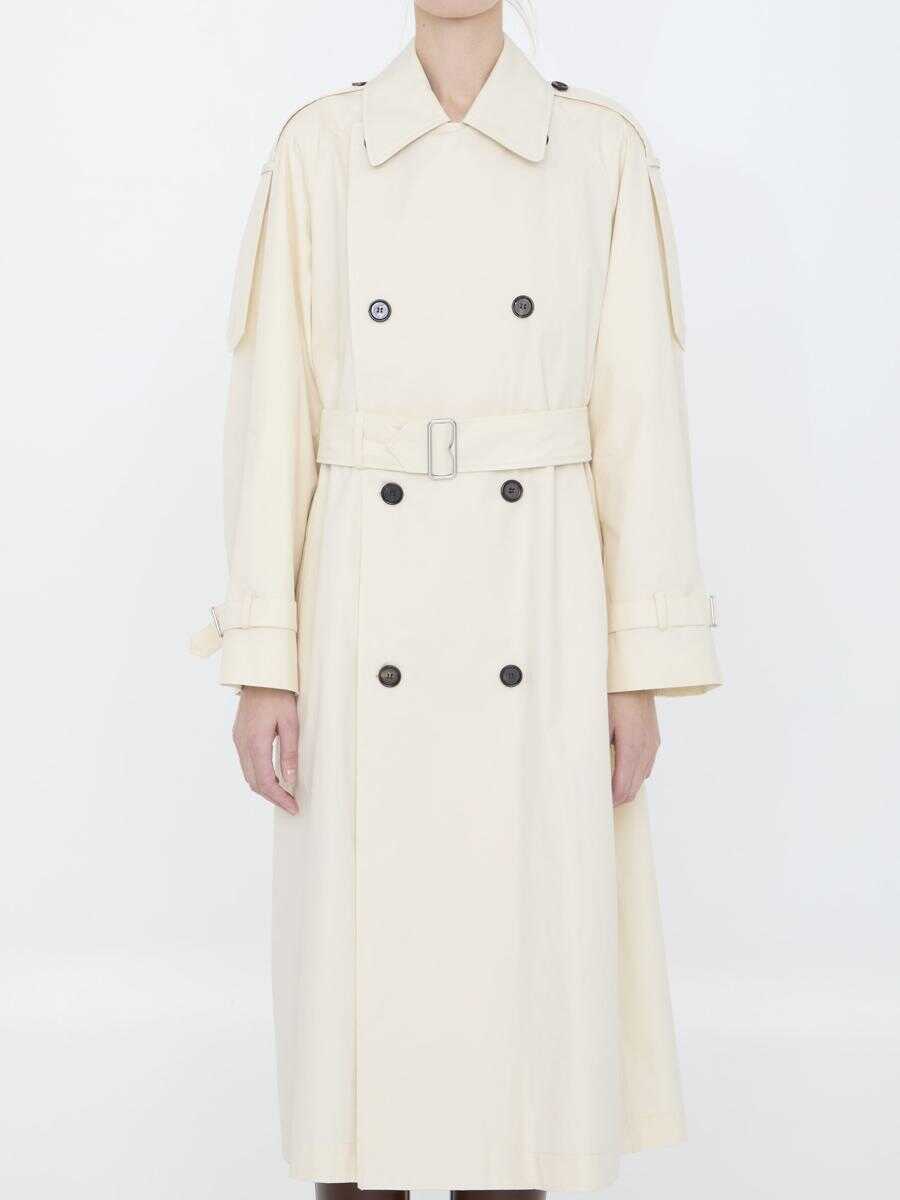 Long trench in beige cotton gabardine. It features double-breasted button closure, epaulets, belt with B-shaped buckle, two side welt pockets, belted cuffs and back vent. Oversized fit.