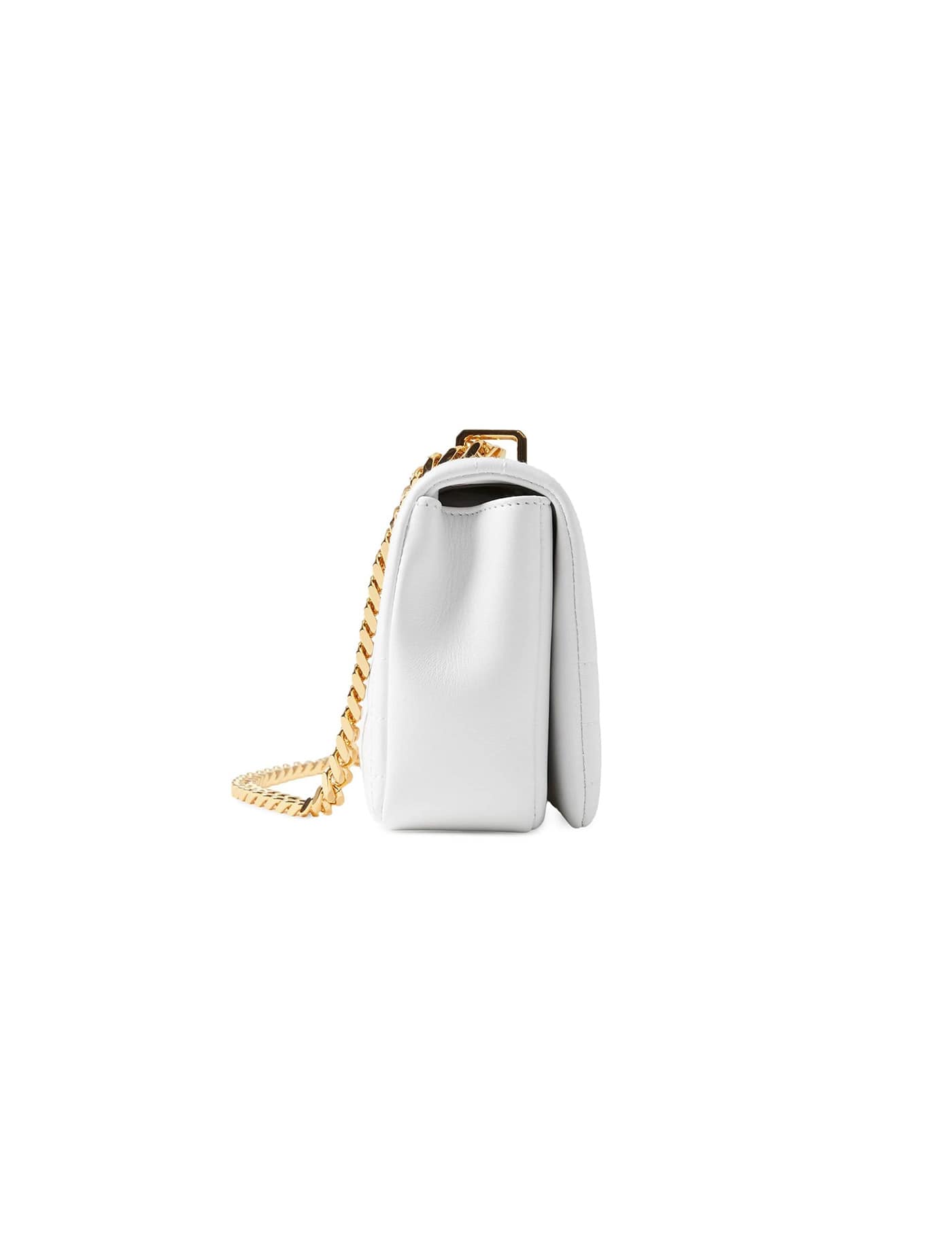 - Material: 100% lambskin leather - Color: white - Interior one pouch pocket - Gold metal trim - Other details: logo applied on closure - Adjustable chain shoulder strap - Magnetic closure - Made in Italy - Dust bag - Item number: 8066168A1462 - Size: 17 x 10 x 3.5 cm