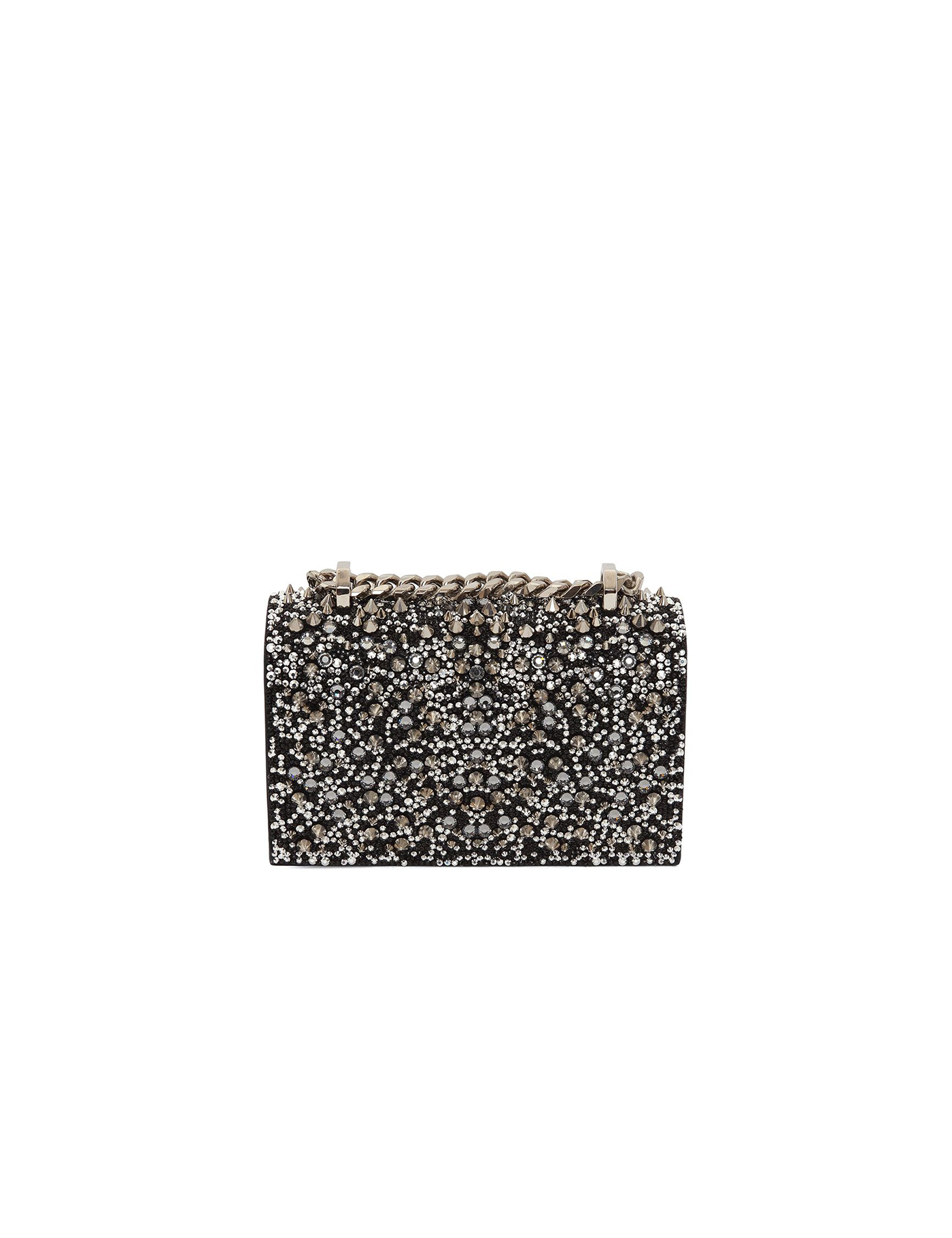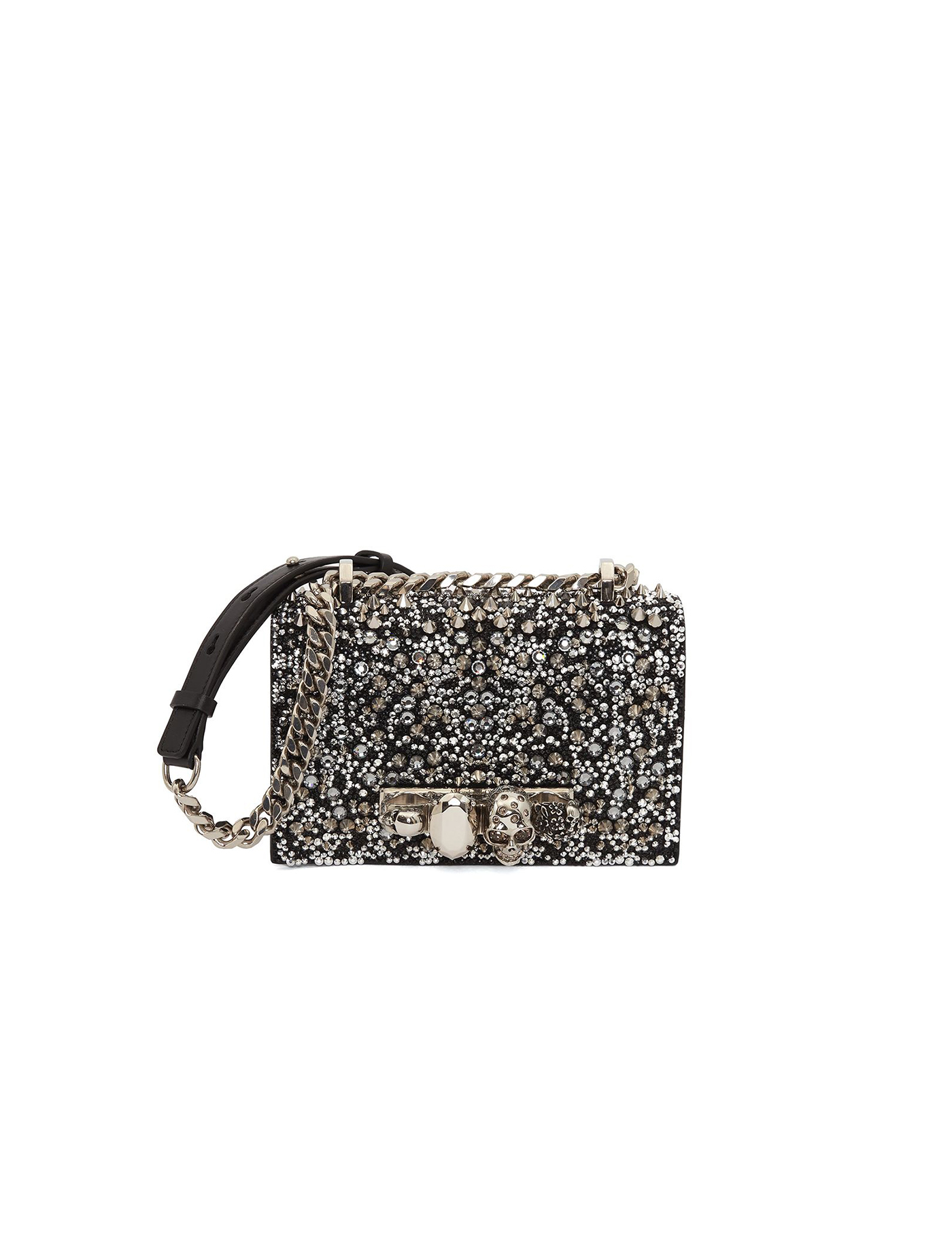 Black leather shoulder bag from Alexander McQueen featuring silver-tone hardware, crystal embellishment, stud embellishment, gemstone detailing, knuckleduster design, leather and chain-link shoulder strap, foldover top with magnetic fastening, debossed logo, main compartment and internal slip pocket.