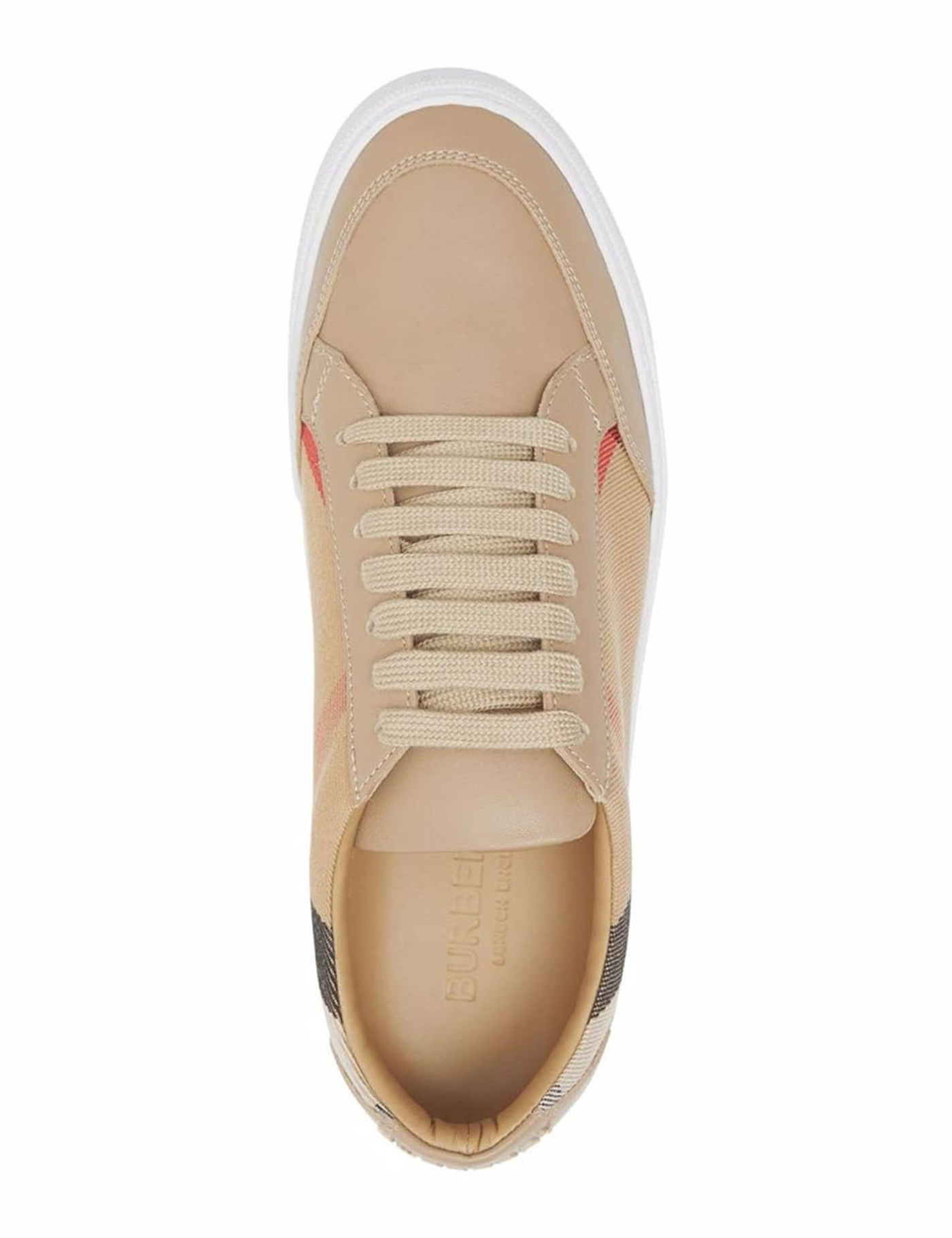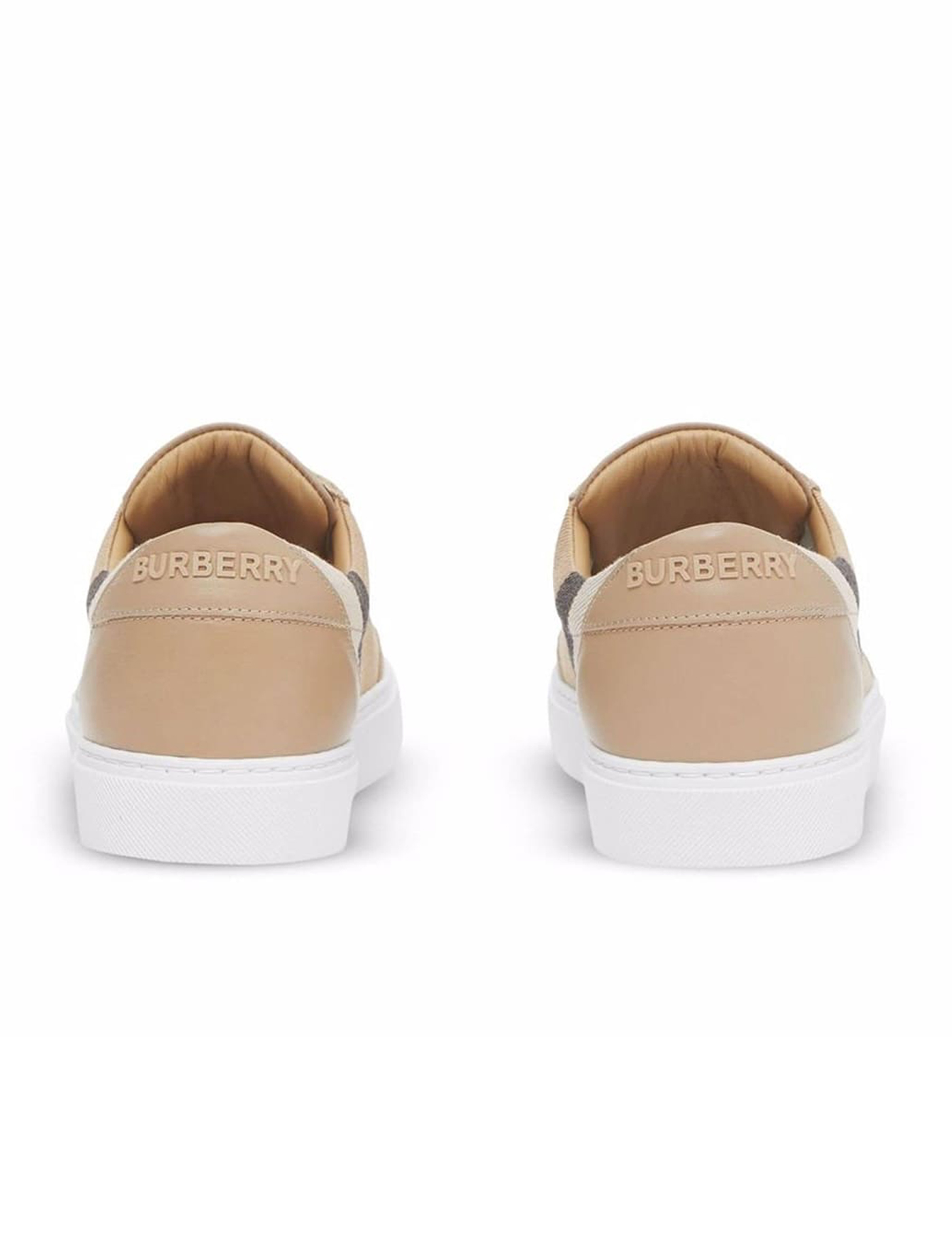 Tan calf leather House Check low-top sneakers from BURBERRY featuring Vintage Check pattern, front lace-up fastening, round toe, panelled design, branded heel counter and flat rubber sole.