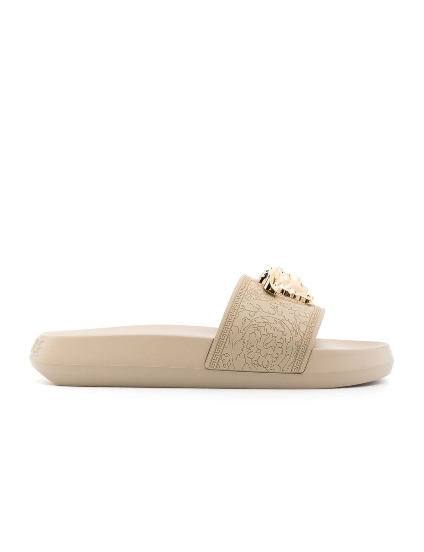 Beige gold-tone medusa plaque detail signature greca detailing logo at the sole open toe single toe strap moulded footbed flat rubber sole this piece comes complete with a protective dust bag.