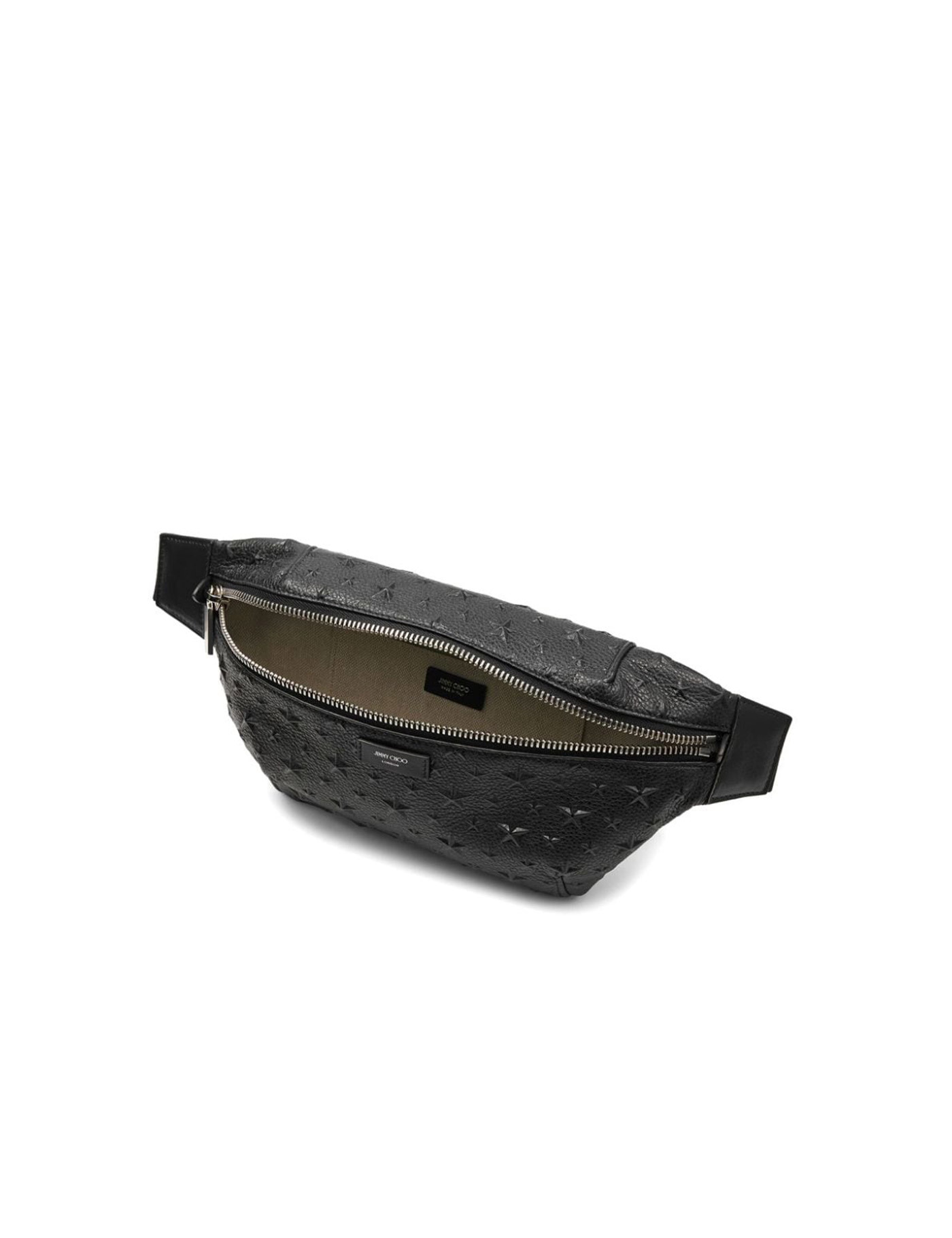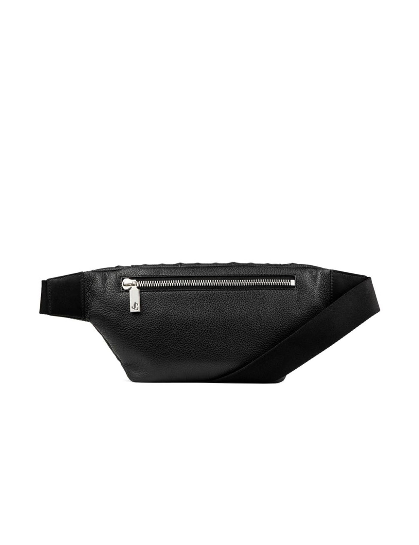Black calf leather grained texture embossed star detail logo patch to the front front zip fastening adjustable waist strap main compartment rear zip-fastening pocket internal slip pocket internal logo patch full lining