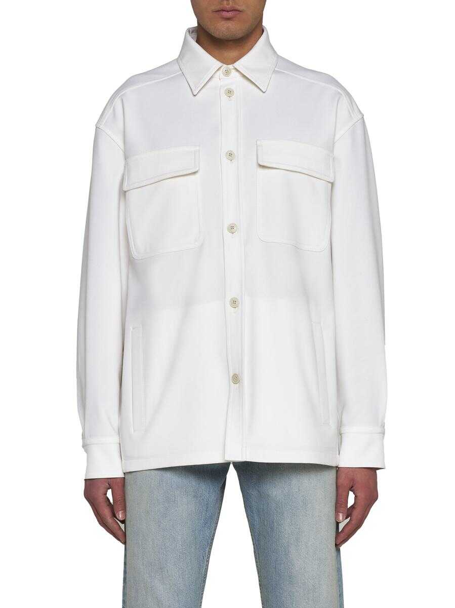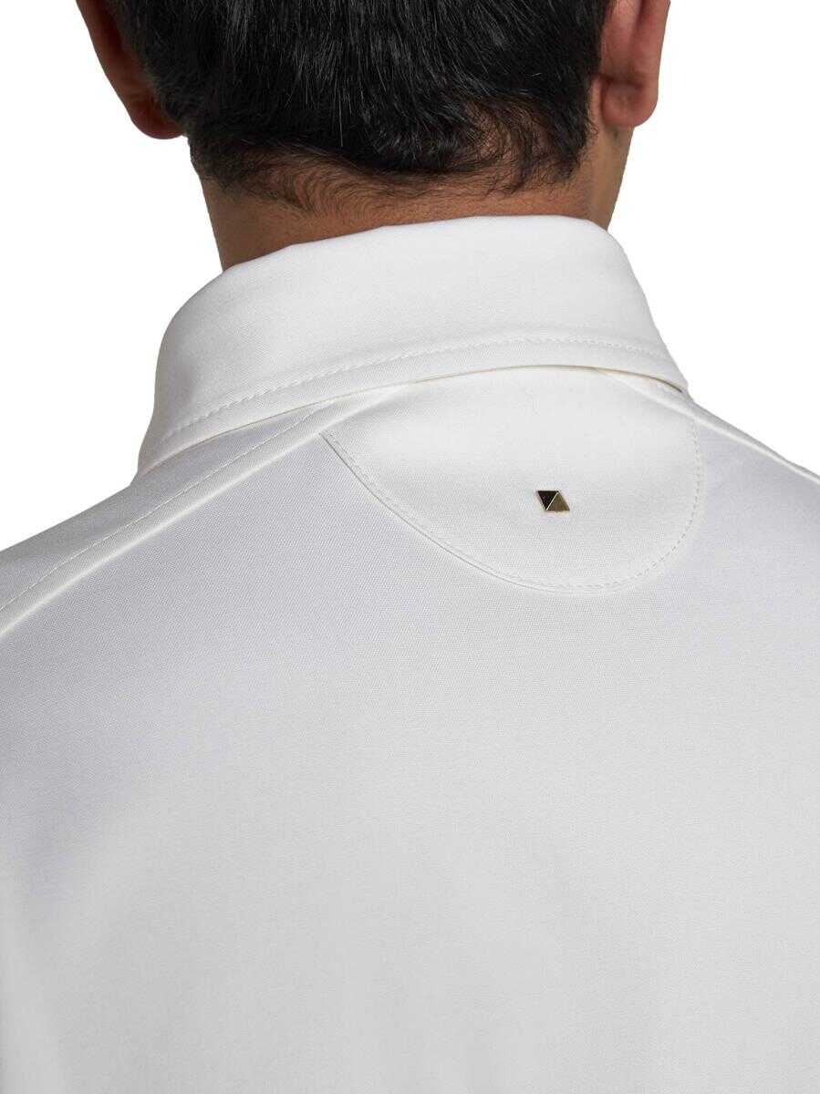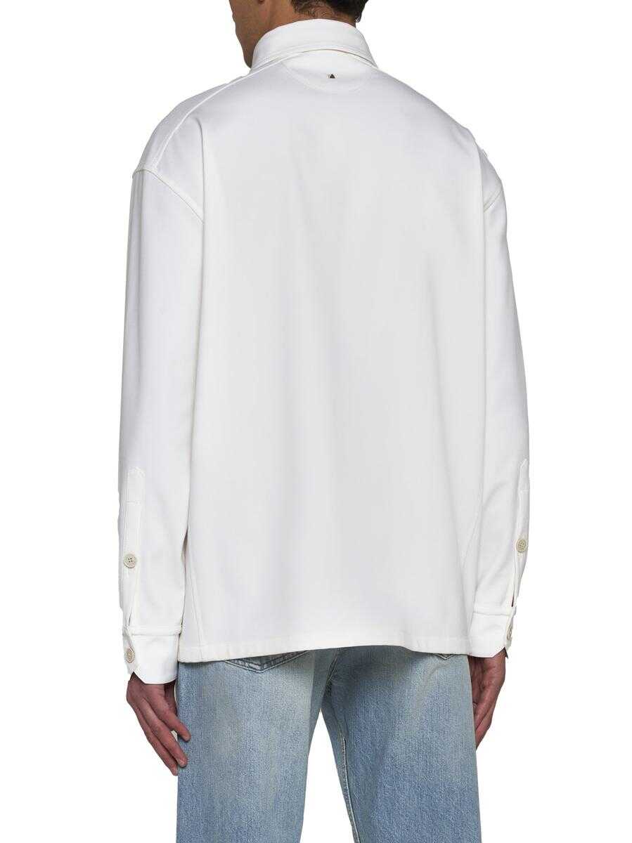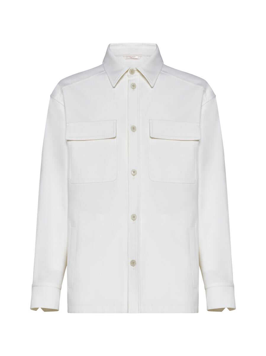 Valentino’s ivory virgin wool overshirt featuring a pointed collar, front and cuff buttoning, dropped shoulders, chest flap pockets, side pockets and iconic stud on the back. Model wears shoes and accessories from Valentino Garavani.