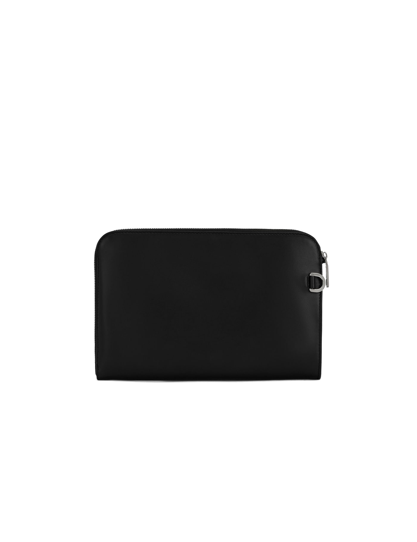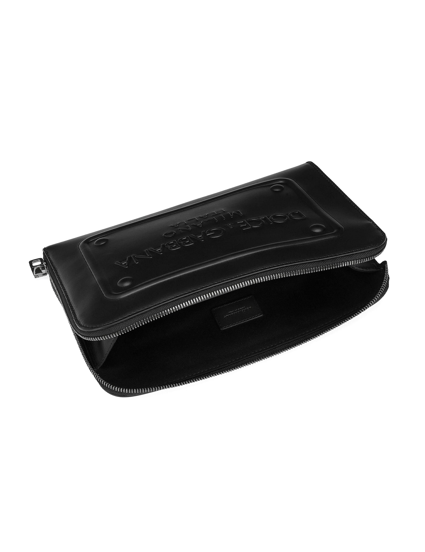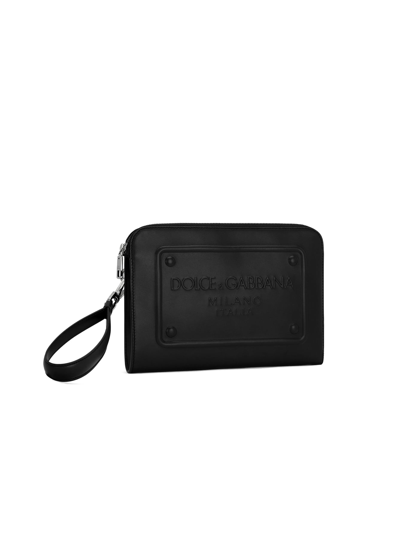 Dolce & Gabbana pouch made of leather with lettering logo with three-dimensional effect. Zipper closure, lined interior with two open pockets and detachable wrist handle. Ruthenium-finished metalware.