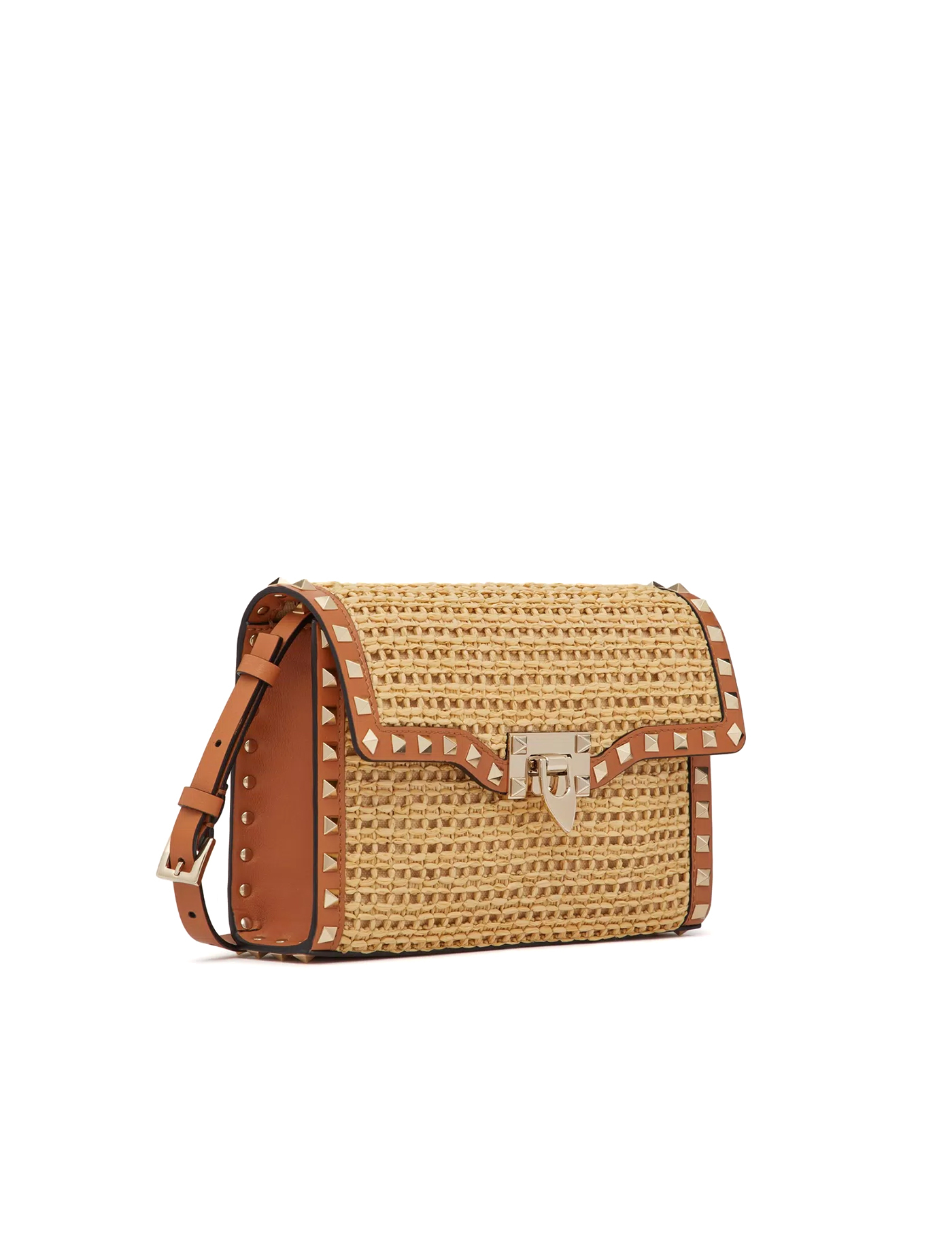 beige/brown straw interwoven design signature Rockstud embellishment logo patch to the rear leather trim foldover top with clasp fastening adjustable shoulder strap main compartment internal slip pocket debossed internal logo full lining metal feet gold-tone hardware This piece comes complete with a protective dust bag. DEPTH: 6.0 Centimetres