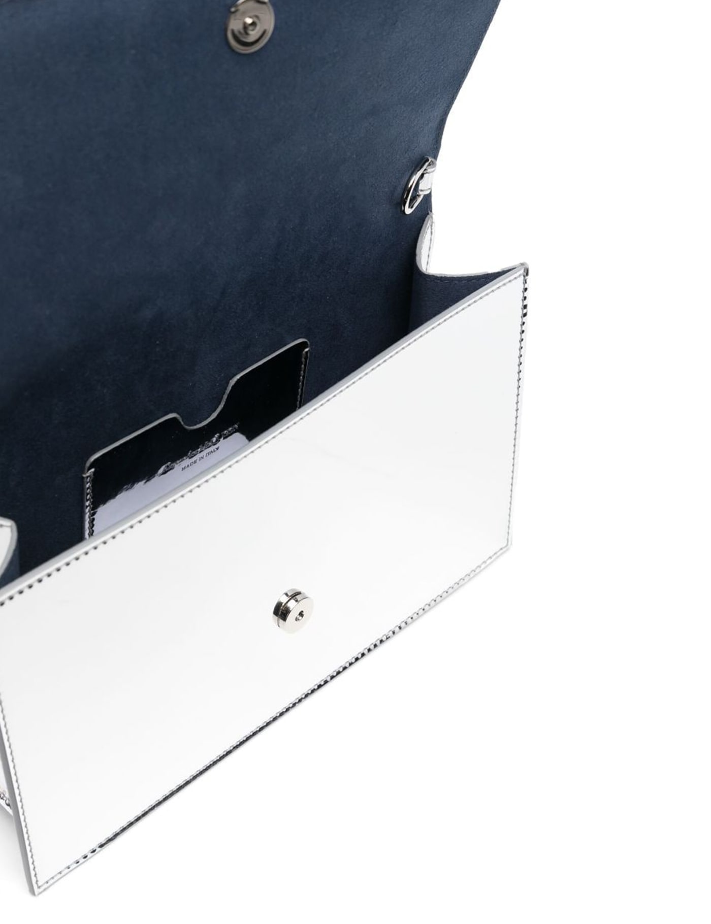 skull-appliqué metallic-effect tote bag from Alexander McQueen featuring silver-tone, metallic effect, skull appliqué, foldover top with press-stud fastening, single flat top handle, rear slit pocket, detachable chain-link shoulder strap, debossed internal logo, internal card slot and main compartment.
