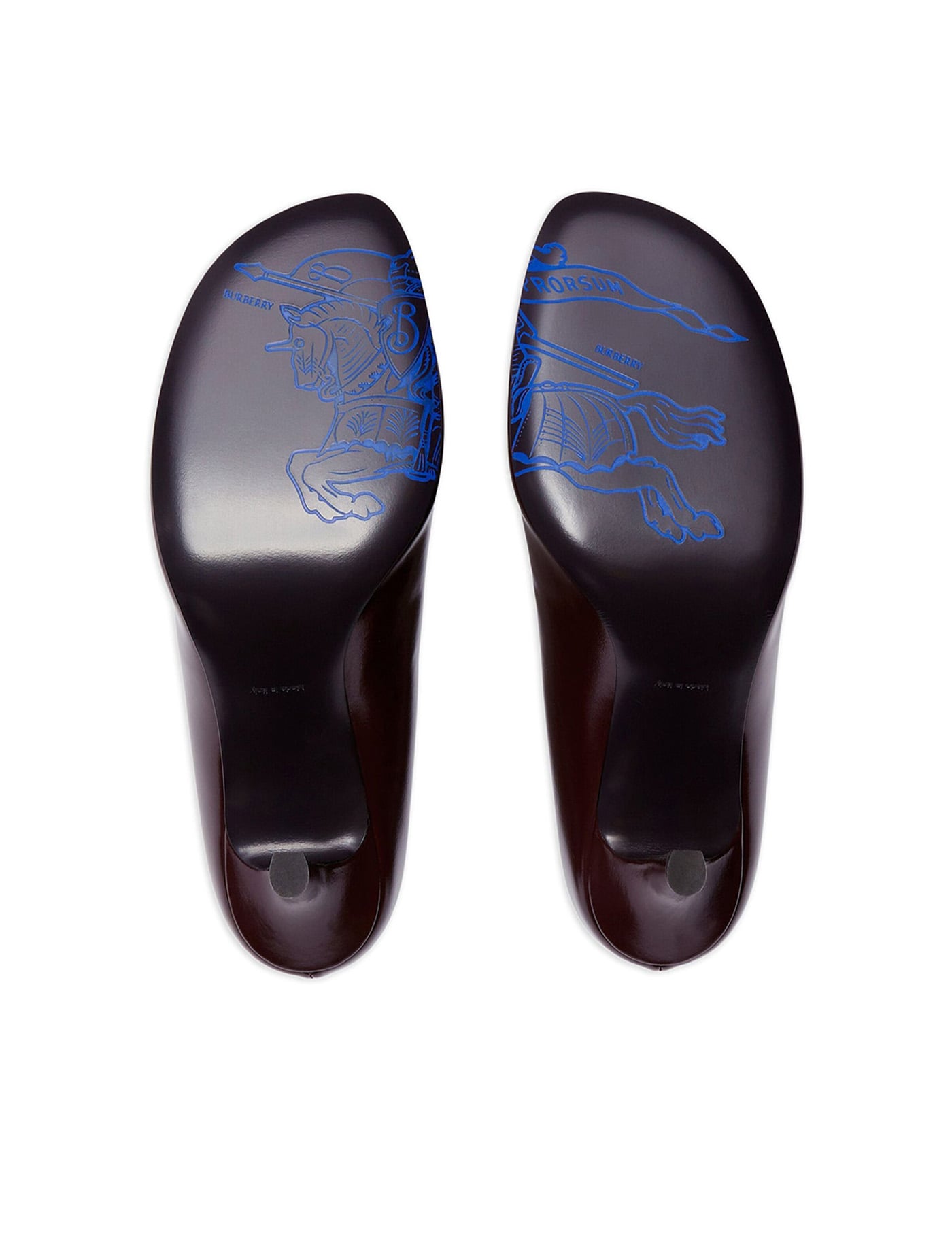 Burberry Baby pumps made of glossy leather characterized by a rounded toe and a stiletto heel. The design is decorated with a quilted and padded insole featuring the iconic Check pattern, while the leather sole is embellished with the engraved Equestrian Knight Design.