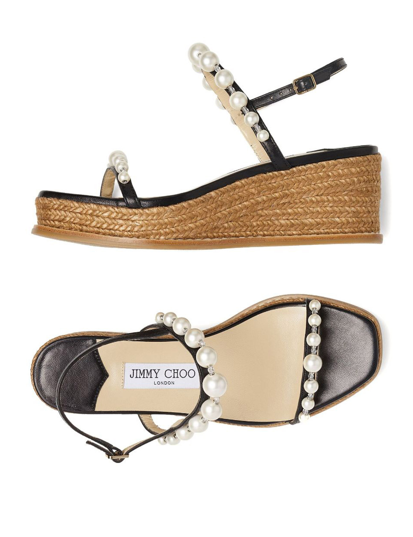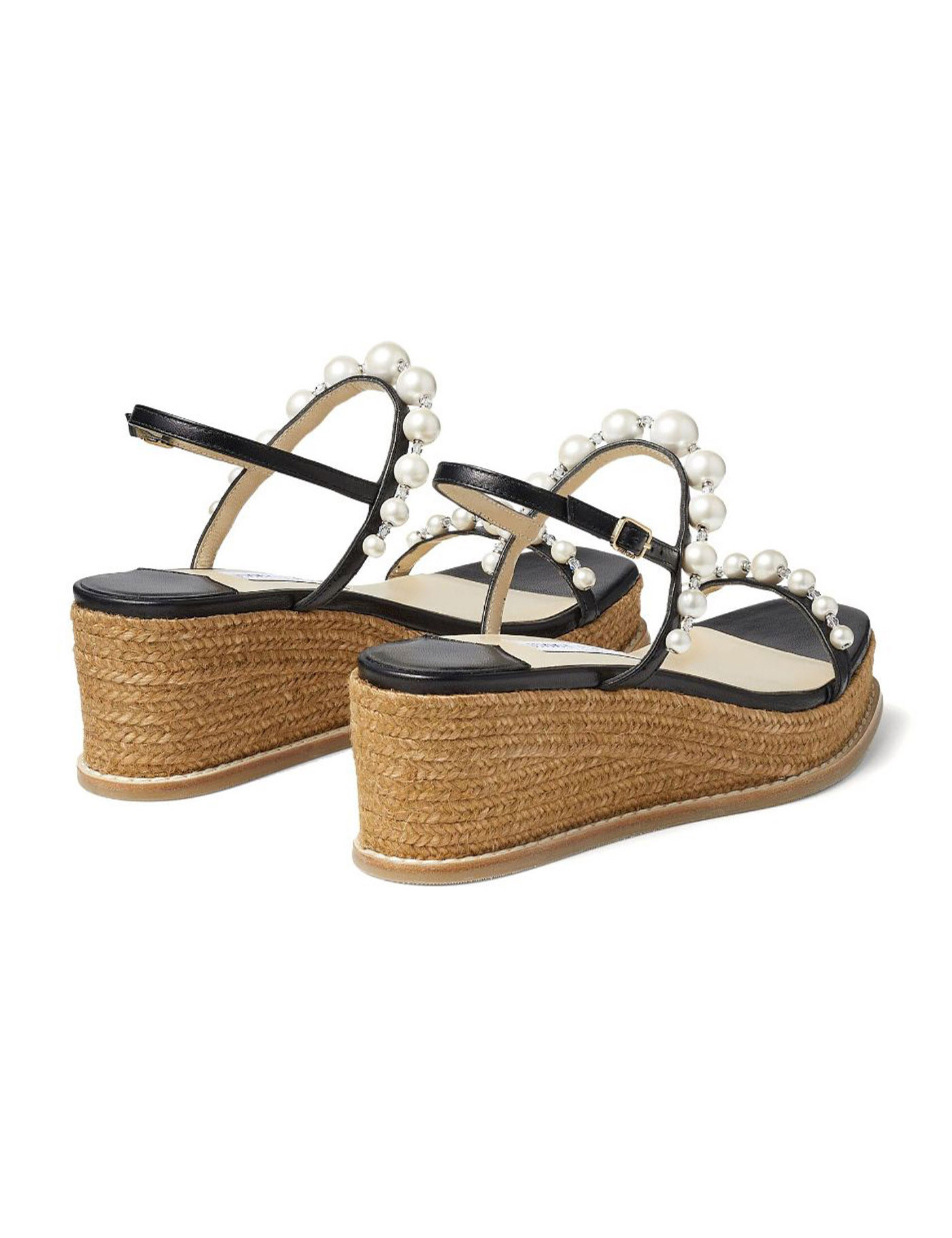 Amatuus sandals by Jimmy Choo featuring a woven rope wedge and nappa leather straps embellished with pearls and crystals. Adjustable ankle strap, leather insole and rubber tread.