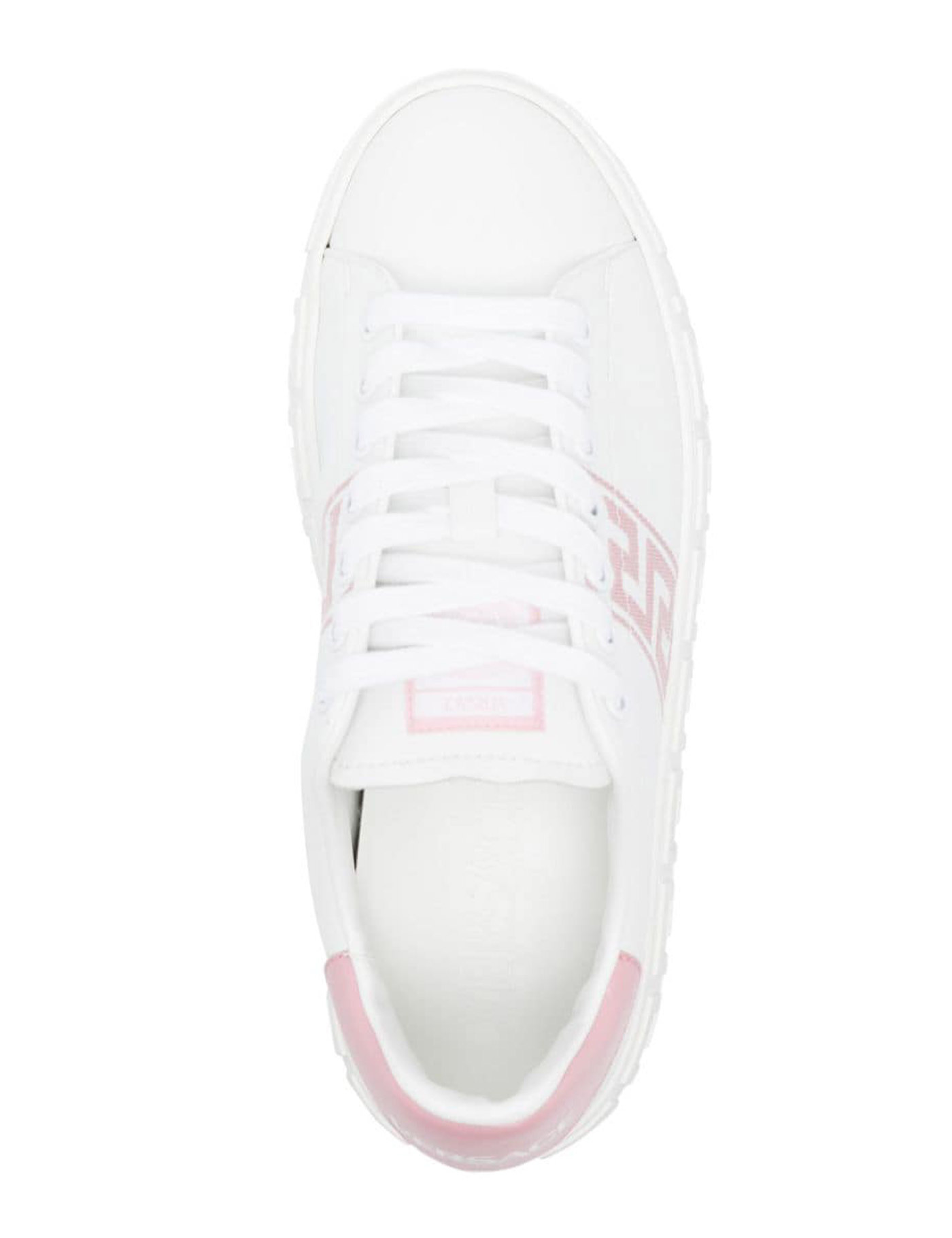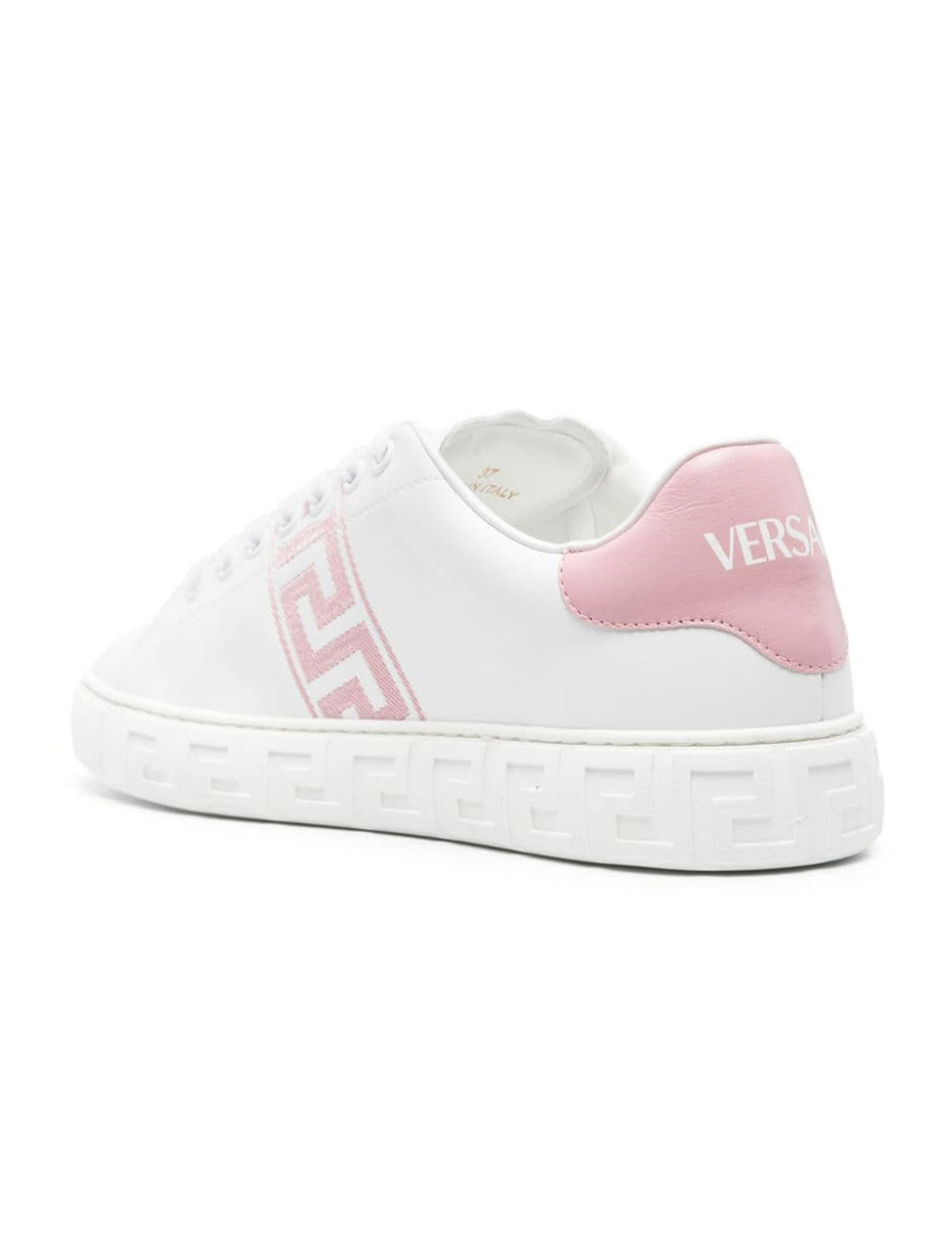 Versace’s white faux leather sneakers featuring a round toe, logo on the tongue, pink Greca motif embroidered on the side, pink faux leather heel patch with logo and rubber sole with embossed Greca motif.